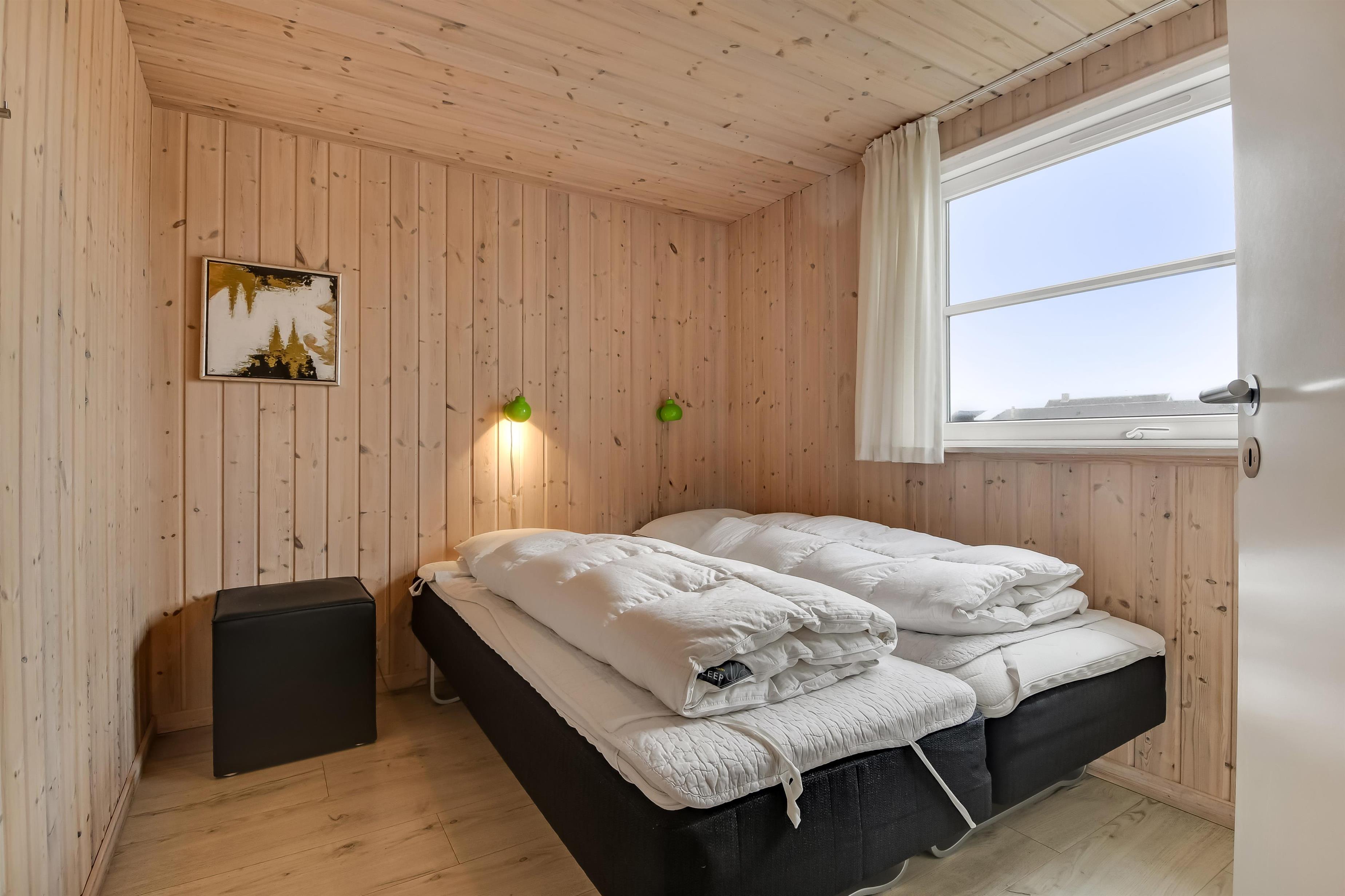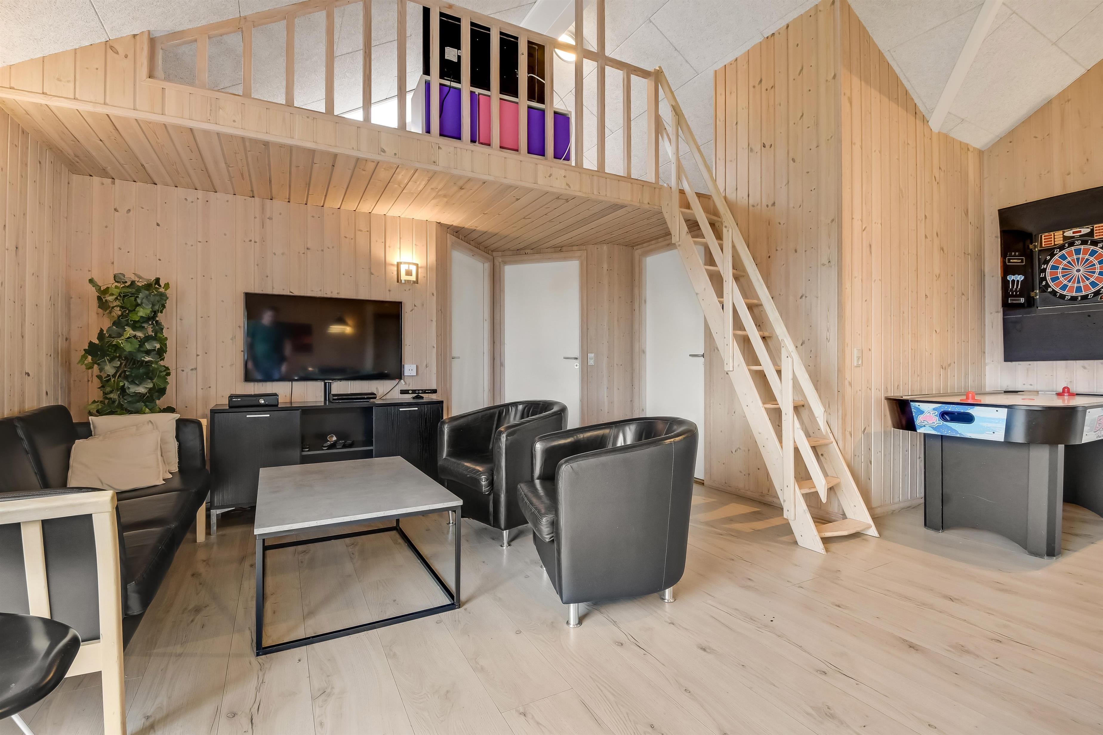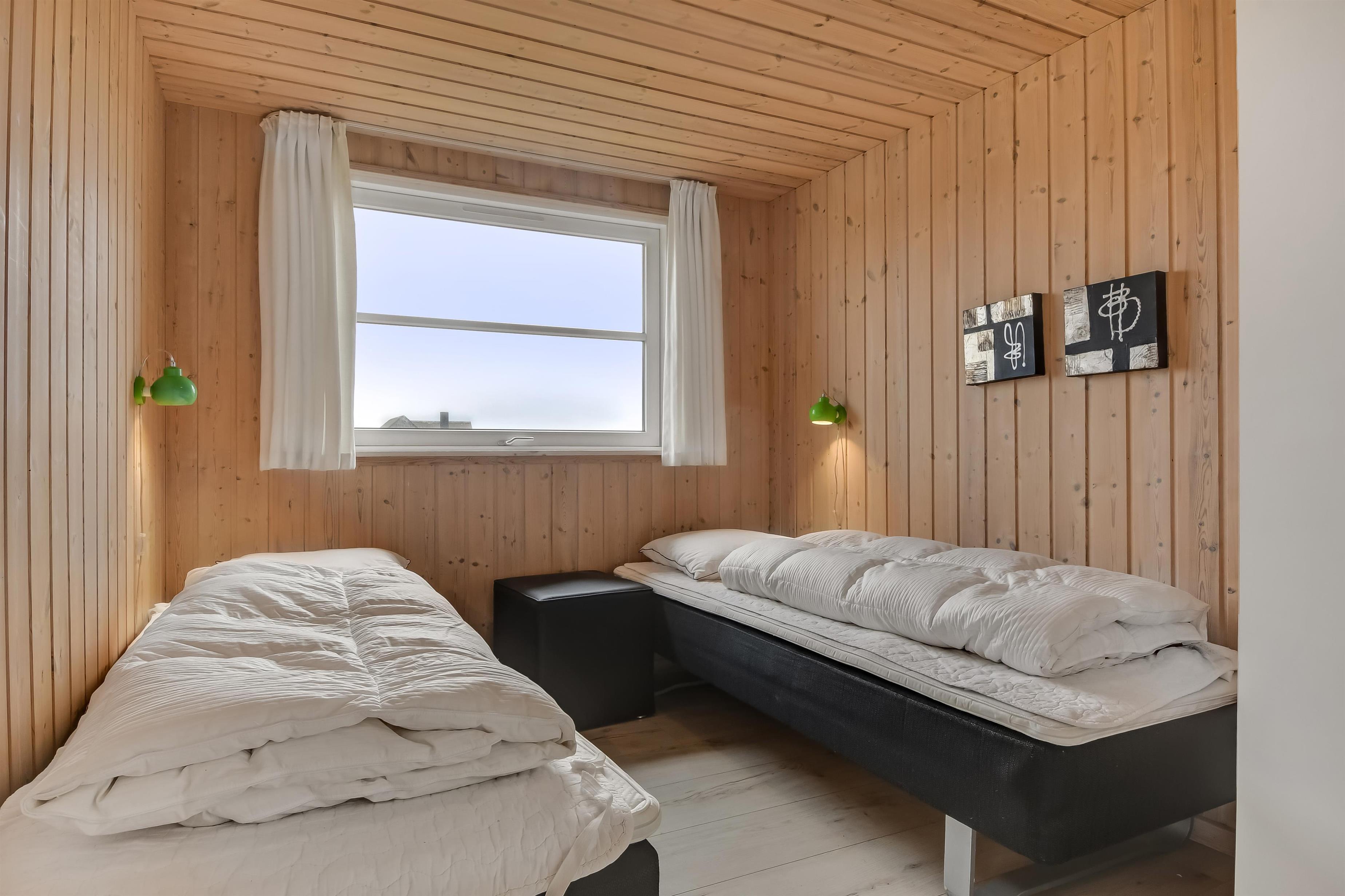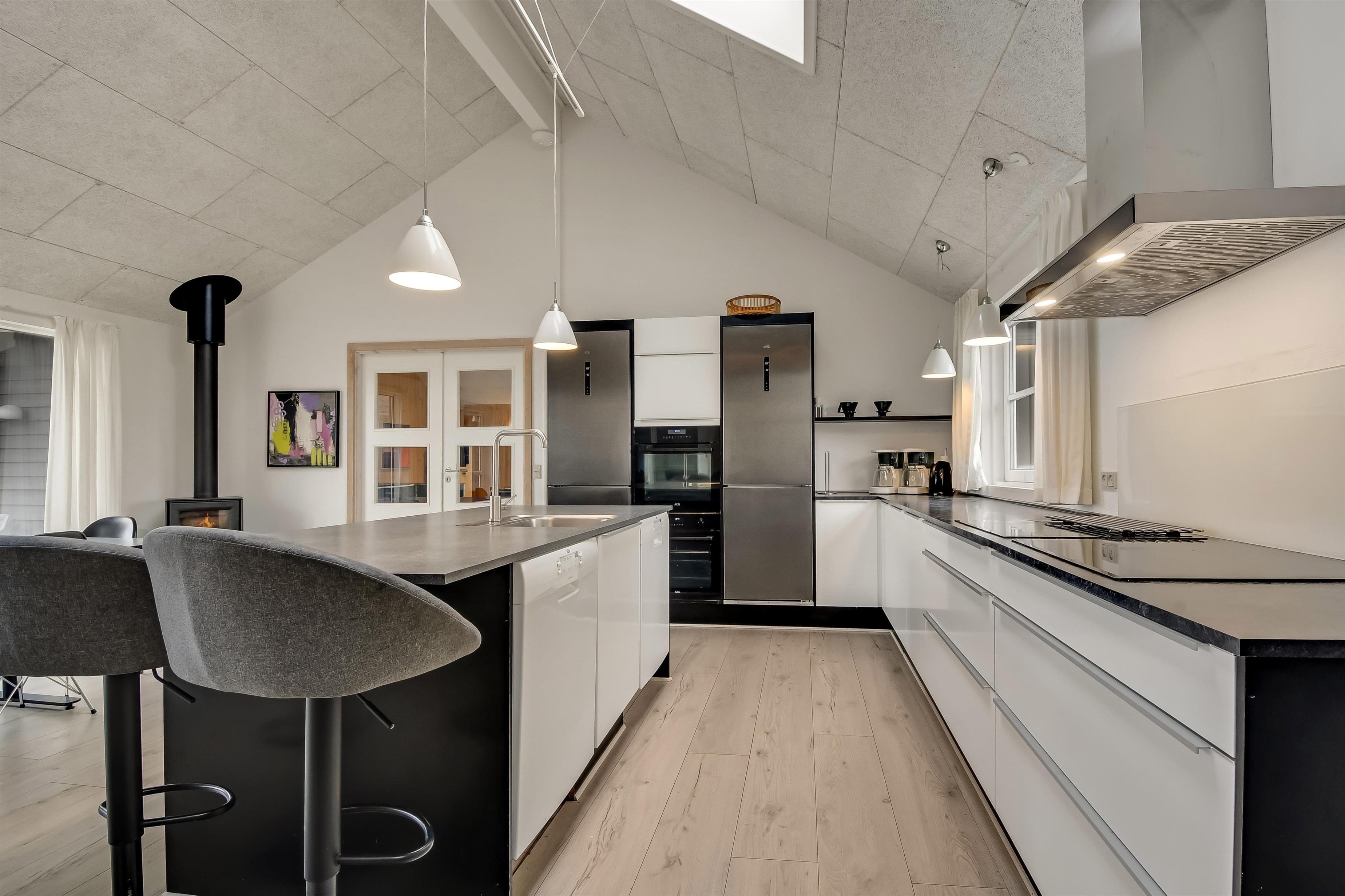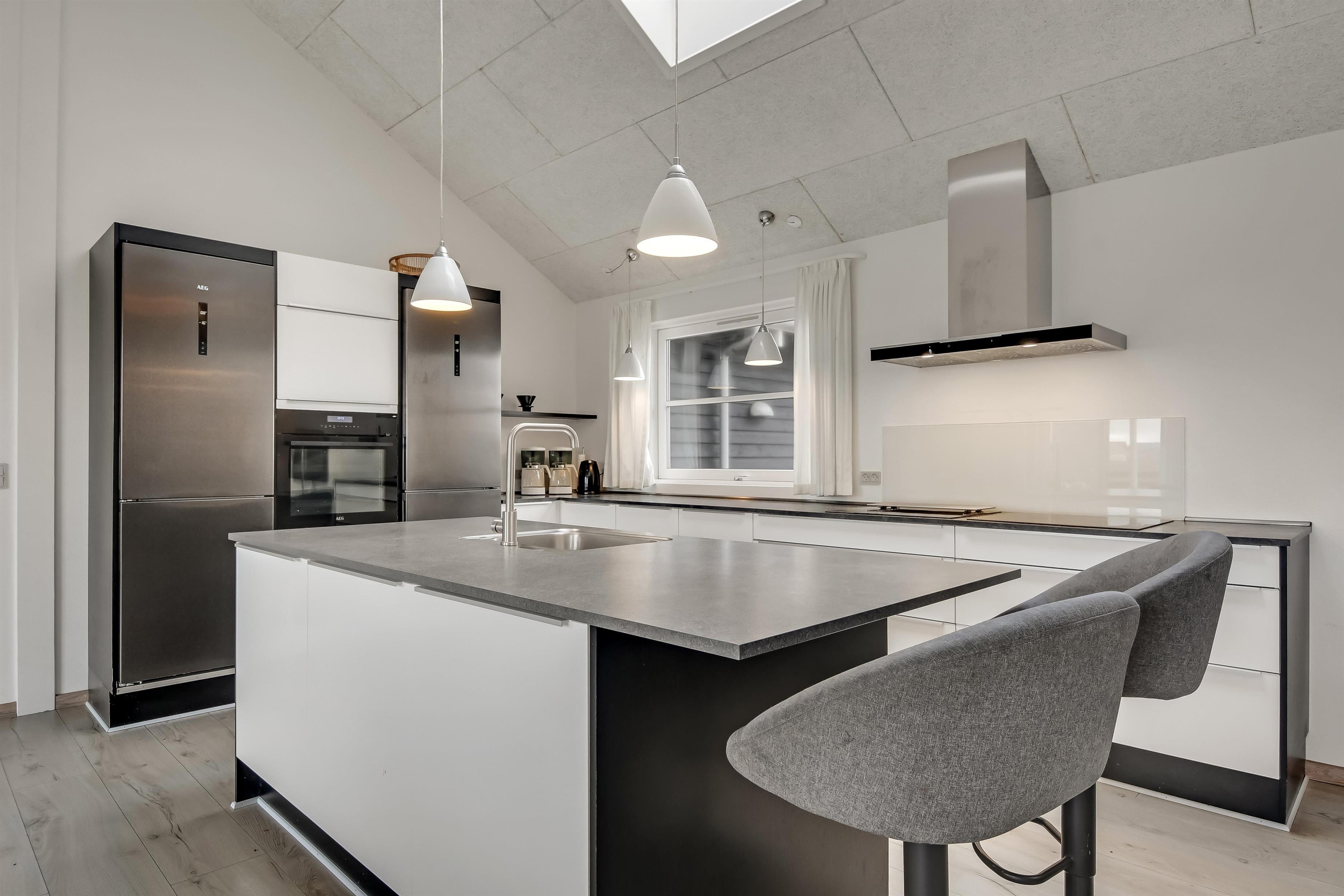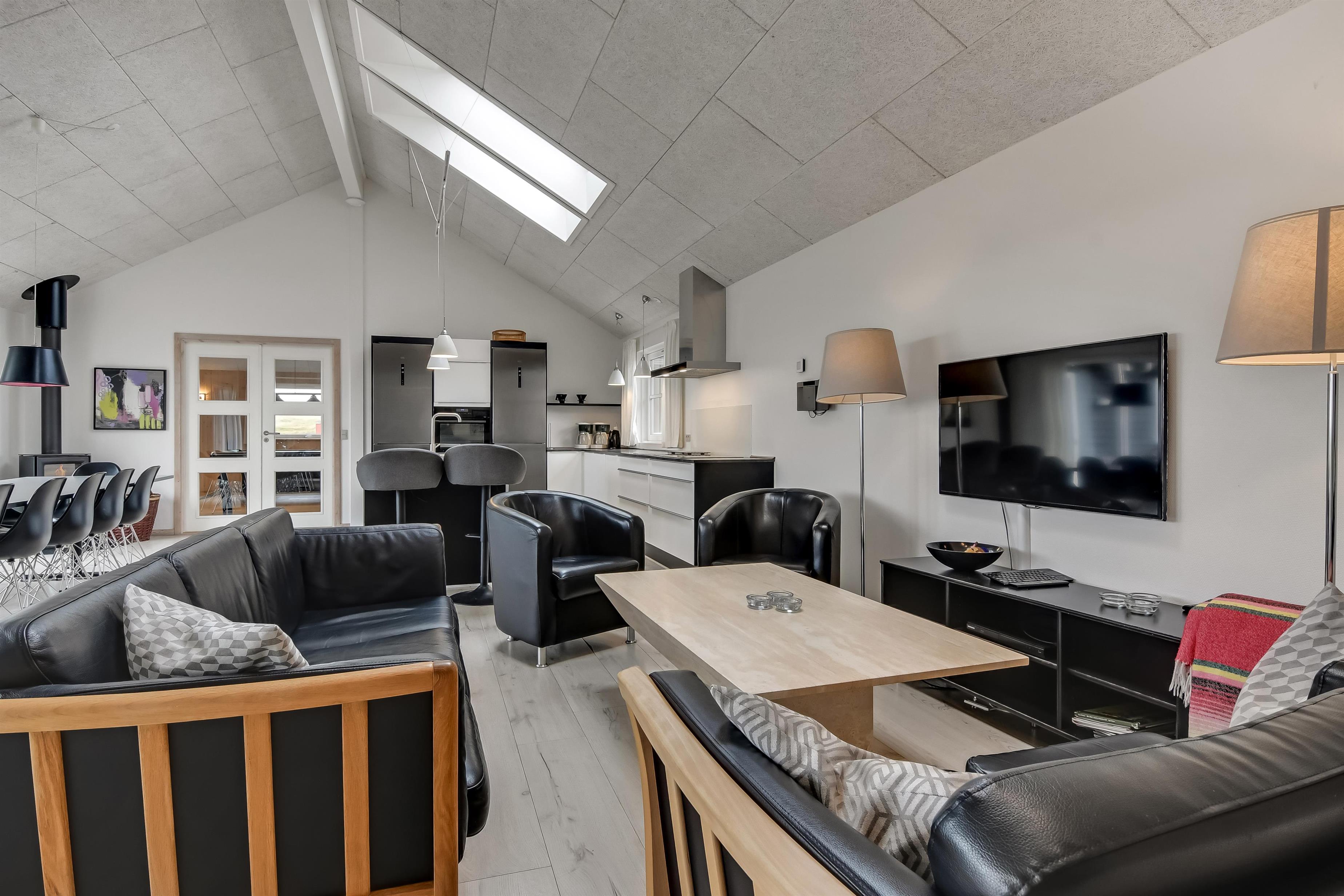 Velindrettet, nyere feriehus på 370 m2. 8 dejlige soverum (1DS, 1DS, 1DS, 1DS, 1DS, 1DS, 2 E, 2 E). Derudover forefindes 2 store hemse med hver 3 sovepladser samt en herlig legehems. Hemsene, kan ikke aflåses og voksne kan sagtens overnatte på hemsene. Huset er med et veludstyret køkken alrum med alt i hårde hvidevarer. 2 elektriske, keramiske kogeplader, 2 indbygningsovne, stor emhætte, 2 opvaskemaskiner, mikroovn, stort køleskab og separat, stor fryser (250 L). Alle 22 beboere kan samles om husets store spisebord som også er perfekt til spil og hyggesnak, og hvorfra man gennem et stor vindue har frit udsyn til husets poolafdeling. Kig til de store klitter bekræfter husets unikke beliggenhed. Slap af i de bløde kvalitetsmøbler. Se TV på dansk og tysk på et af husets 5 fjernsyn, hvor der også vil være mulighed for at afspille Blue-ray film på det ene TV. Der er klinker med gulvvarme i hele huset og trægulve i soveværelserne. Tænd op i brændeovnen som let hjælper med opvarmningen eller blot sørger for en hyggelig stemning.