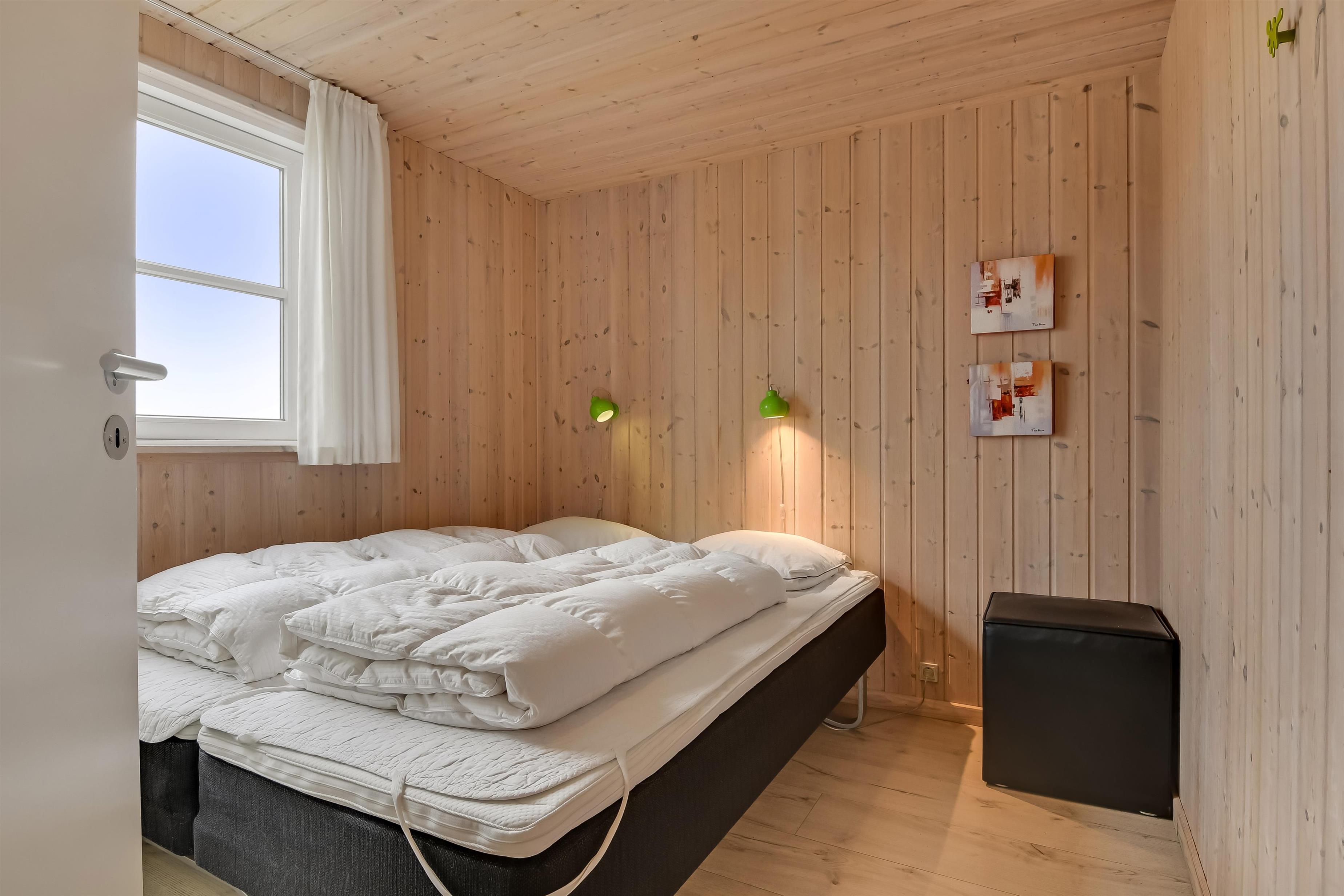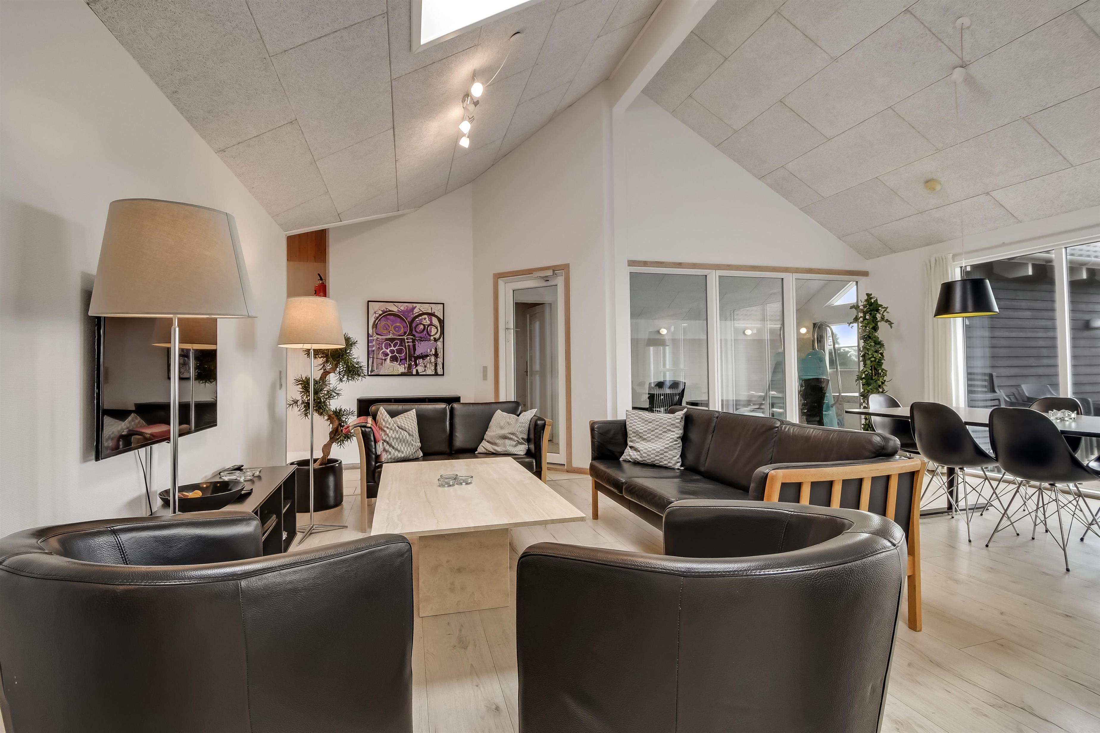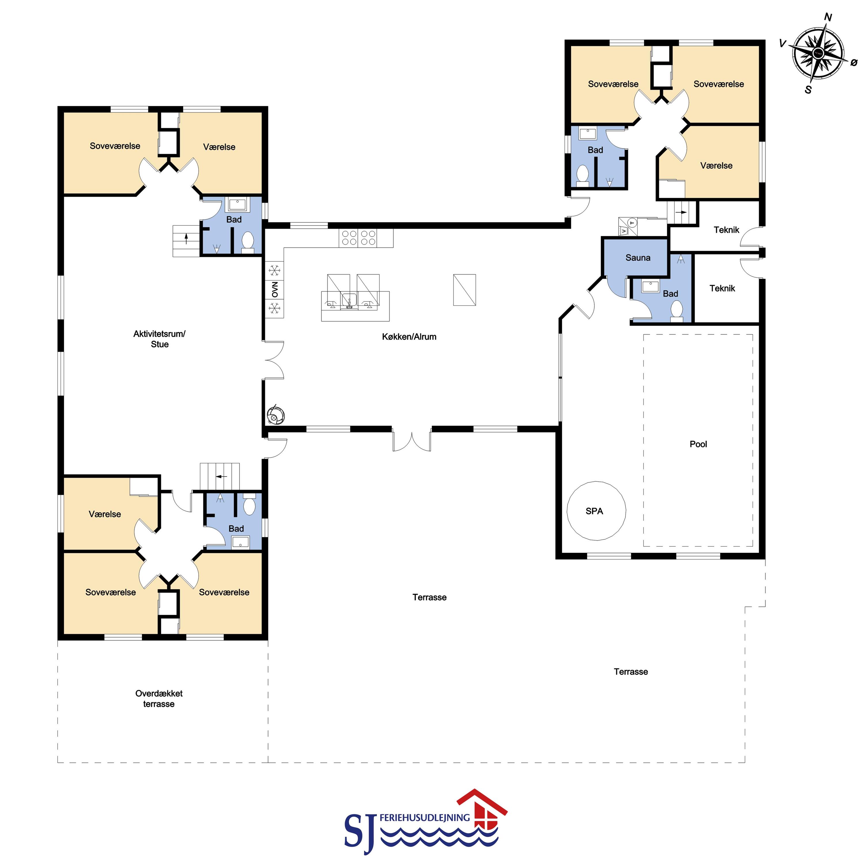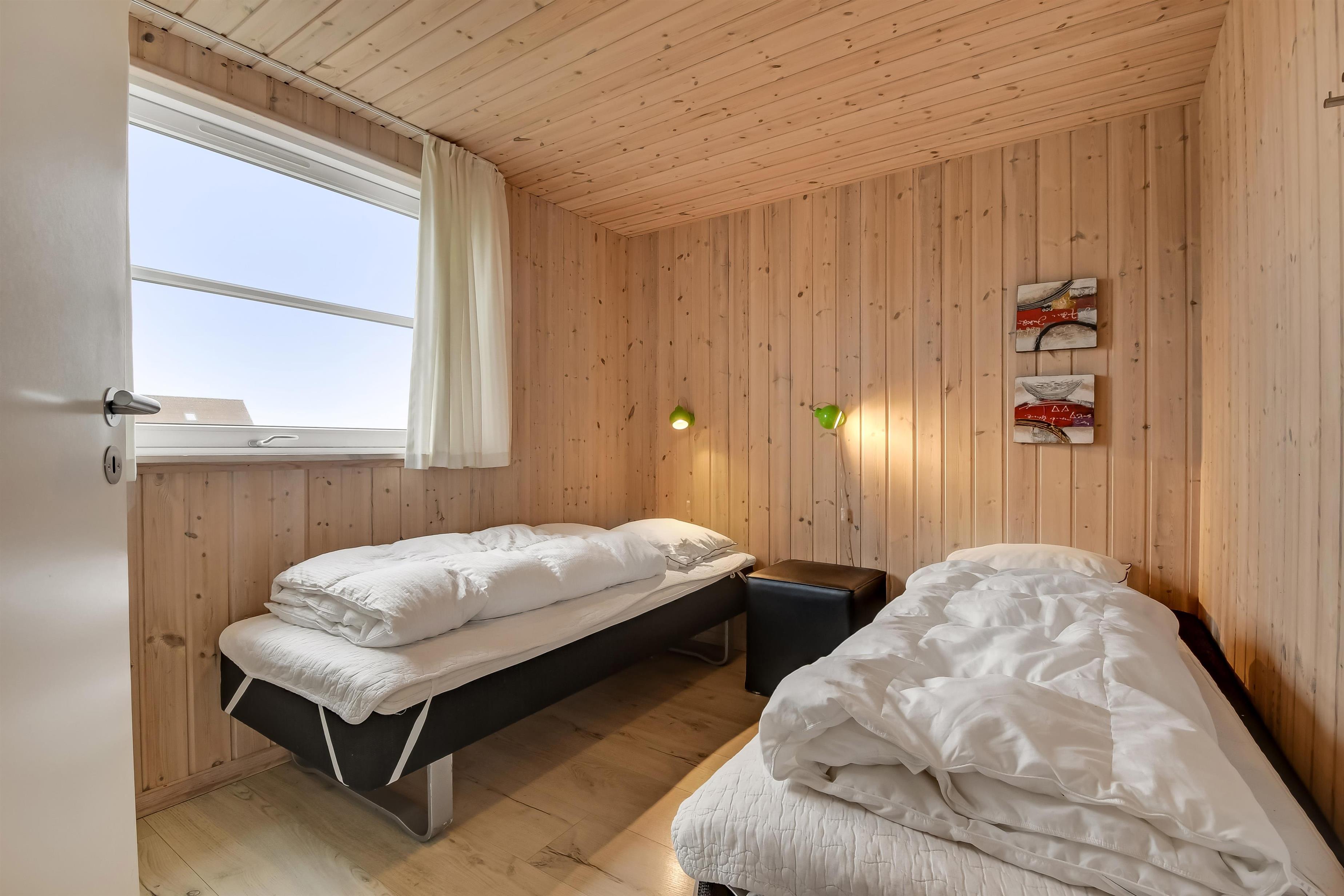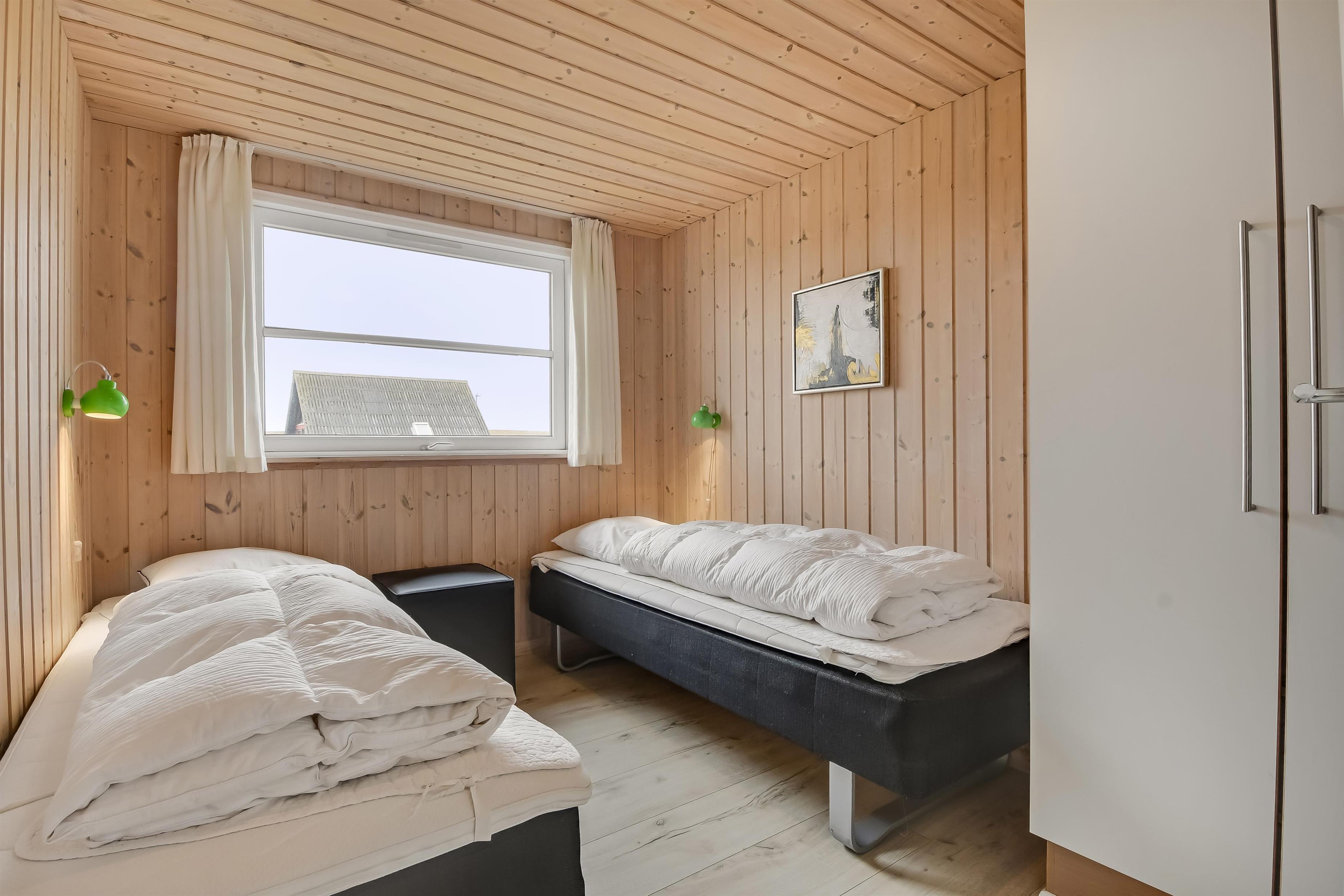 Velindrettet, nyere feriehus på 370 m2. 8 dejlige soverum (1DS, 1DS, 1DS, 1DS, 1DS, 1DS, 2 E, 2 E). Derudover forefindes 2 store hemse med hver 3 sovepladser samt en herlig legehems. Hemsene, kan ikke aflåses og voksne kan sagtens overnatte på hemsene. Huset er med et veludstyret køkken alrum med alt i hårde hvidevarer. 2 elektriske, keramiske kogeplader, 2 indbygningsovne, stor emhætte, 2 opvaskemaskiner, mikroovn, stort køleskab og separat, stor fryser (250 L). Alle 22 beboere kan samles om husets store spisebord som også er perfekt til spil og hyggesnak, og hvorfra man gennem et stor vindue har frit udsyn til husets poolafdeling. Kig til de store klitter bekræfter husets unikke beliggenhed. Slap af i de bløde kvalitetsmøbler. Se TV på dansk og tysk på et af husets 5 fjernsyn, hvor der også vil være mulighed for at afspille Blue-ray film på det ene TV. Der er klinker med gulvvarme i hele huset og trægulve i soveværelserne. Tænd op i brændeovnen som let hjælper med opvarmningen eller blot sørger for en hyggelig stemning.