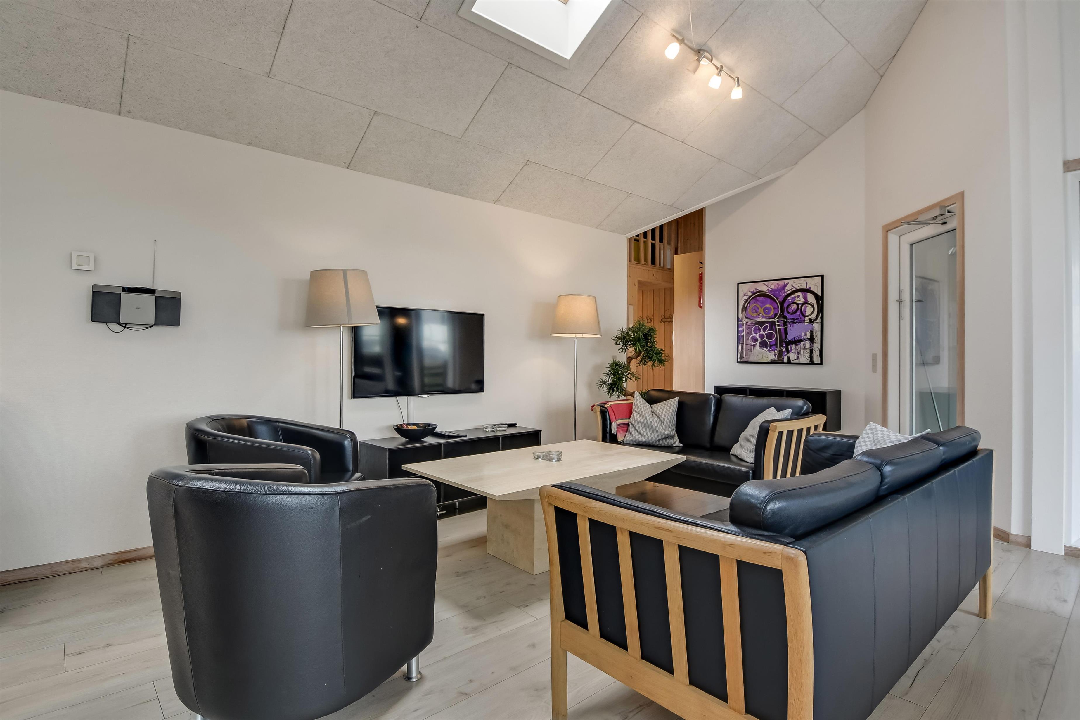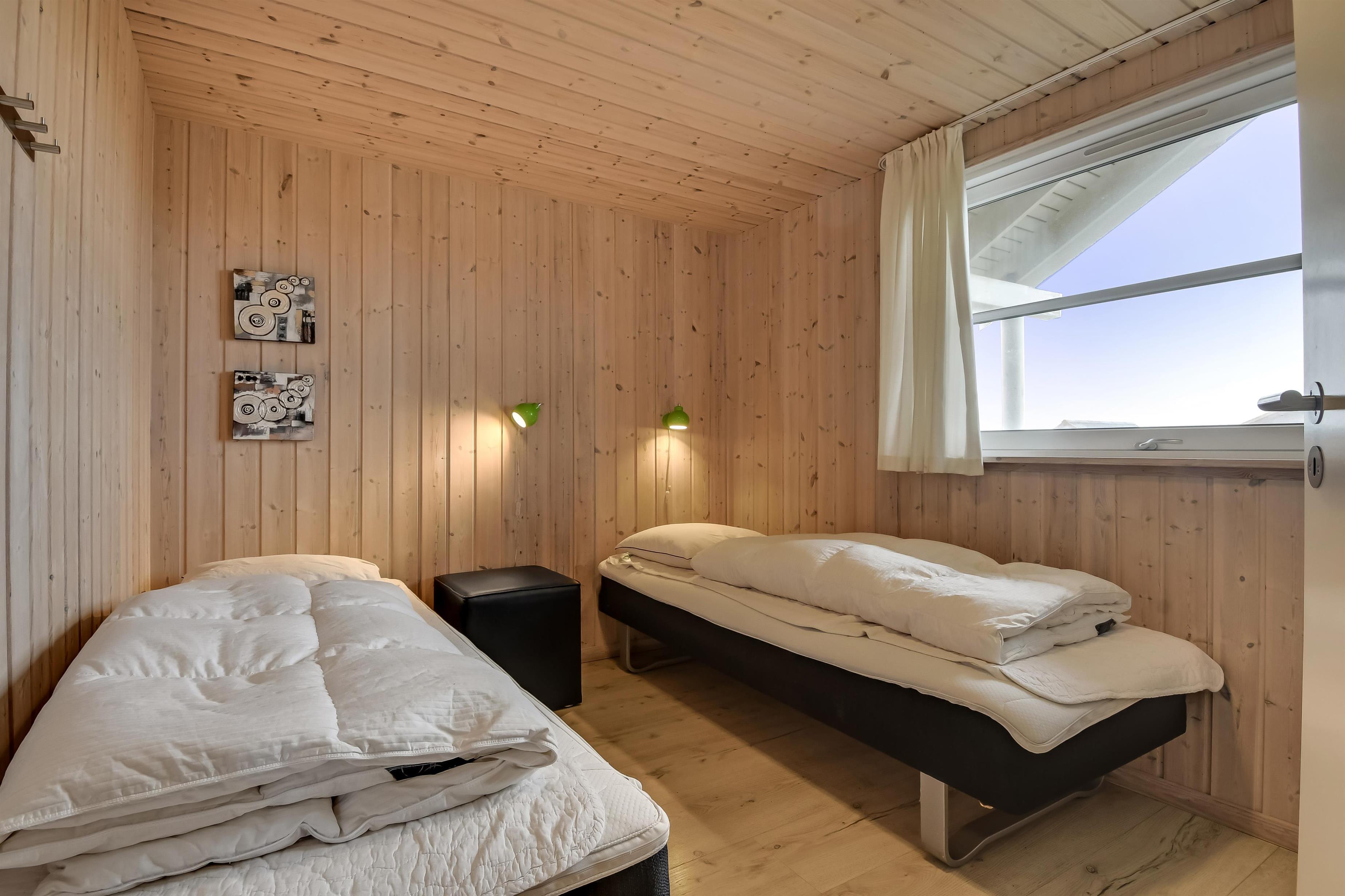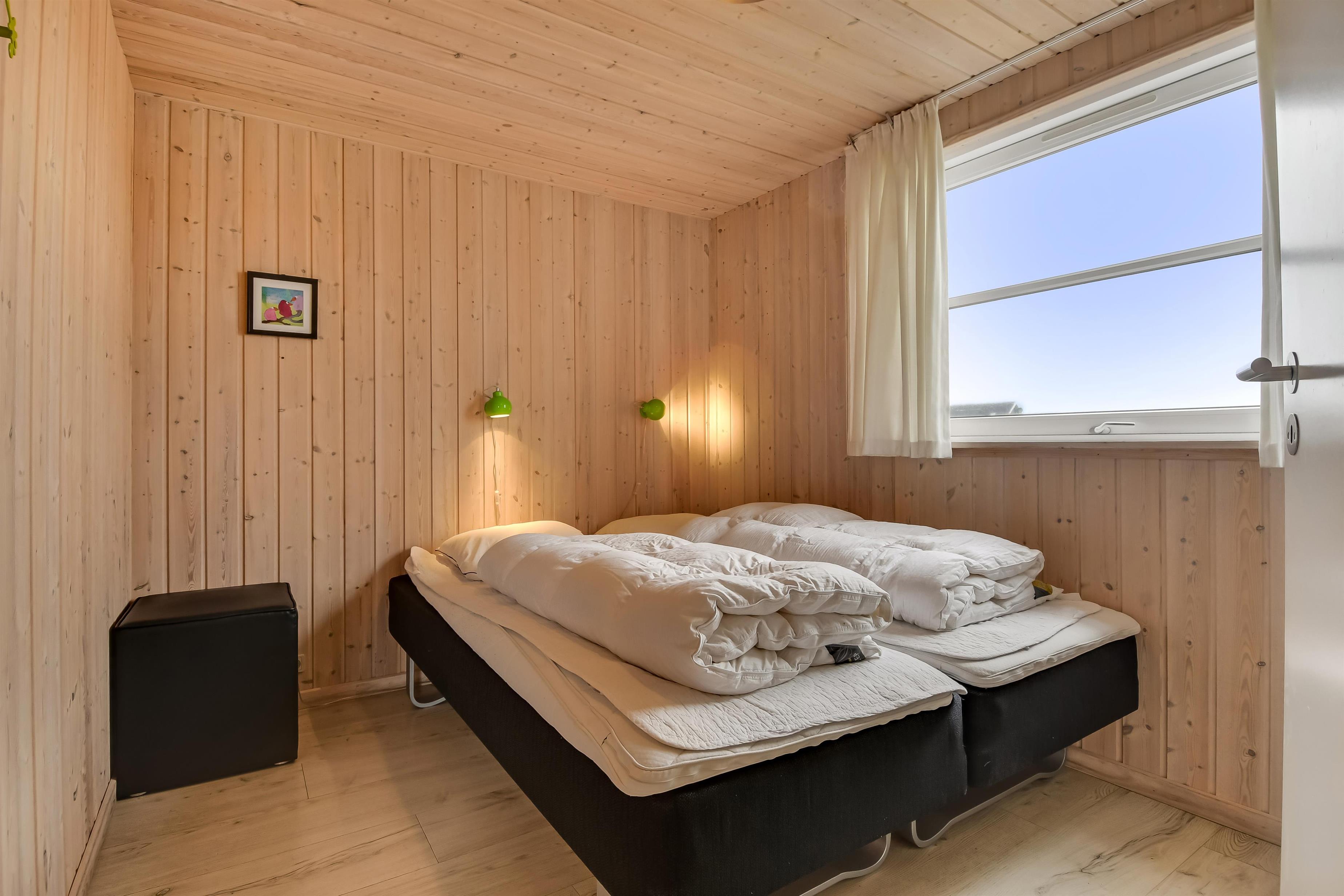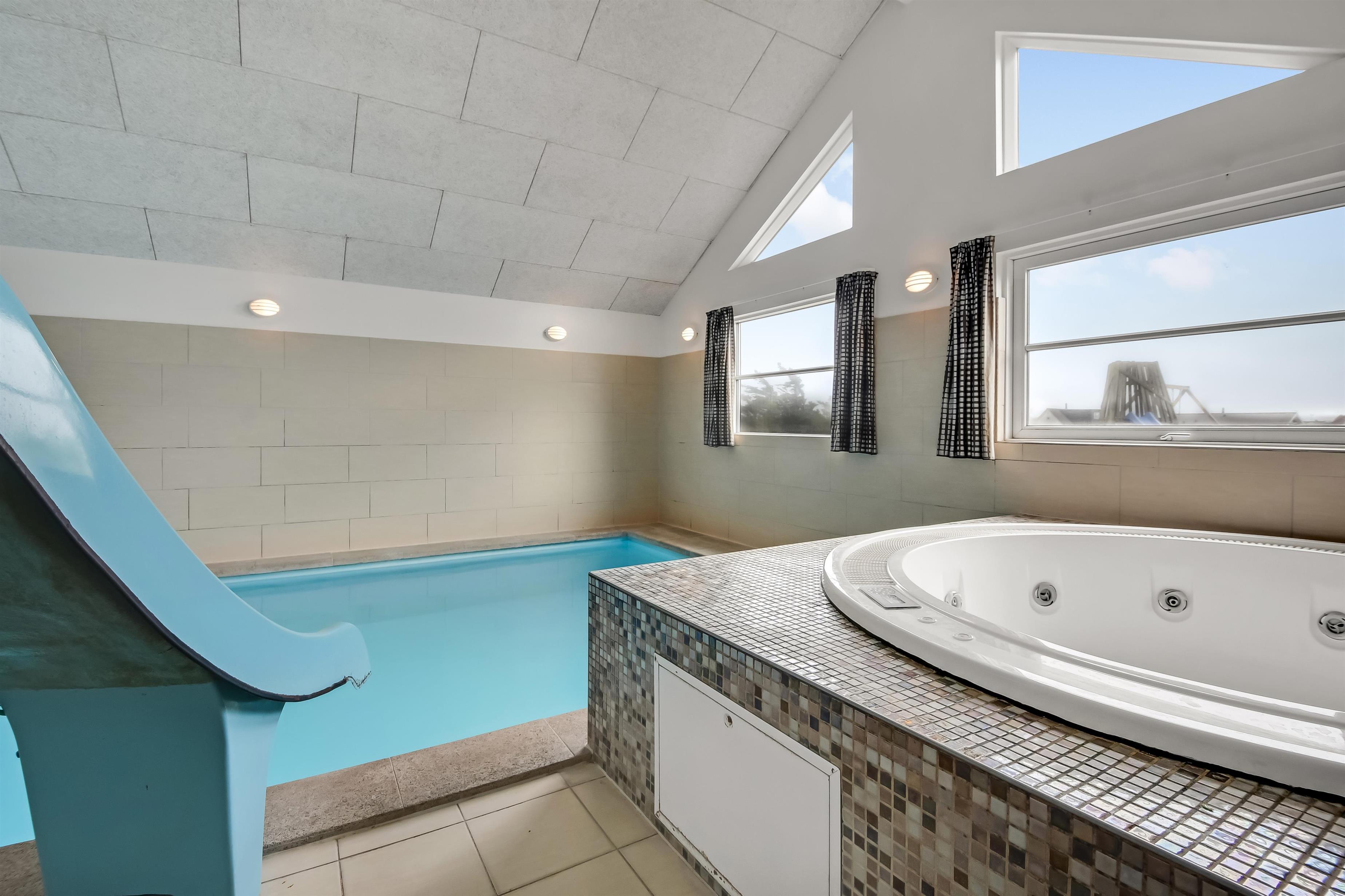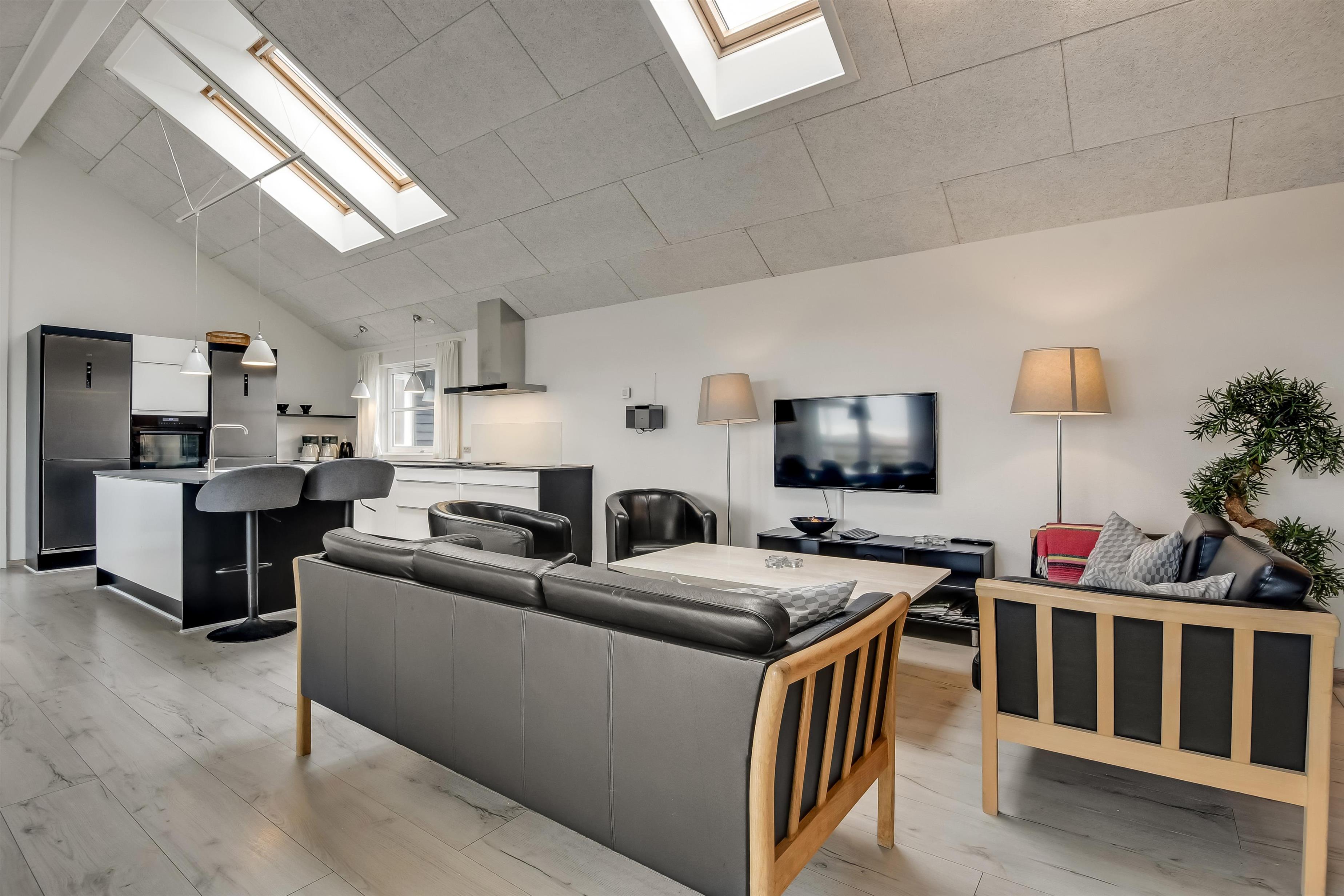 Velindrettet, nyere feriehus på 370 m2. 8 dejlige soverum (1DS, 1DS, 1DS, 1DS, 1DS, 1DS, 2 E, 2 E). Derudover forefindes 2 store hemse med hver 3 sovepladser samt en herlig legehems. Hemsene, kan ikke aflåses og voksne kan sagtens overnatte på hemsene. Huset er med et veludstyret køkken alrum med alt i hårde hvidevarer. 2 elektriske, keramiske kogeplader, 2 indbygningsovne, stor emhætte, 2 opvaskemaskiner, mikroovn, stort køleskab og separat, stor fryser (250 L). Alle 22 beboere kan samles om husets store spisebord som også er perfekt til spil og hyggesnak, og hvorfra man gennem et stor vindue har frit udsyn til husets poolafdeling. Kig til de store klitter bekræfter husets unikke beliggenhed. Slap af i de bløde kvalitetsmøbler. Se TV på dansk og tysk på et af husets 5 fjernsyn, hvor der også vil være mulighed for at afspille Blue-ray film på det ene TV. Der er klinker med gulvvarme i hele huset og trægulve i soveværelserne. Tænd op i brændeovnen som let hjælper med opvarmningen eller blot sørger for en hyggelig stemning.