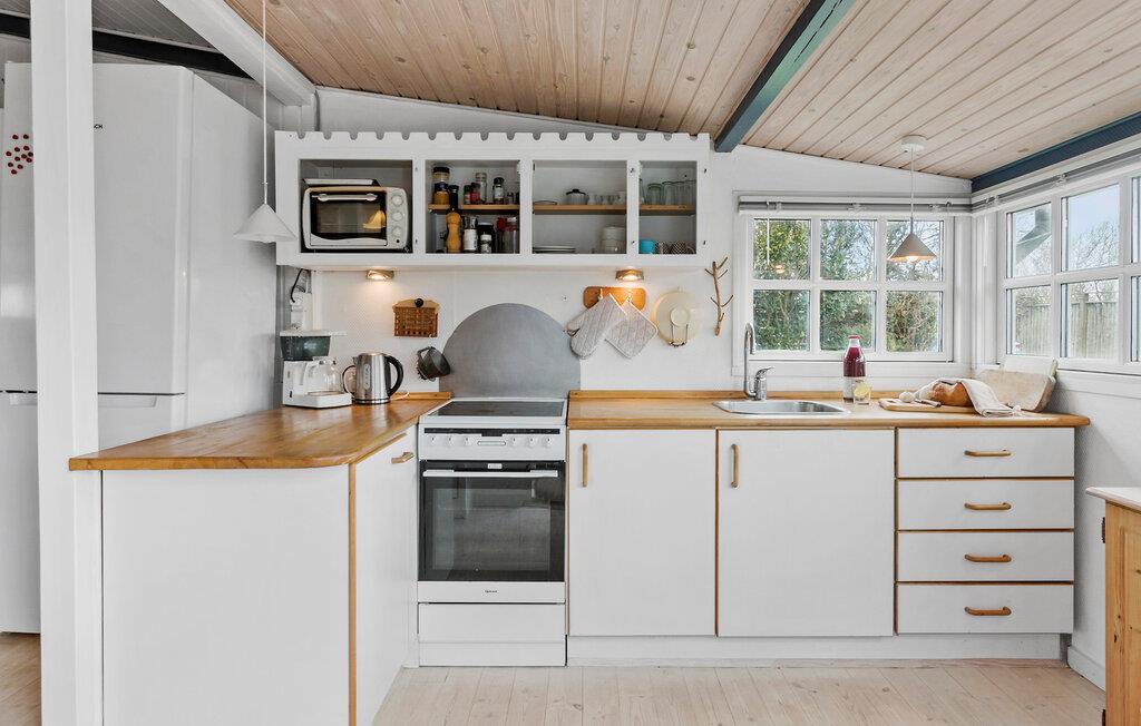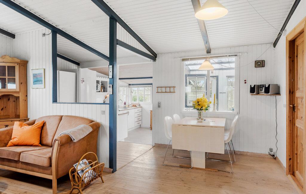 Charmerende familiehus ved Langholm Strand med åben planløsning, brændeovn og tæt på stranden.