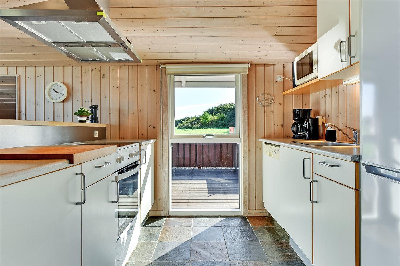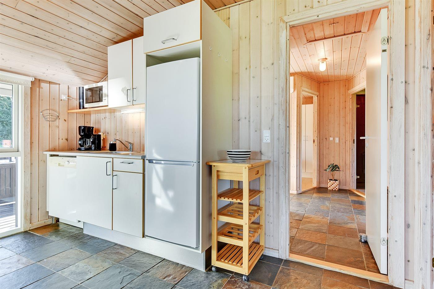 Køkkenet er udstyret med 1 køleskab. Der er 4 keramiske kogeplader, varmluftovn, mikrobølgeovn samt opvaskemaskine.