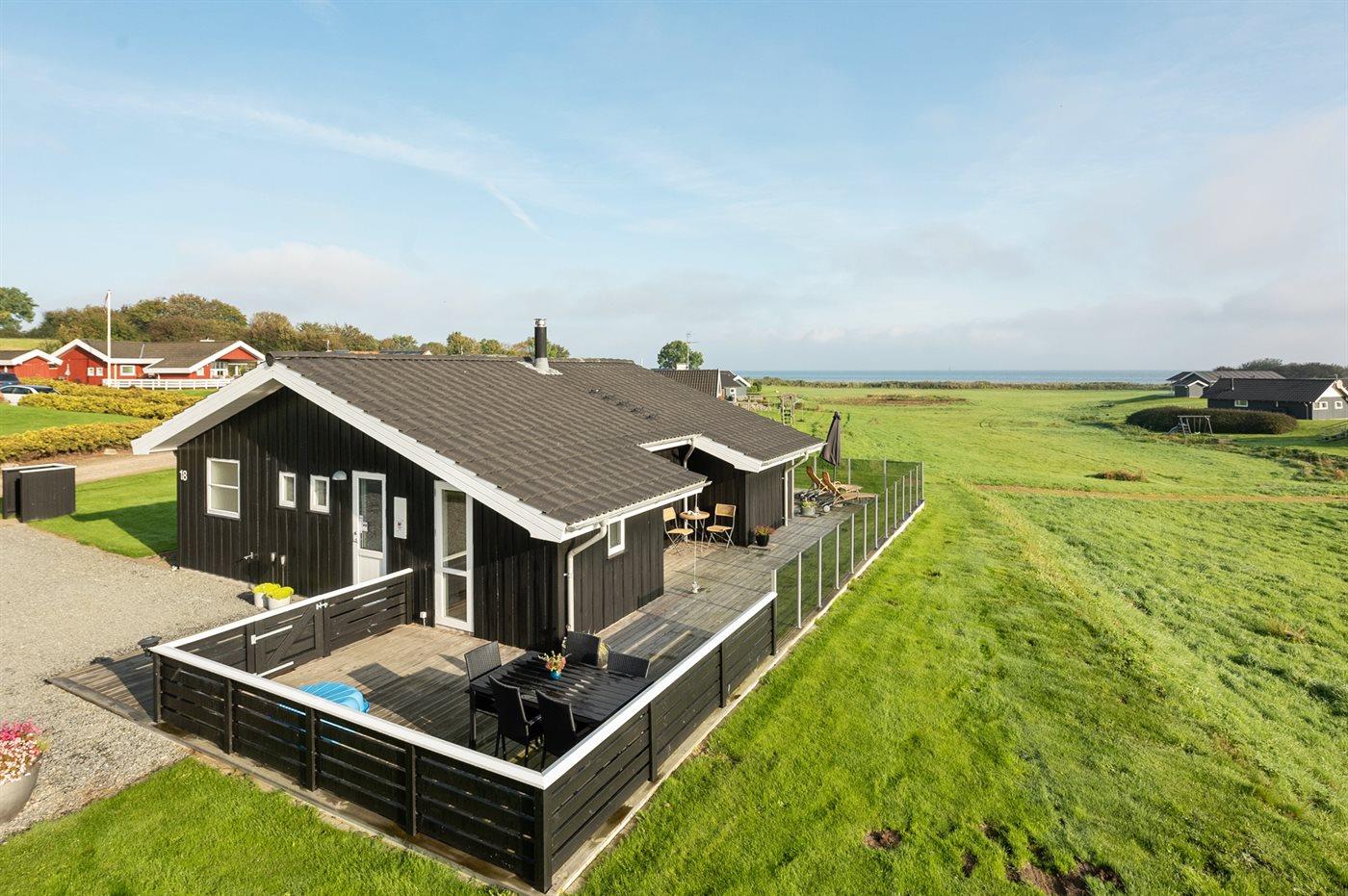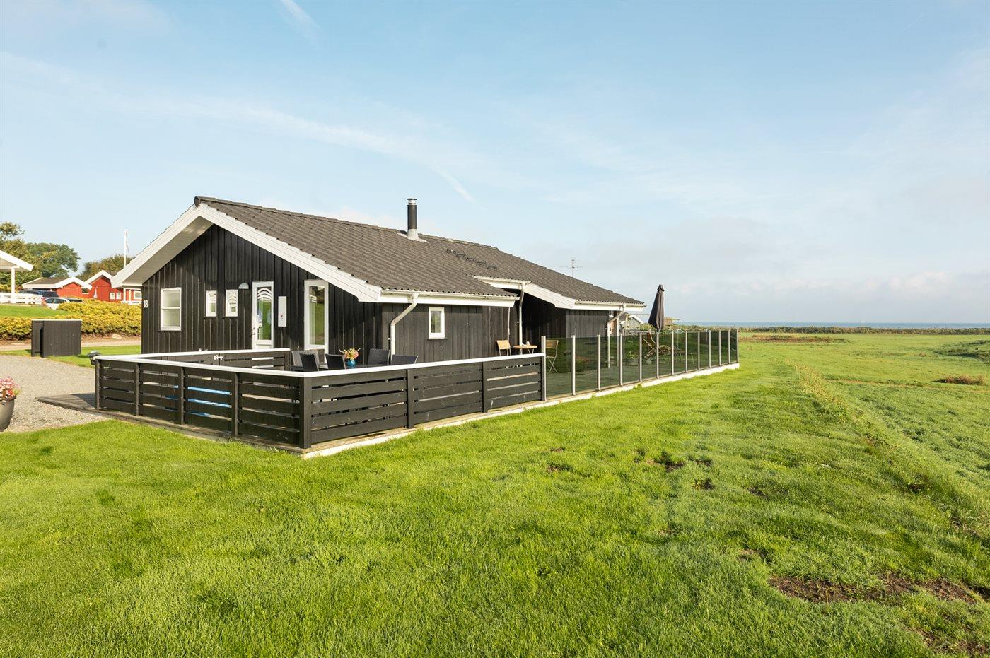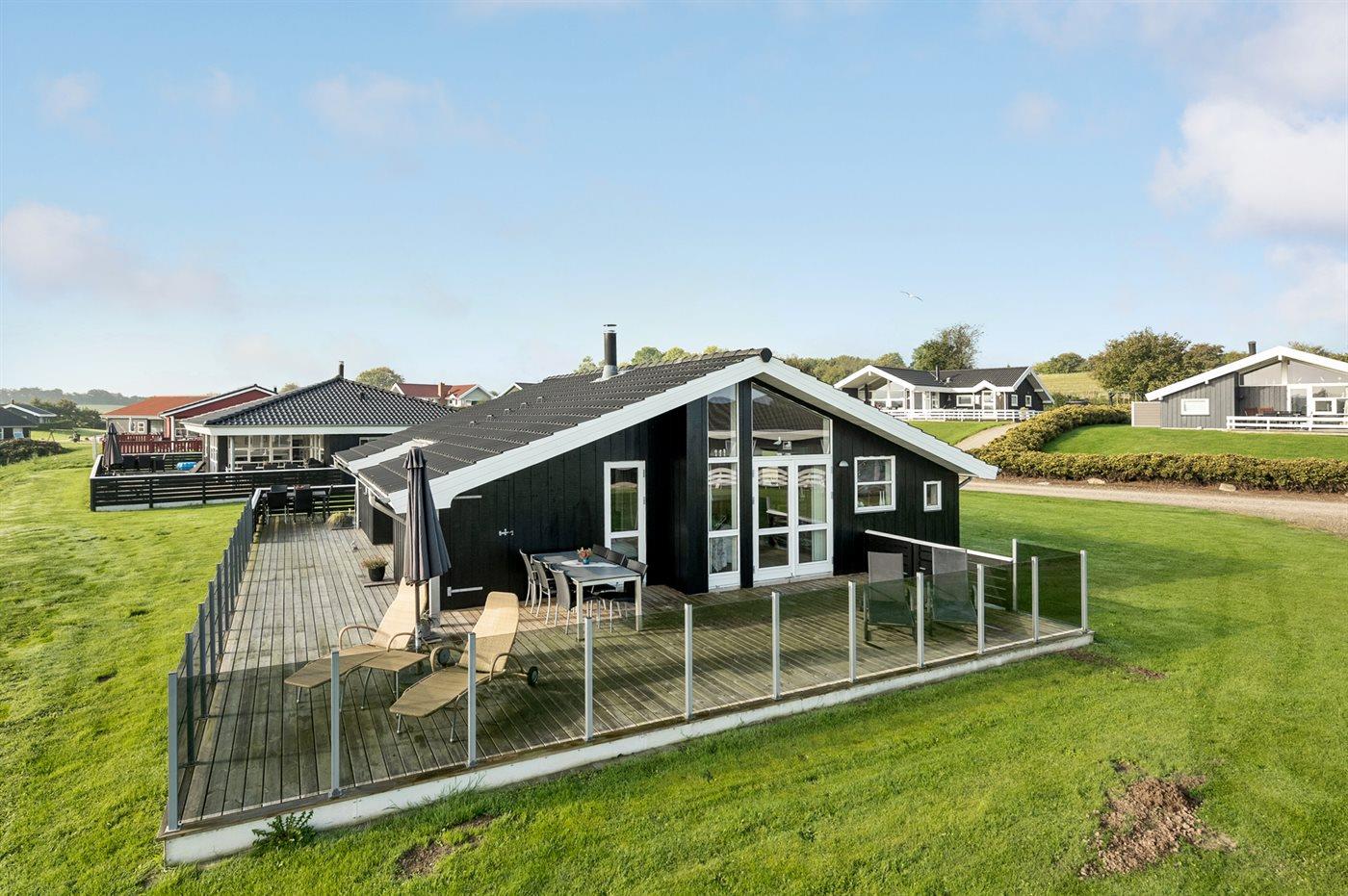 Et dejligt beliggende sommerhus - tæt på strand og vand med udsigt over havet fra såvel hus som grund. Der findes fælles legetårn med nabohuset.