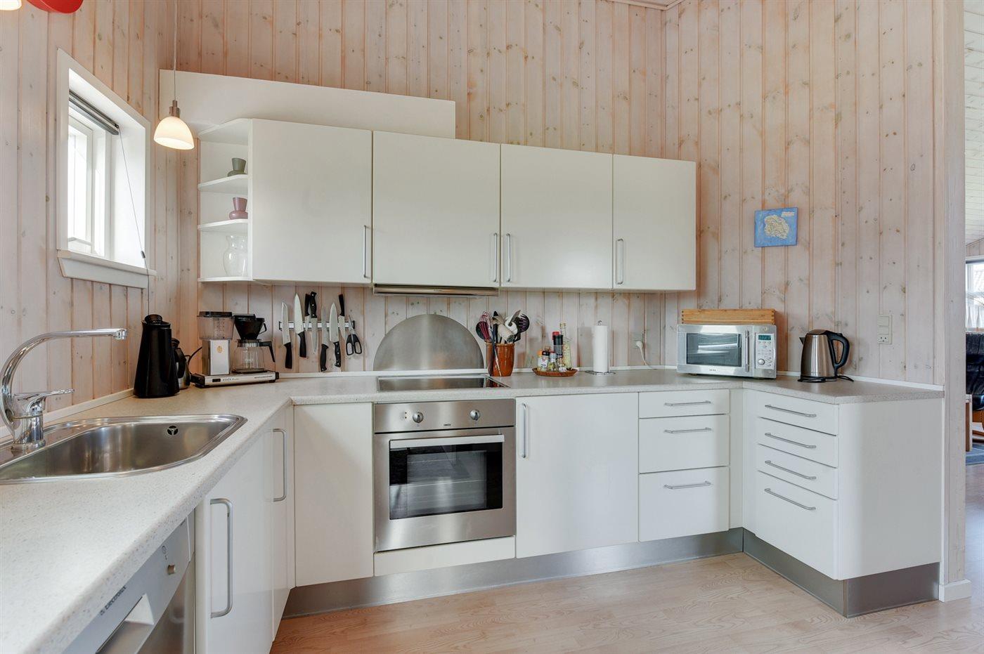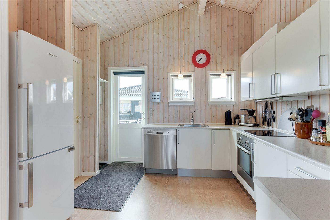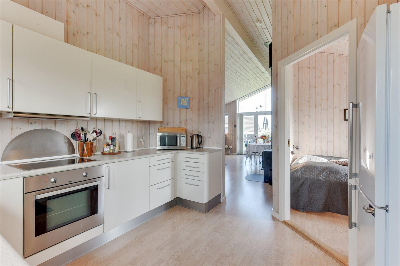 Køkkenet er udstyret med 1 køleskab. Der er 4 keramiske kogeplader, varmluftovn, mikrobølgeovn samt opvaskemaskine.