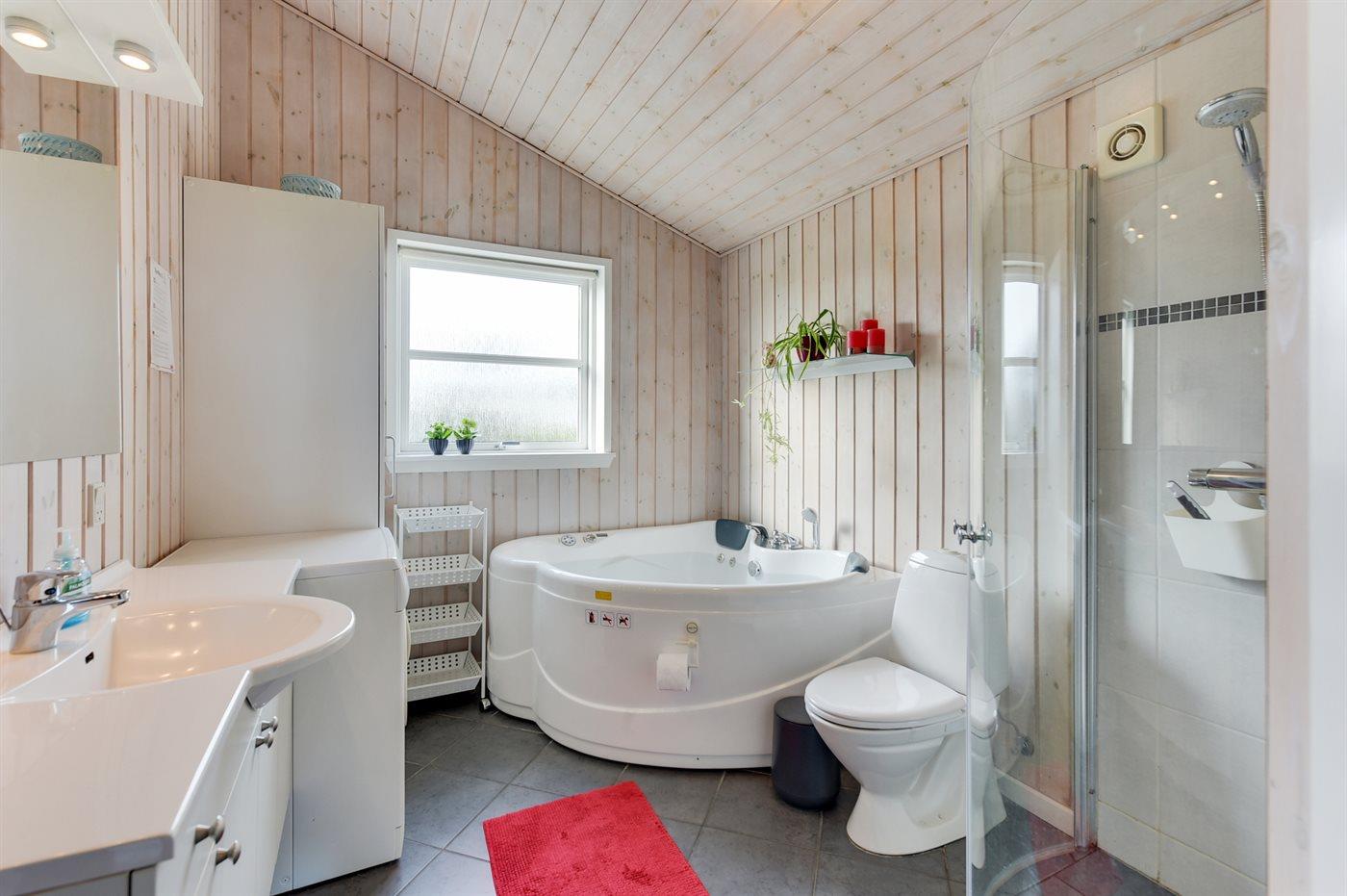 Der er 1 badeværelse med bruseniche og 1 toilet.. Der er gulvvarme på 1 badeværelse. I saunaen er der mulighed for afslapning.