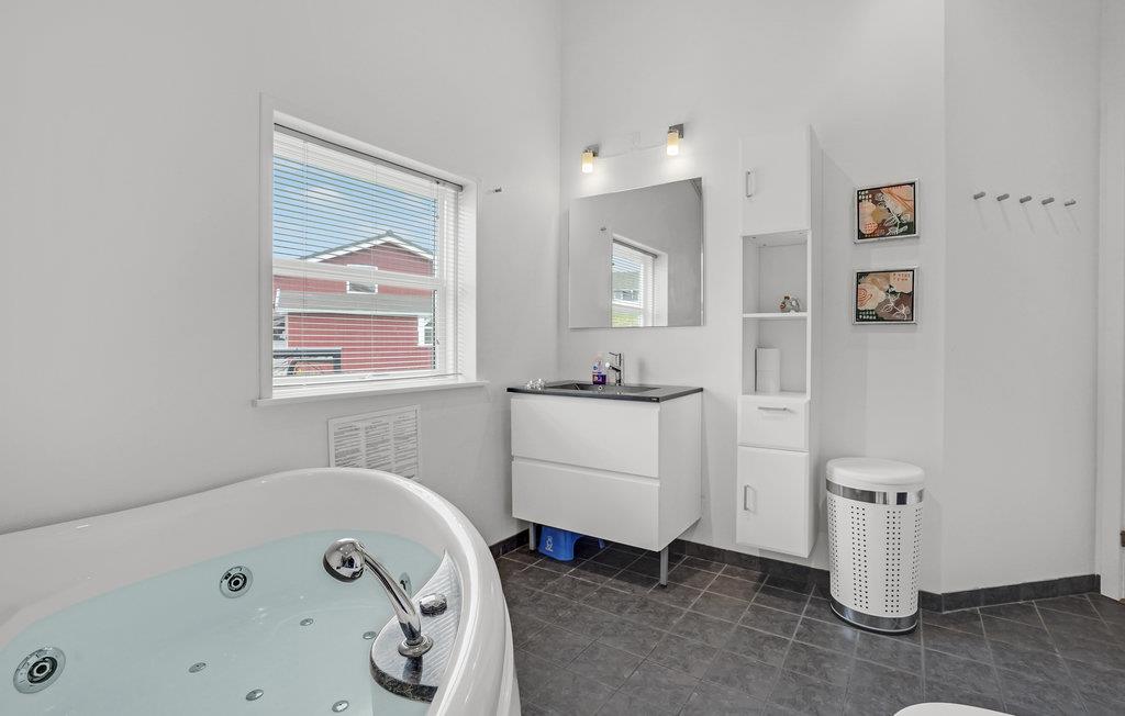 I et feriehusområde ligger dette dejlige feriehus. Det er arkitektonisk rigtigt godt indrettet med soveafdeling i den ene del af huset og opholdsafdeling i den anden. Der er dog også en dejlig hems, hvor børnene kan bo og lege. Fra stuen og terrassen er der en flot udsigt over et grønt område ned mod Lillebælt. Køkkenet ligger i tæt forbindelse med stuen, så I alle kan være sammen, selv om der laves mad. I det skønne badeværelse finder I spabadet og saunaen, der inviterer til total afslapning. Den flotte egn indbyder til mange udflugter i naturen, på museerne eller i oplevelsesparken Universe.
