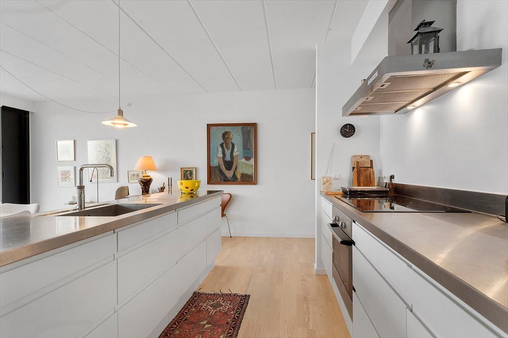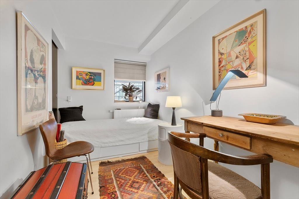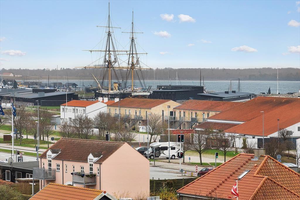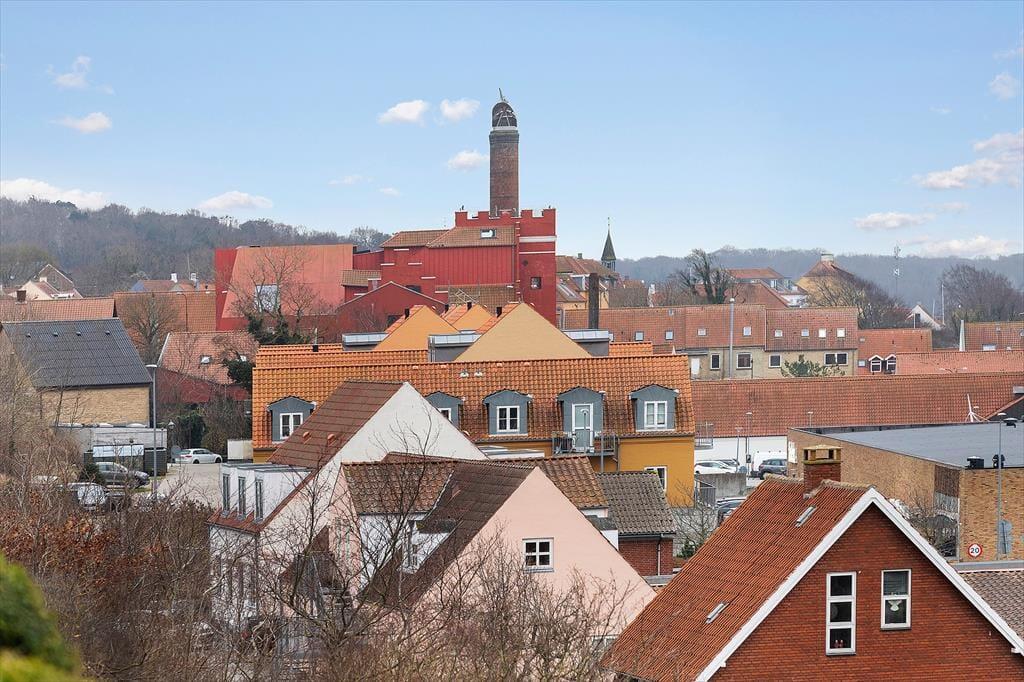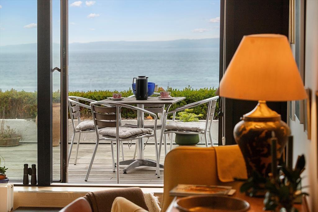 Træd ind i en lys og venlig ferielejlighed, der indbyder til afslapning, nærvær og hyggelige stunder med dem, du holder af. Hele lejligheden bærer præg af ejers dejlige billeder og private hjem, samt den helt unikke udsigtsmulighed over byens tage og Ebeltoft vig. Her er plads til op til 3 gæster i to indbydende soveværelser og et stilfuldt badeværelse, og rummets varme inviterer jer straks til at lægge hverdagens bekymringer på hylden. Køkken-alrummet ligger i åben forbindelse med stuen og sætter scenen for gode samtaler over kaffekoppen om morgenen og fællesmiddage om aftenen — alt sammen med panoramaudsigten som en smuk kulisse. Bortset fra 2 trin ud på terrassen er lejligheden uden dørtrin.