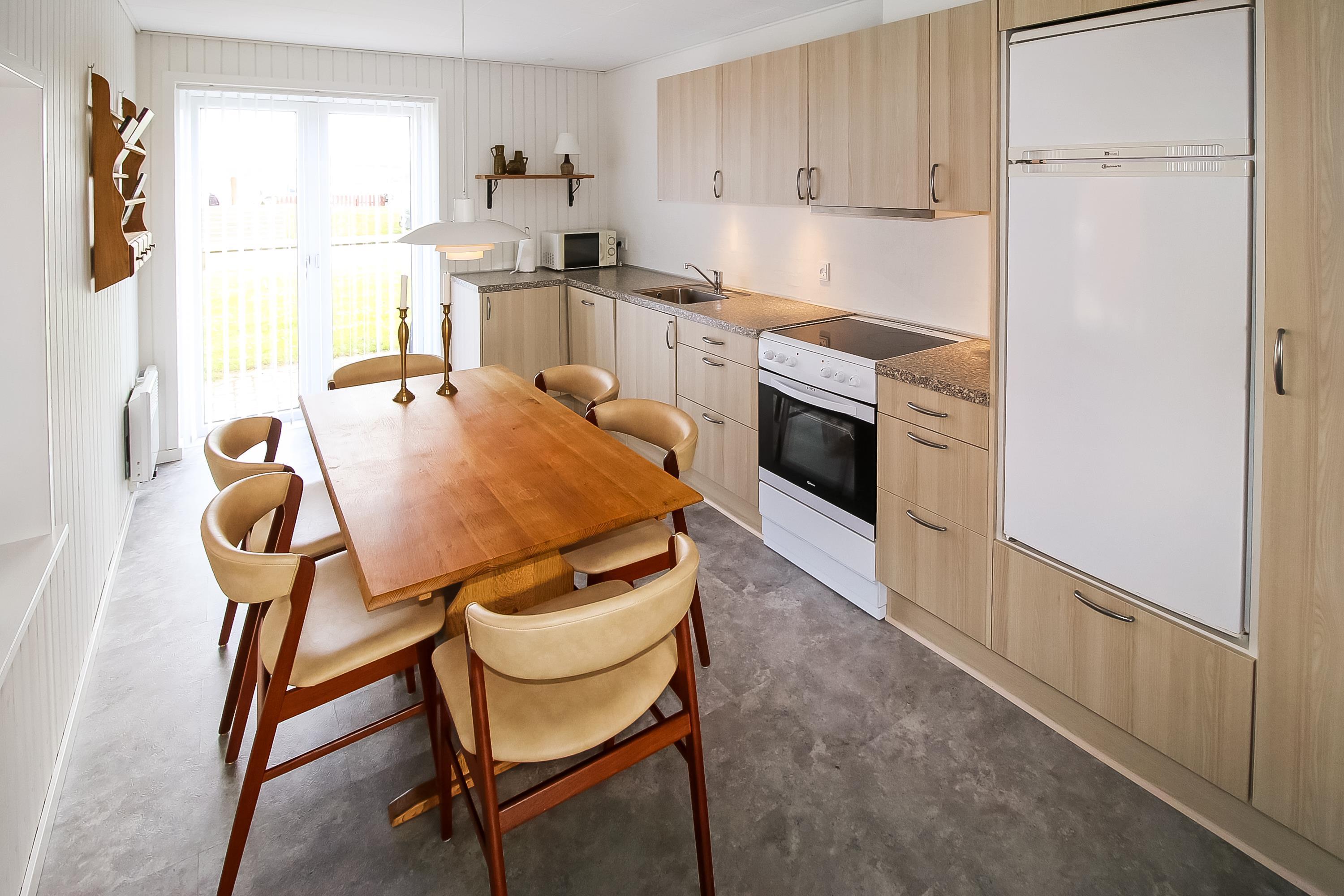 Køkkenet er udstyret med glaskeramisk komfur, et køleskab med separat fryser på liter. Herudover er der en opvaskemaskine samt mikrobølgeovn. Stuen er indrettet med sofa, brændeovn, varmepumpe og har ydermere CD-afspiller og kabel-TV med DR, TV2, tysk EUROSPORT1 og RTL.