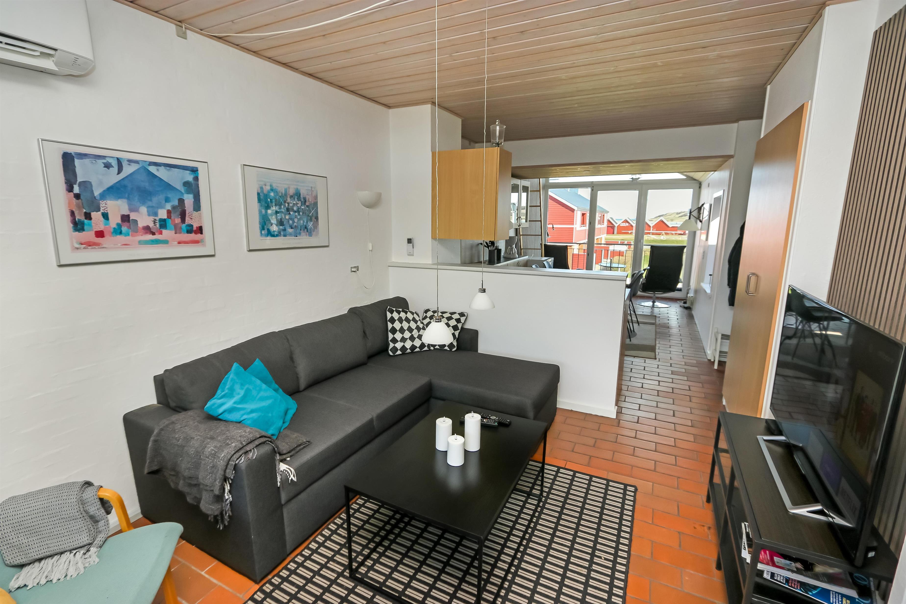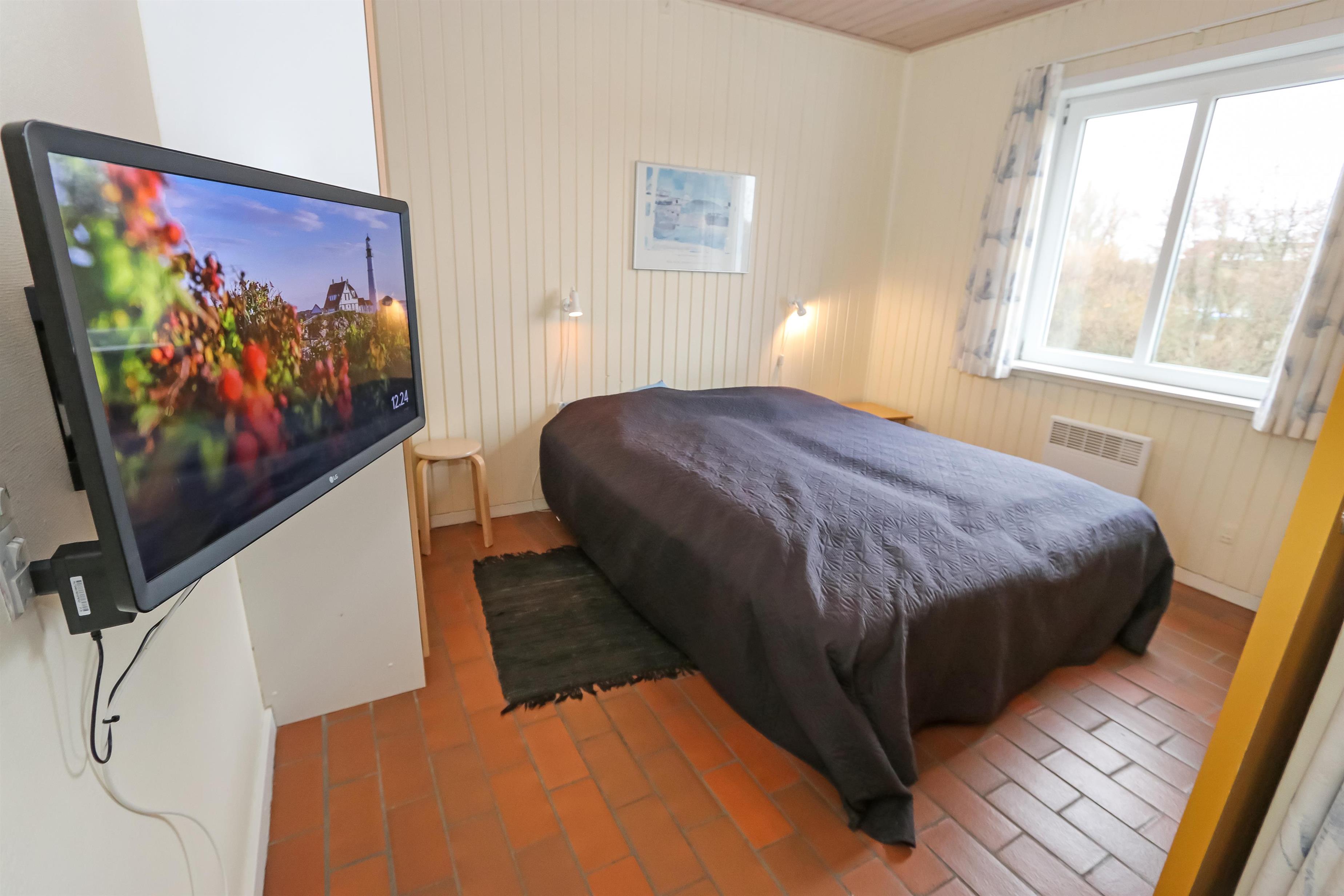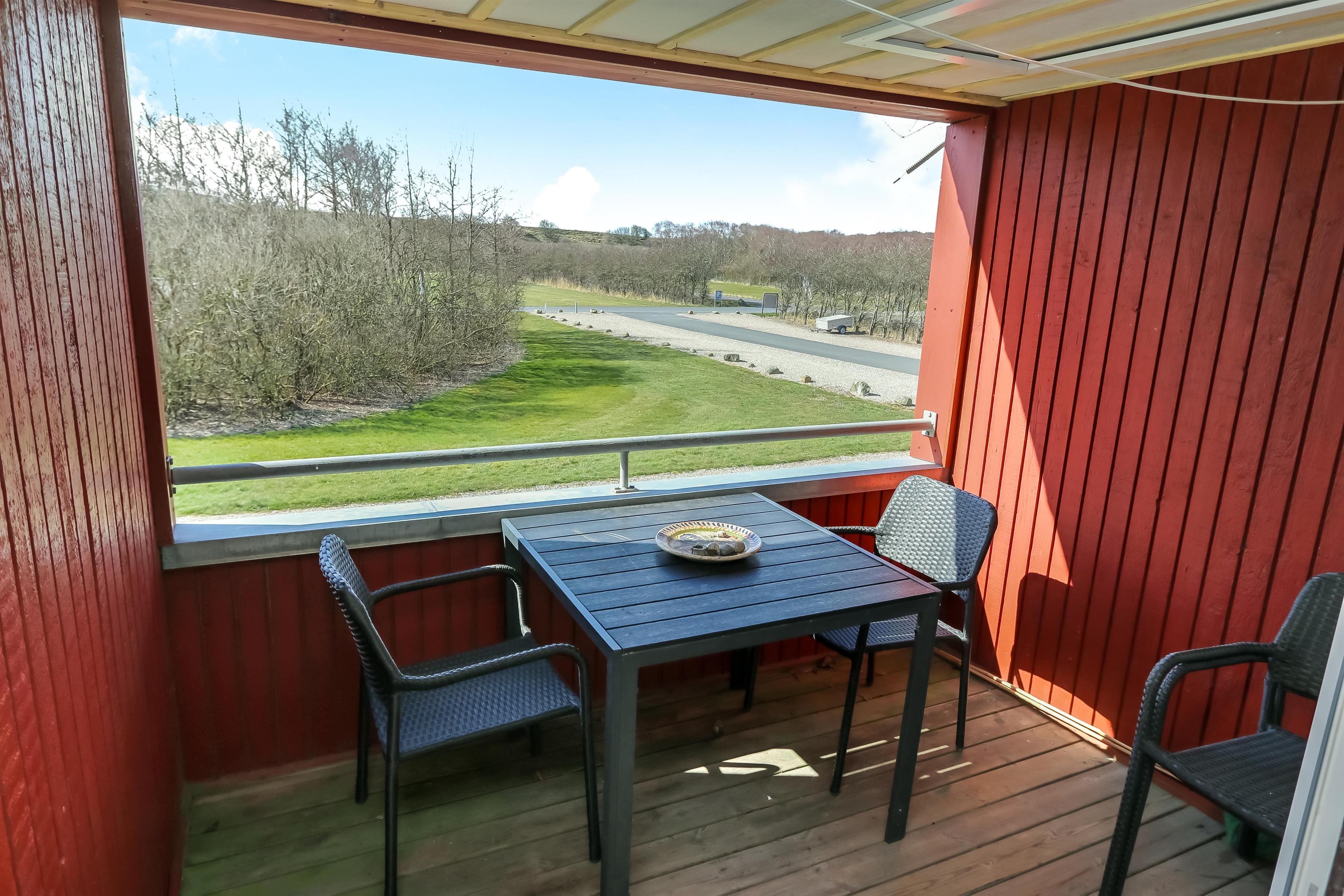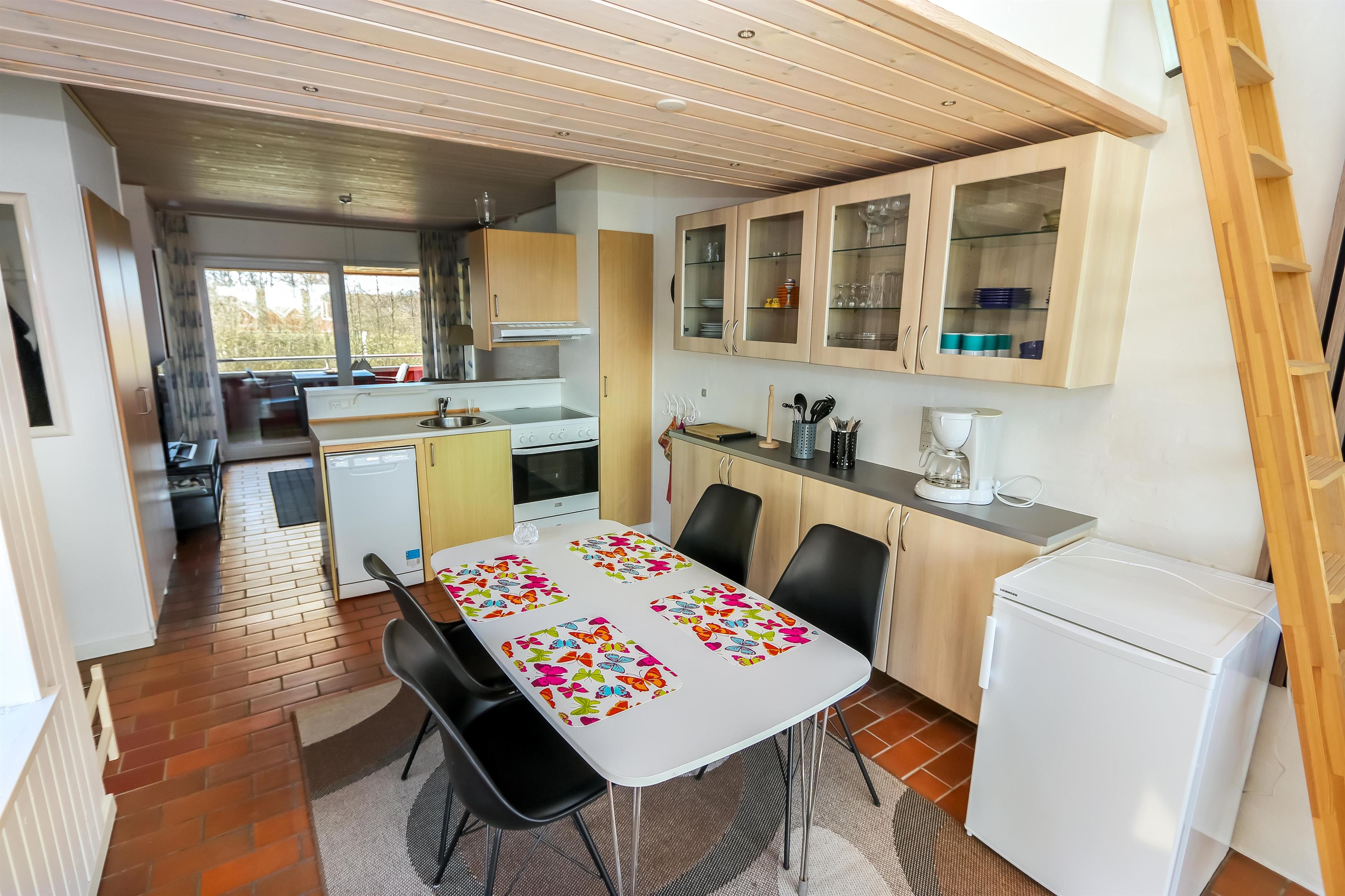 Køkken, opholdstue og spisebord er i samme store rum. Køkkenet er udstyret med elektrisk komfur, køleskab, opvaskemaskine og mikrobølgeovn. I opholdstuen er der TV med DR, TV2, tysk EUROSPORT1 og RTL. Radio, Chromecast og radio, CD-afspiller er ligeledes standard. Hertil kommer der også en varmepumpe. Sovemulighederne består af et soveværelse med dobbeltseng, 1 dobbelt sovesofa i stuen samt en hems med 2 sovemuligheder. Bemærk at man skal op af en stige for at komme på hemsen. Badeværelset er udstyret med det mest nødvendige: Bruser, håndvask og toilet. Fra stuen er der udgang til terrasse med tilhørende havemøbler, så her kan man sidde og nyde udsigten både morgen og aften om man vil. Har man el-bil eller en Plug-In hybrid, så er der 4 Ladebokse til Type 2 ladestik, der kan lade op til 11 kWh ved Feriecenteret - de er lige efter miljøstationen.