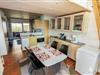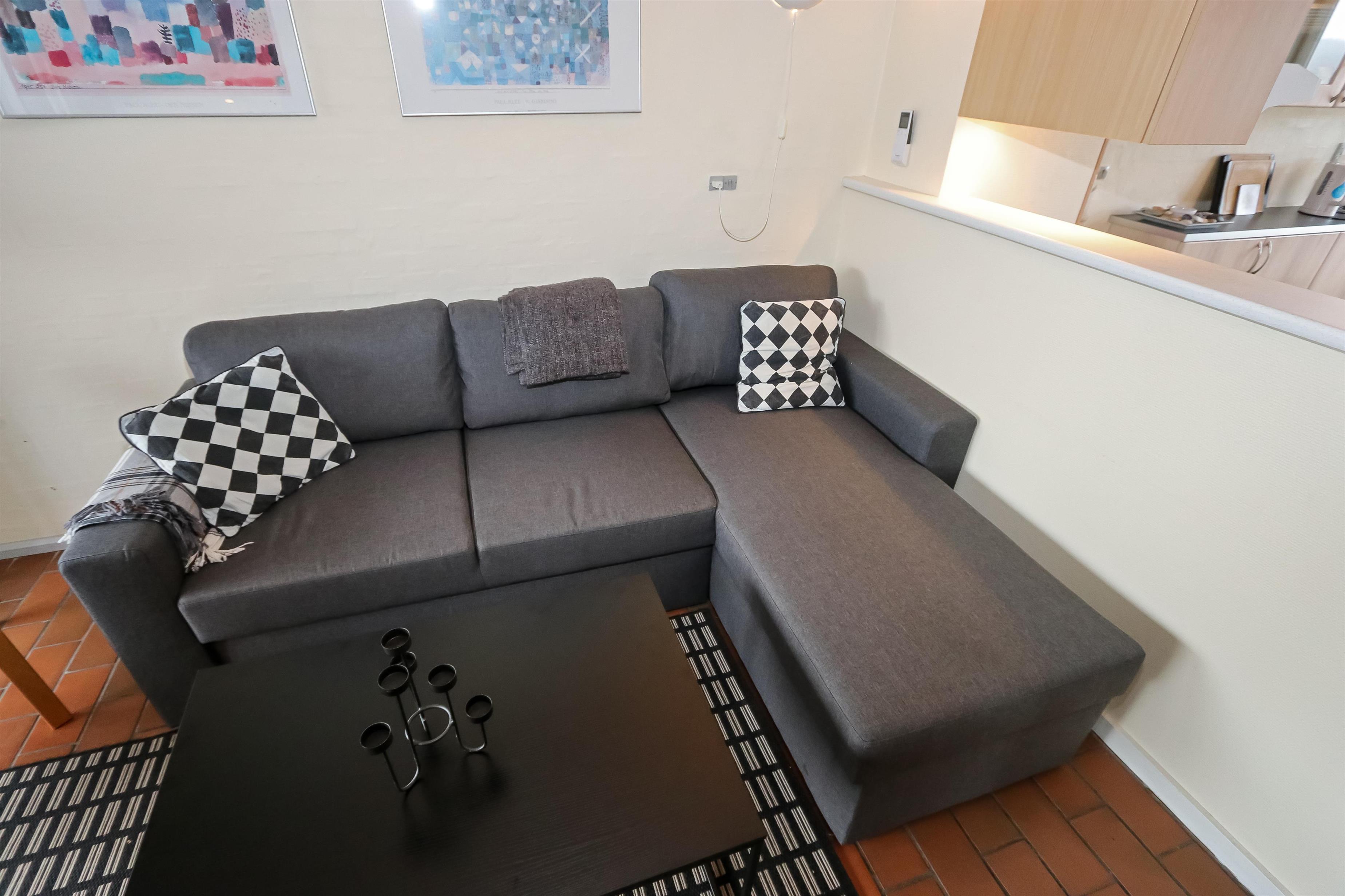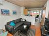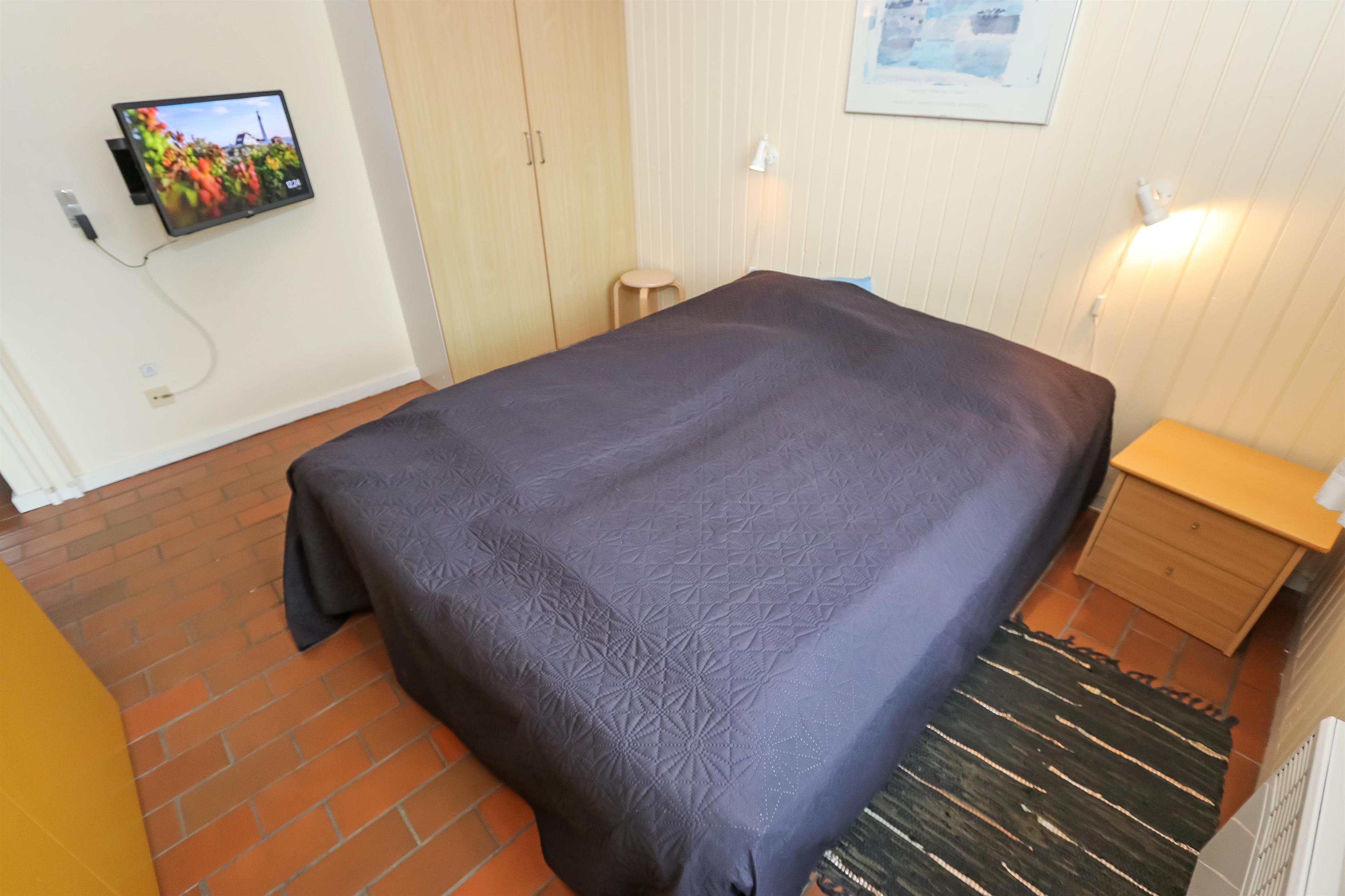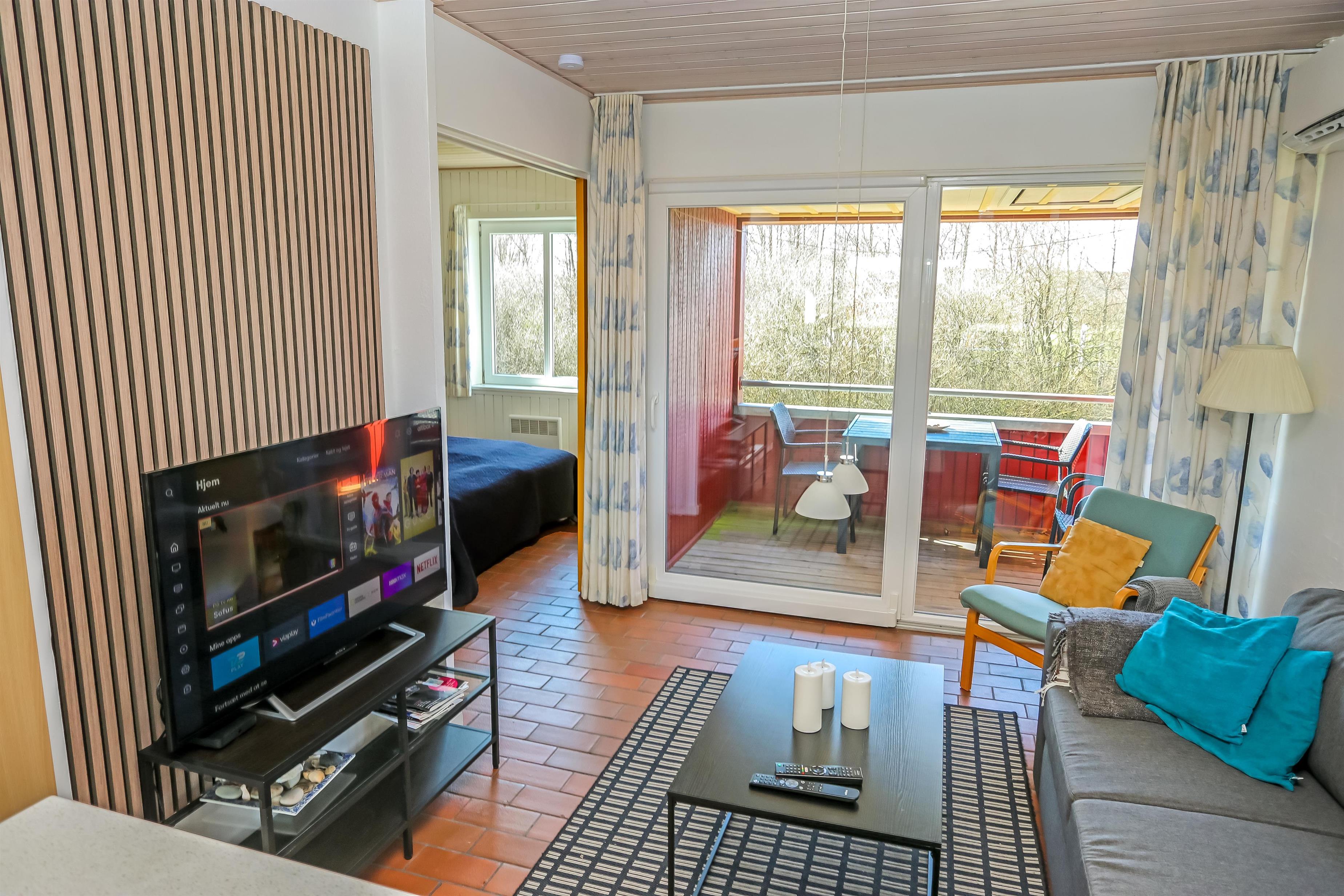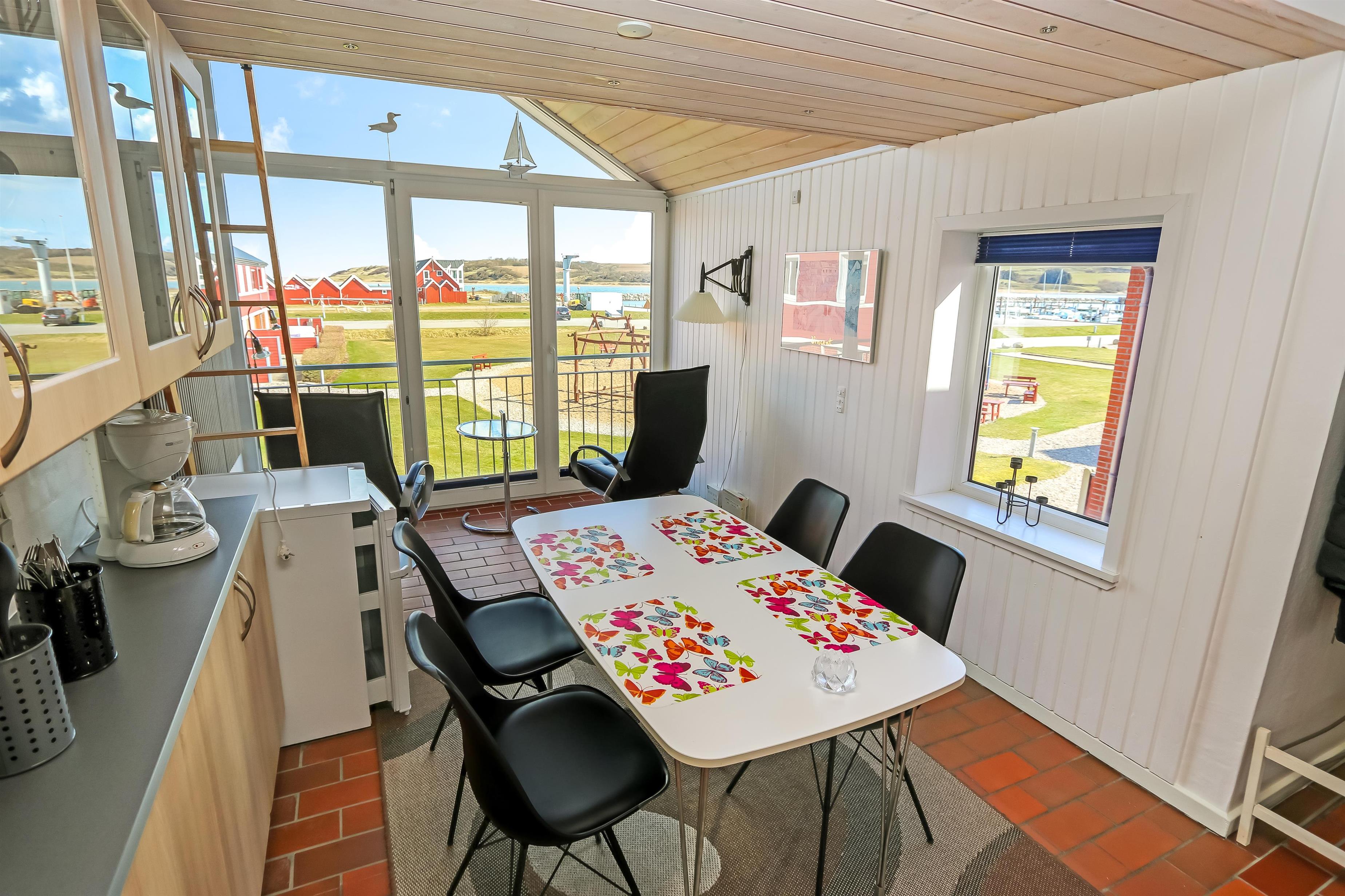Køkken, opholdstue og spisebord er i samme store rum. Køkkenet er udstyret med elektrisk komfur, køleskab, opvaskemaskine og mikrobølgeovn. I opholdstuen er der TV med DR, TV2, tysk EUROSPORT1 og RTL. Radio, Chromecast og radio, CD-afspiller er ligeledes standard. Hertil kommer der også en varmepumpe. Sovemulighederne består af et soveværelse med dobbeltseng, 1 dobbelt sovesofa i stuen samt en hems med 2 sovemuligheder. Bemærk at man skal op af en stige for at komme på hemsen. Badeværelset er udstyret med det mest nødvendige: Bruser, håndvask og toilet. Fra stuen er der udgang til terrasse med tilhørende havemøbler, så her kan man sidde og nyde udsigten både morgen og aften om man vil. Har man el-bil eller en Plug-In hybrid, så er der 4 Ladebokse til Type 2 ladestik, der kan lade op til 11 kWh ved Feriecenteret - de er lige efter miljøstationen.