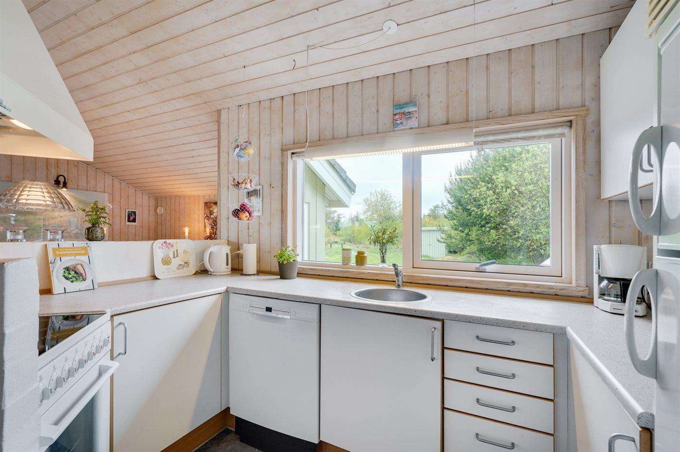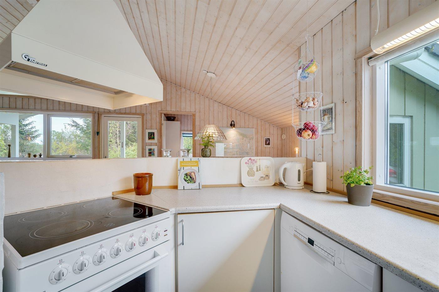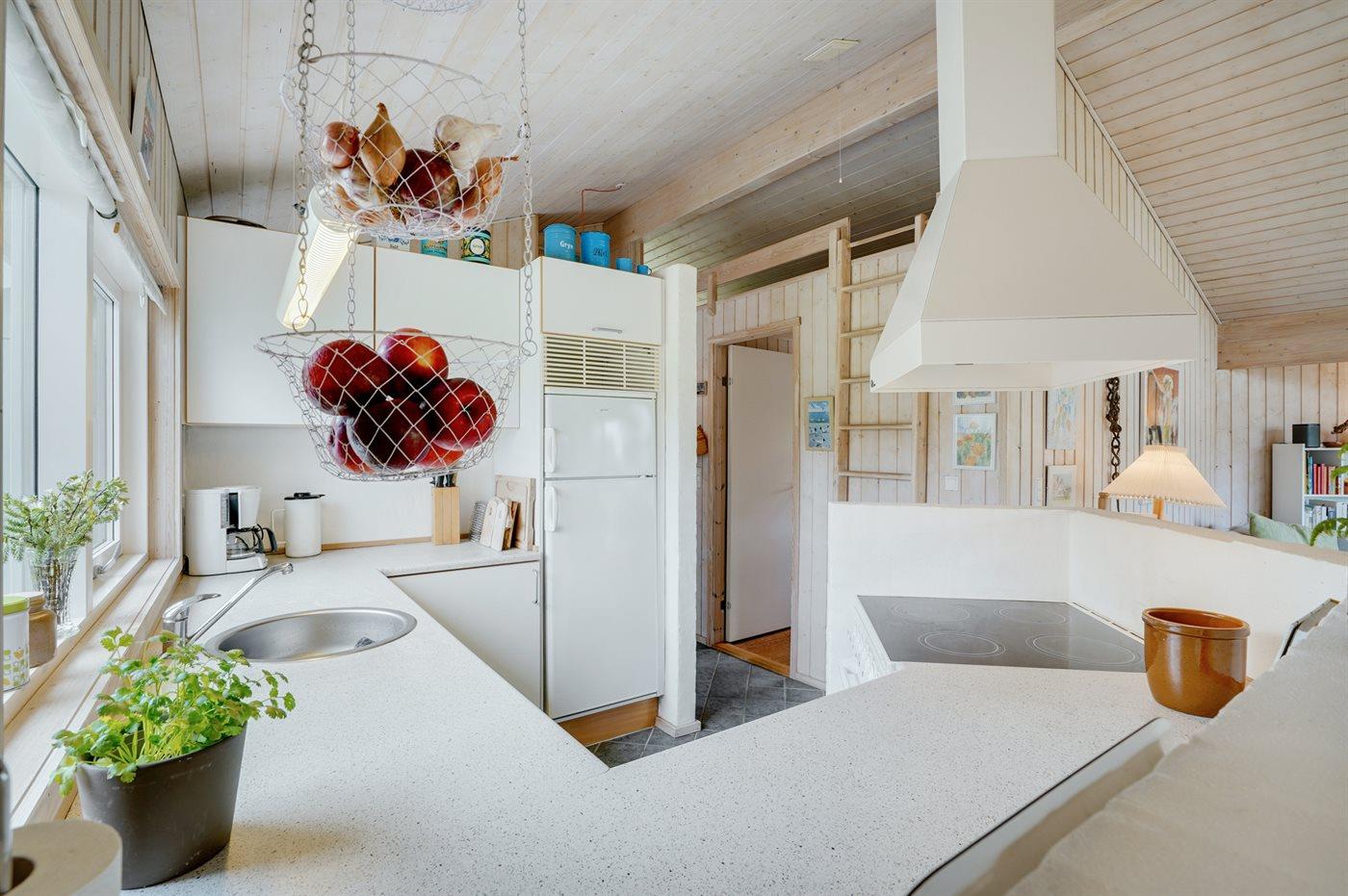 Køkkenet er udstyret med 1 køleskab. Der er 4 keramiske kogeplader, varmluftovn samt opvaskemaskine.