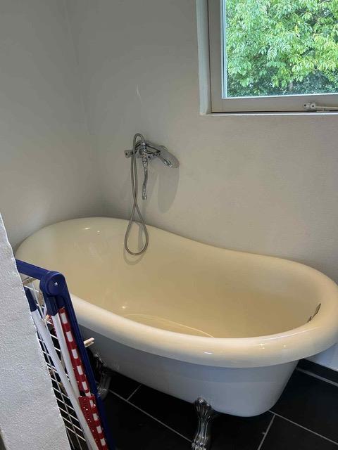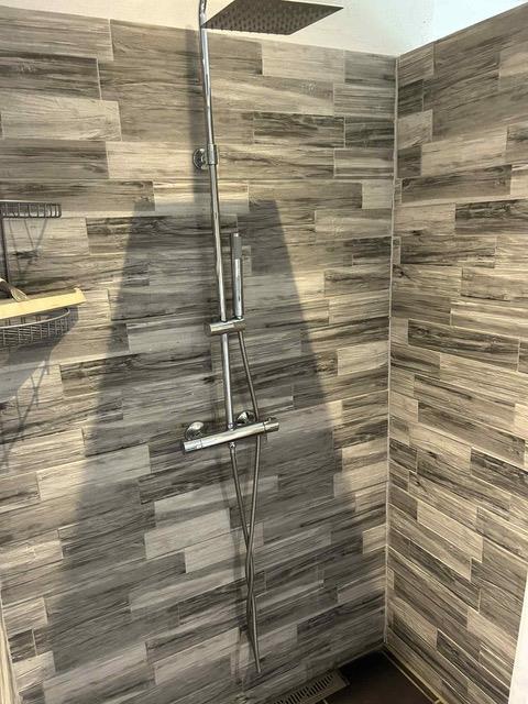 Badeværelse med både brusebad og karbad samt varme i gulvet. Der er vaskemaskine til rådighed.