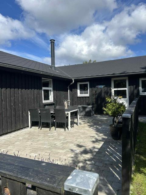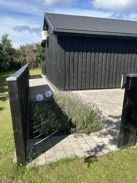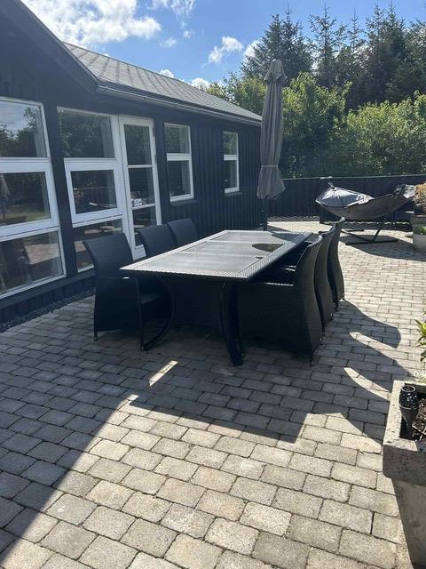 Udenfor er der havemøbler, liggestole og en grill og en stor åben terrasse på 100 m2 samt p-plads til bilen.