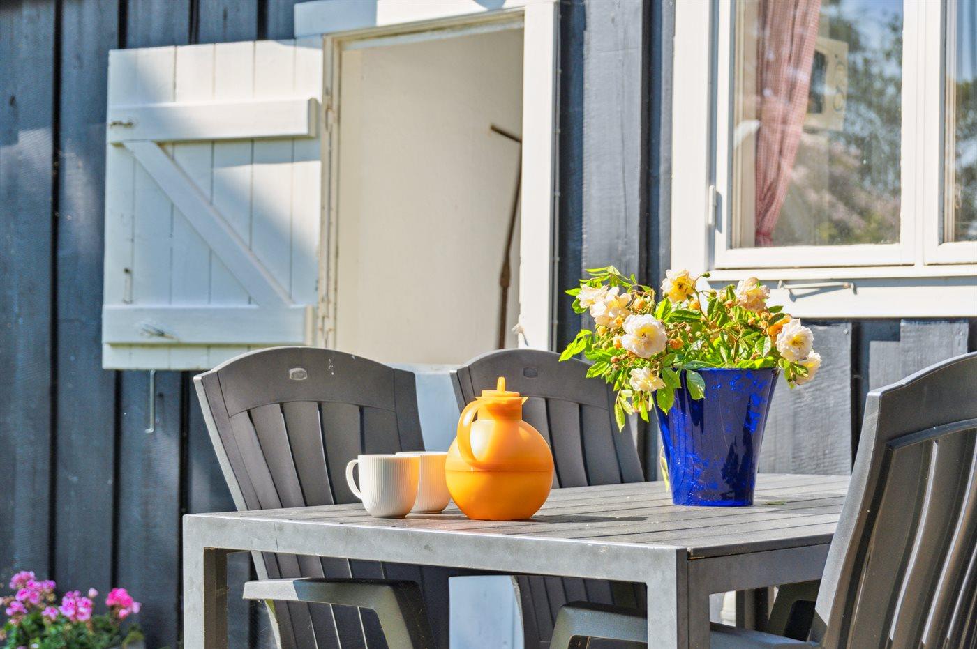 Ferieboligen er beliggende på en 1341 m² stor havegrund. Grunden er indhegnet. Der er 1000 m til havet. Nærmeste forretning er beliggende i en afstand af 800 m. Til ferieboligen hører åbent terrasseareal. Desuden er der overdækket terrasse. Der ligger en legeplads i en afstand af 900 m. Grill til rådighed. Parkering ved ferieboligen.