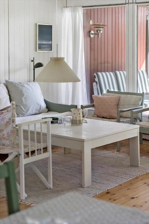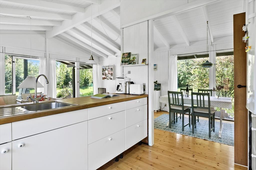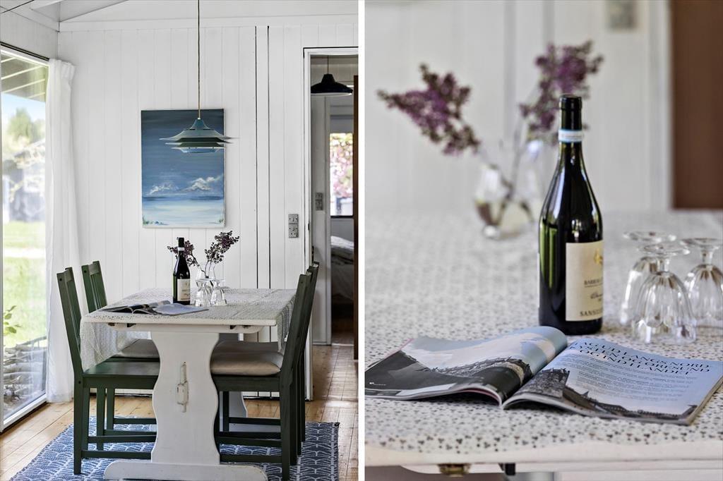 Når du træder indenfor i dette hyggelige ældre sommerhus, mødes du af en varm og indbydende atmosfære. Det åbne køkken og spisepladsen danner rammerne om fælles måltider og hyggelige stunder, hvor du kan dele dagens oplevelser. I stuen kan du lade dig synke ned i sofaen med en god bog eller samle familien til en omgang brætspil foran brændeovnens knitren. Herfra er der direkte adgang til den overdækkede terrasse, som giver mulighed for at nyde aftener i skyggen eller i lyset fra de sidste solstråler.