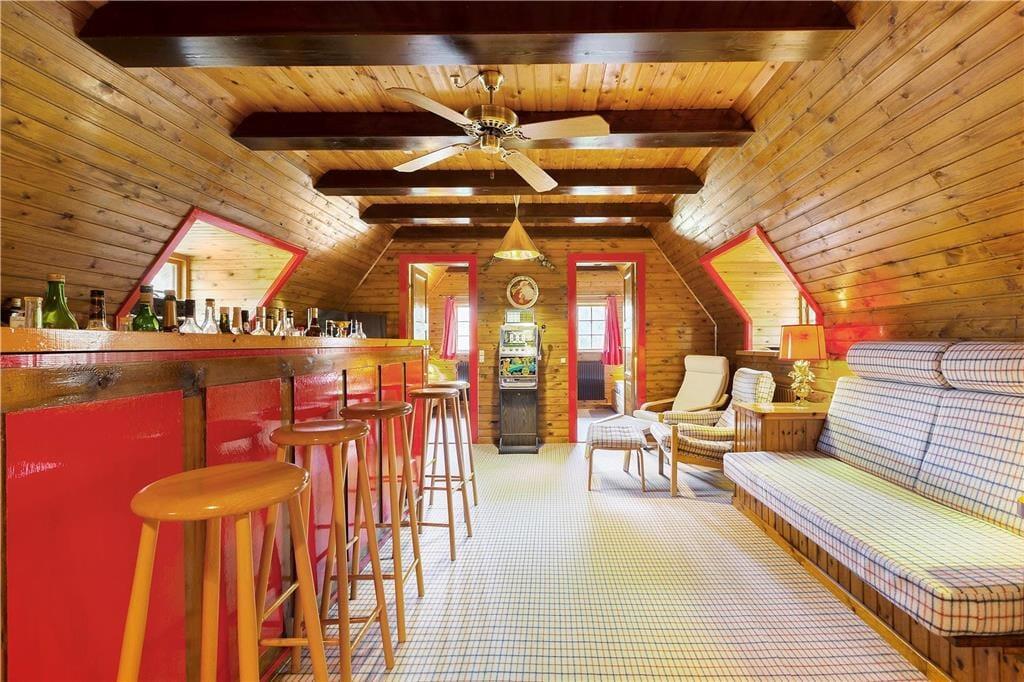 På første sal er der et opholdsrum/tv-stue, ideelt til afslapning efter en dag fuld af oplevelser. Der er yderligere tre værelser heroppe: to med enkeltsenge og et med dobbeltseng, alle indrettet i den gennemførte retro-stil, der kendetegner hele huset.