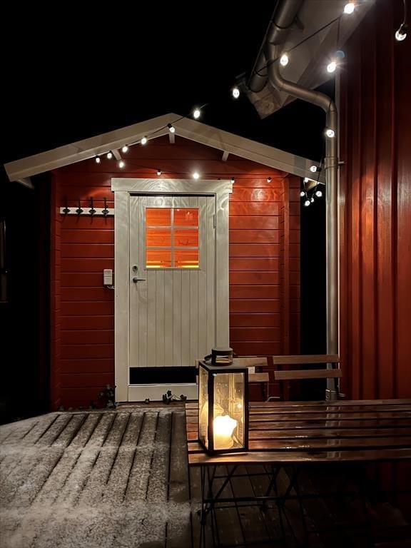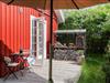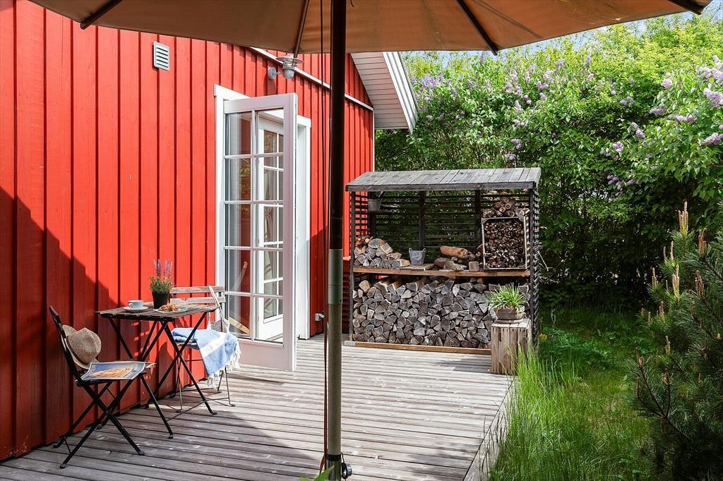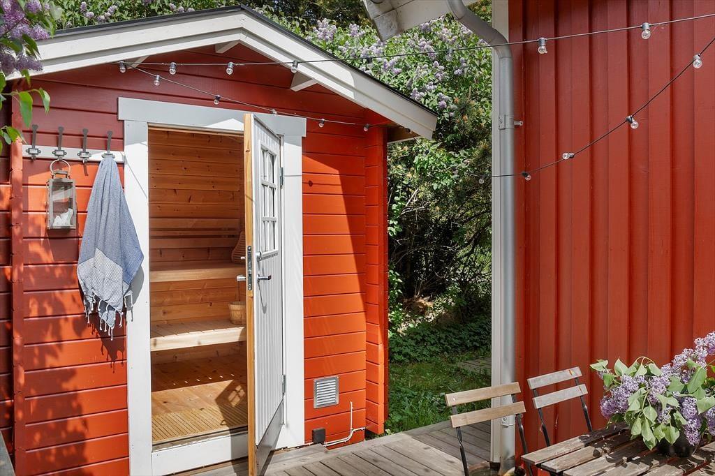 Udenfor venter en dejlig terrasse, der indbyder til afslapning under åben himmel. Her kan du nyde din morgenkaffe i solen, tilberede lækre grillretter og afslutte dagen med en kølig drink i hånden. Efter en tur eller en løbetur i den omgivende natur kan du forkæle dig selv med en tur i saunaen, der tilbyder ultimativ afslapning og fornyet energi. Ved siden af saunaen finder du en udendørs bruser – perfekt til en forfriskende af skylning under den blå himmel. Den vilde, grønne have, der omgiver huset, giver plads til leg, ro og fordybelse, mens fuglesang fylder luften og forstærker den fredelige atmosfære.