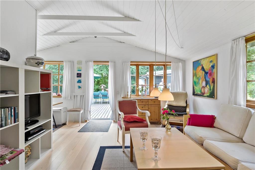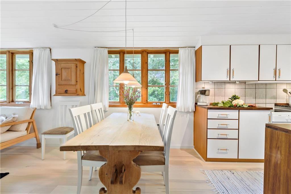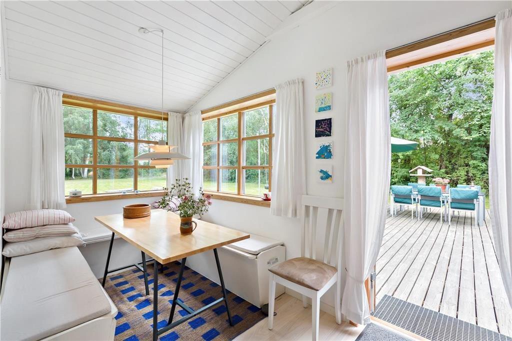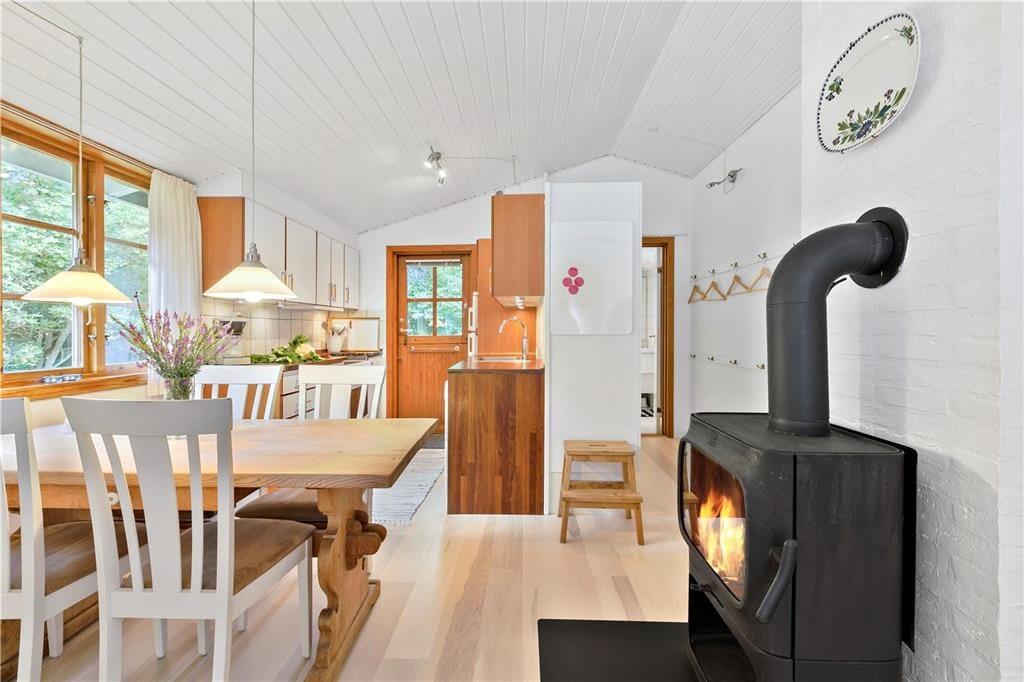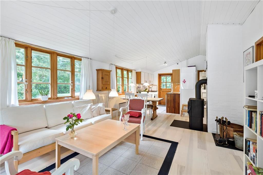 I dette lyse og indbydende sommerhus får du de perfekte rammer for en afslappende ferie. Opholdsstuen er indrettet med et komfortabelt sofahjørne, spiseplads og en brændeovn, der skaber en varm og hyggelig atmosfære på kølige aftener. I vindueskarnappen finder du et hyggeligt spisebord med slagbænk langs væggene – perfekt til lange måltider og brætspil med familien. Herfra er der direkte udgang til træterrassen, så du nemt kan tage middagen med ud i det fri.