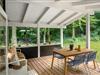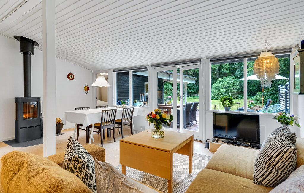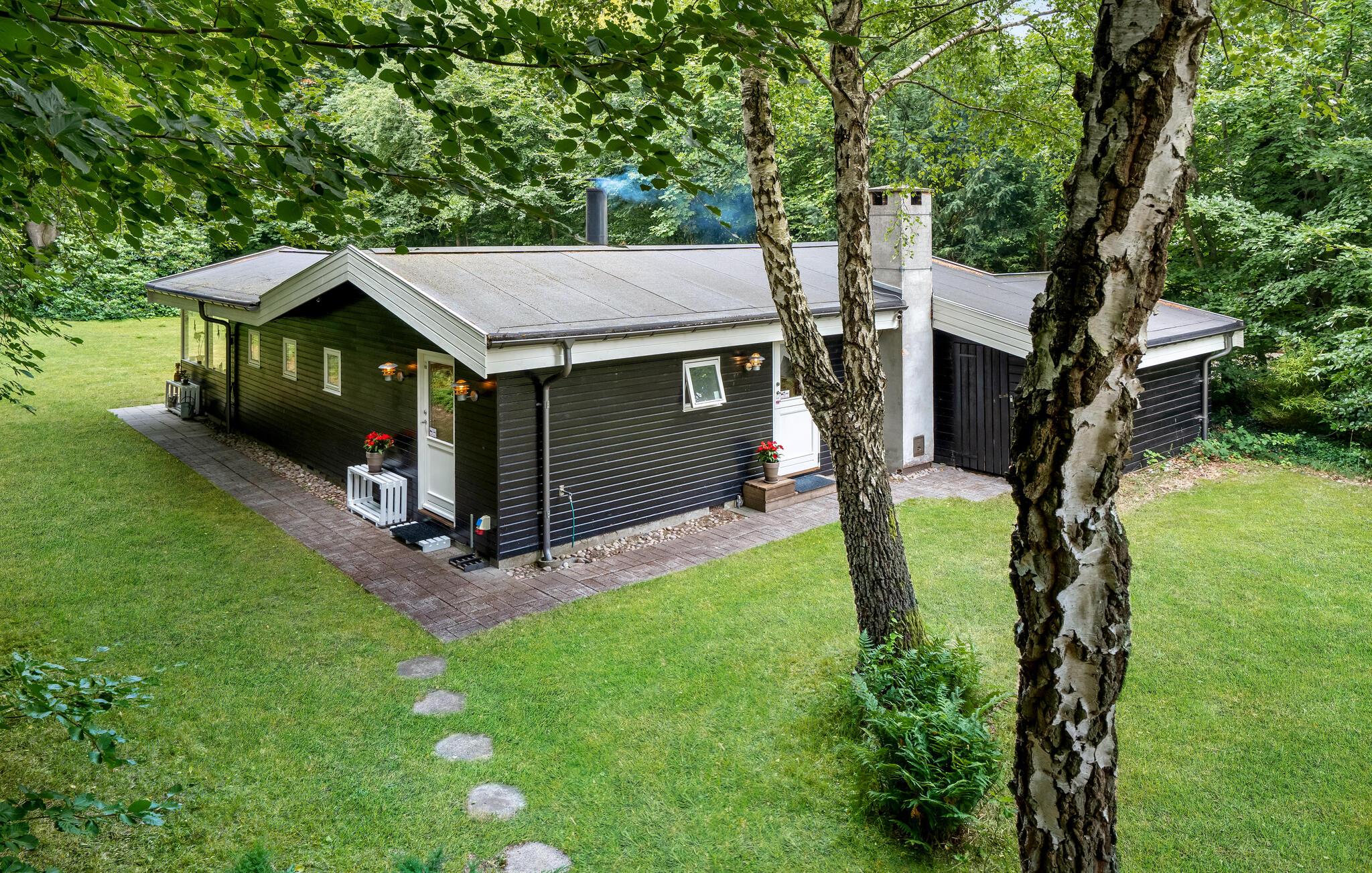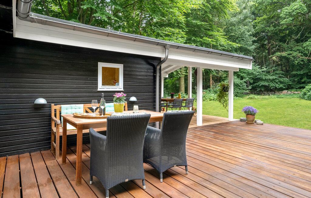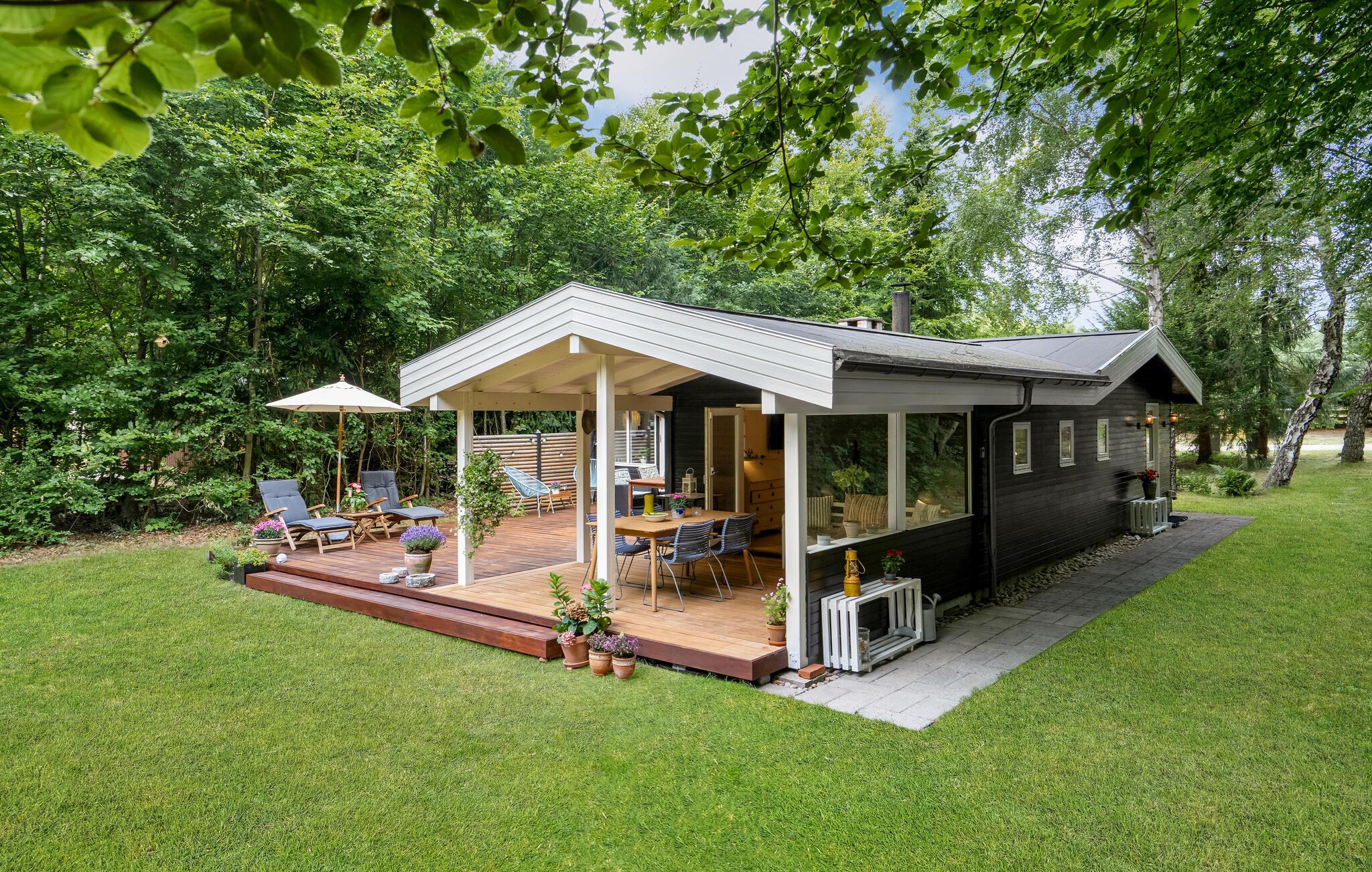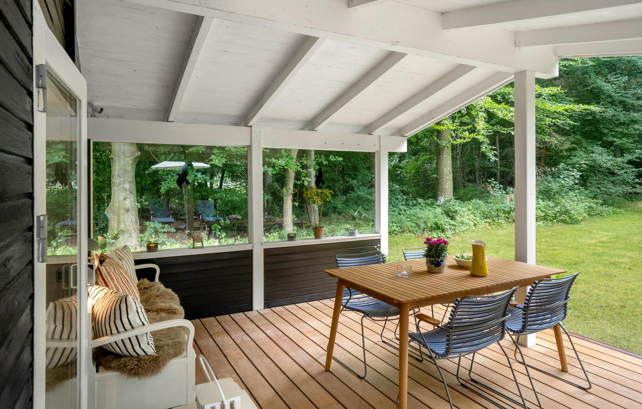 Stilfuldt feriehus i Liseleje med skov, terrasse og brændeovn nær strand og natur.