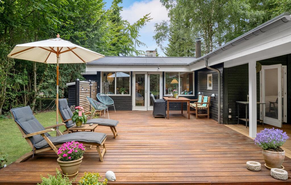 Den store træterrasse er en vidunderlig oase og indbyder til mange afslappende timer i det fri. Slå jer ned i de stilfulde havemøbler og nyd en kold forfriskning, mens I ser børnene lege.