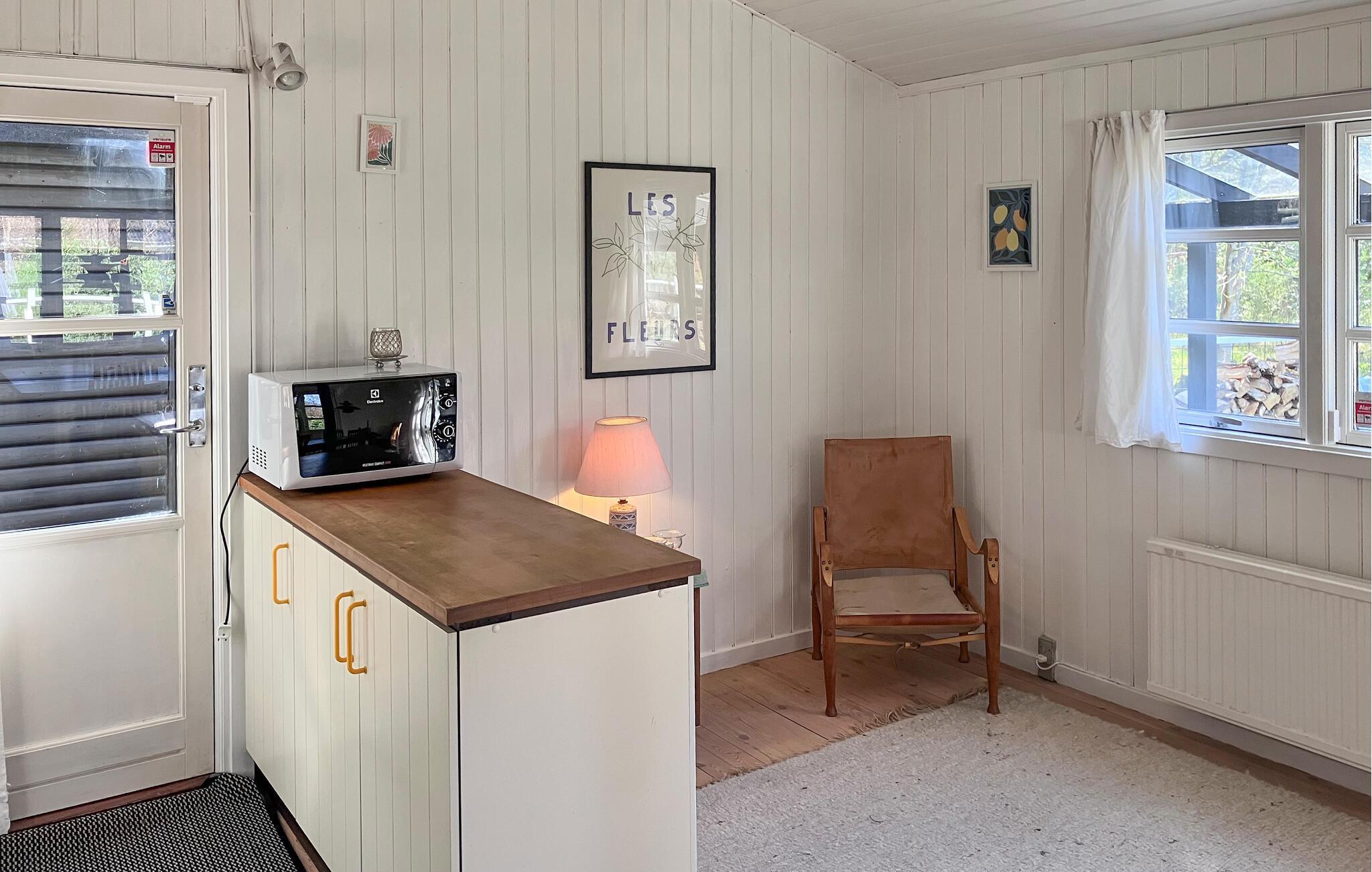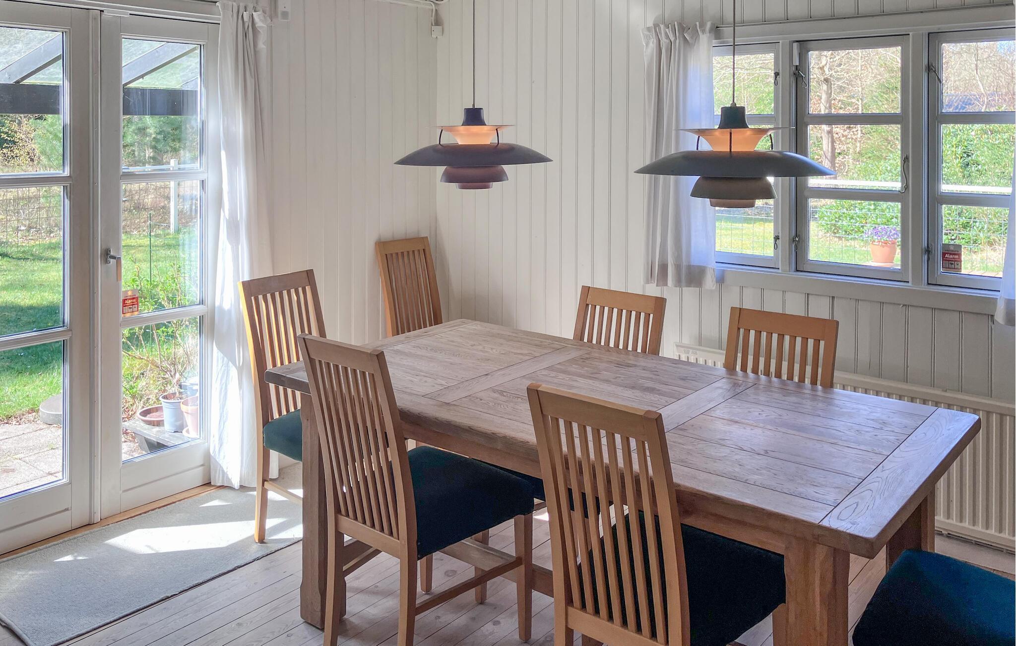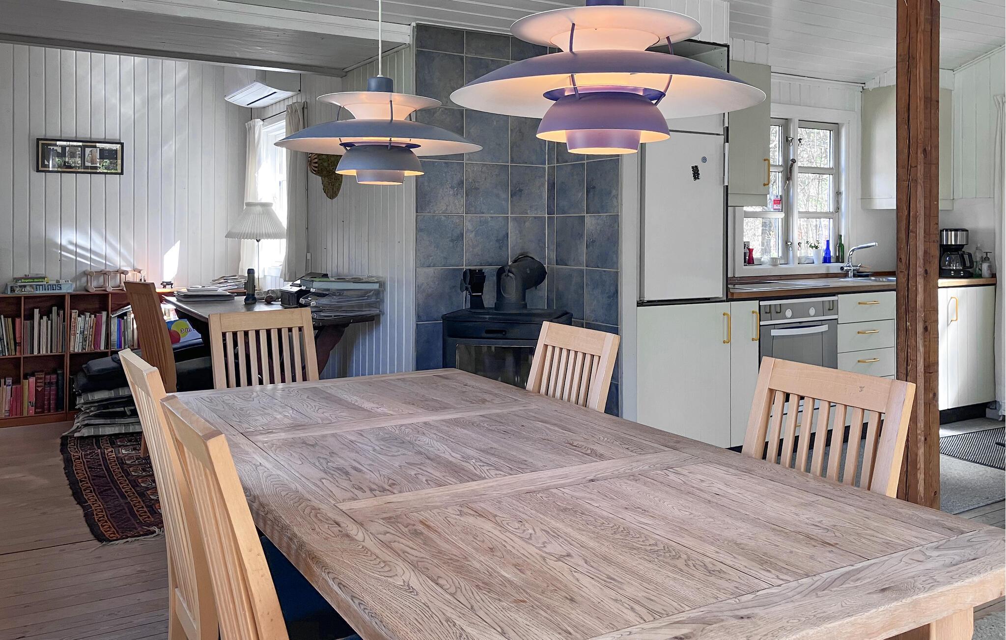 Dette feriehus ligger i et roligt, grønt skovområde og giver jer et afslappende tilflugtssted med masser af privatliv. Den charmerende arkitektoniske stil og den hyggelige atmosfære sikrer øjeblikke med velvære. Gør det behageligt i den lyse opholdsstue. Gennemse de velassorterede bogreoler, slap af i sofaen eller se en film. Værelset er behageligt møbleret med klassiske møbler og en brændeovn, der giver hyggelig varme på kølige aftener. Lav maden sammen i køkkenet og nyd måltiderne i den stilfulde spisestue med udsigt over de grønne områder.