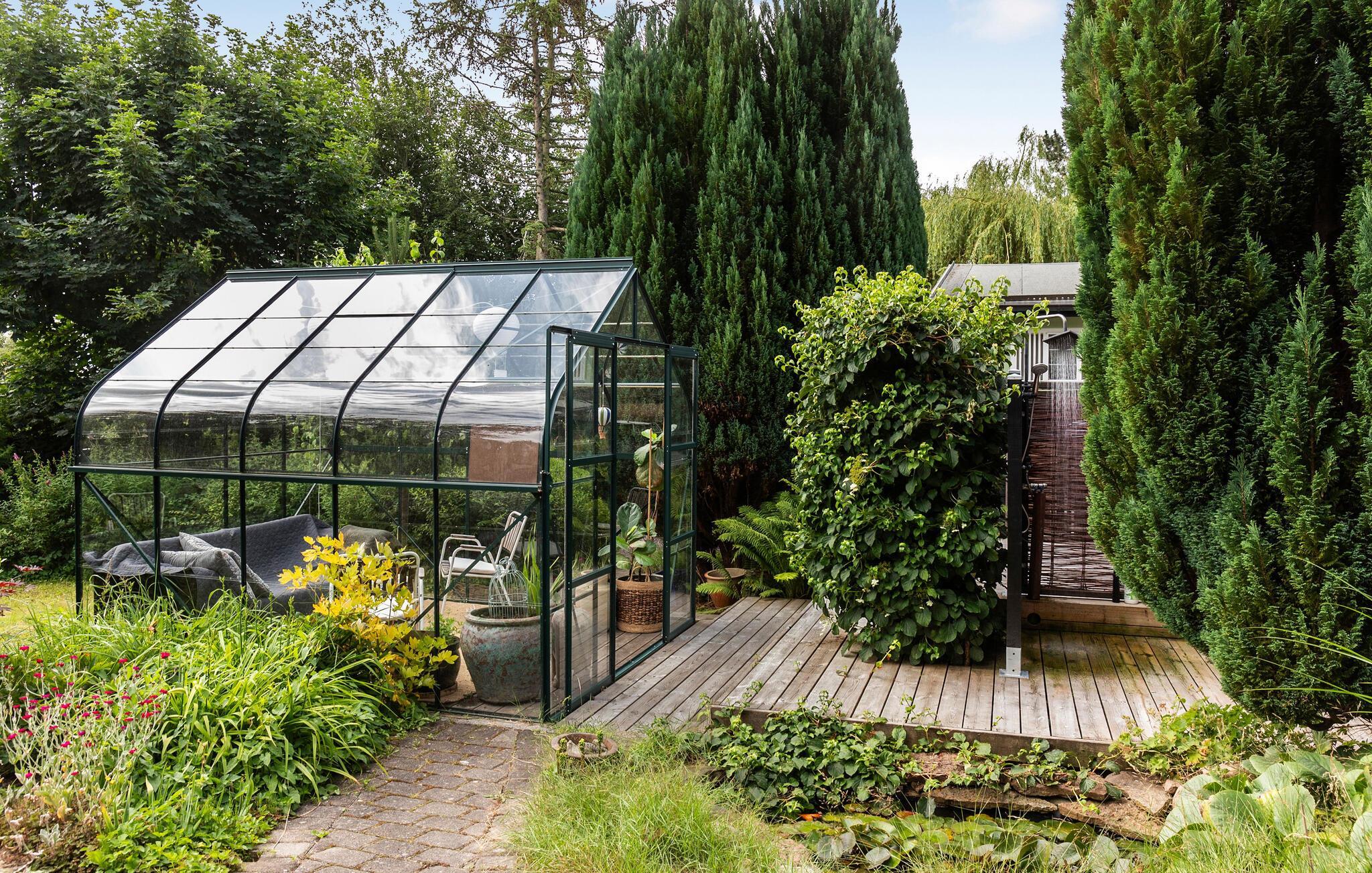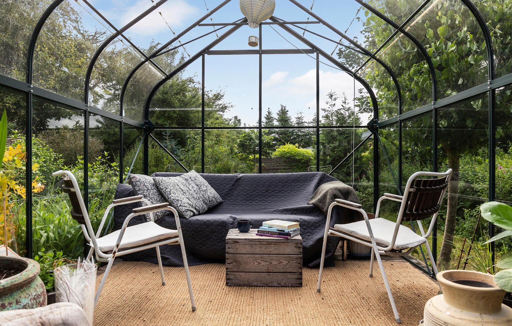 I den store og smukt anlagte have er der et hyggeligt orangeri. Her, beskyttet mod vind og vejr, kan I nyde den uhindrede udsigt over haven og den vidunderlige fred og ro. På solrige dage kan I gøre det behageligt på terrassen, mens I på kølige eftermiddage kan slappe af og varme jer i saunaen.