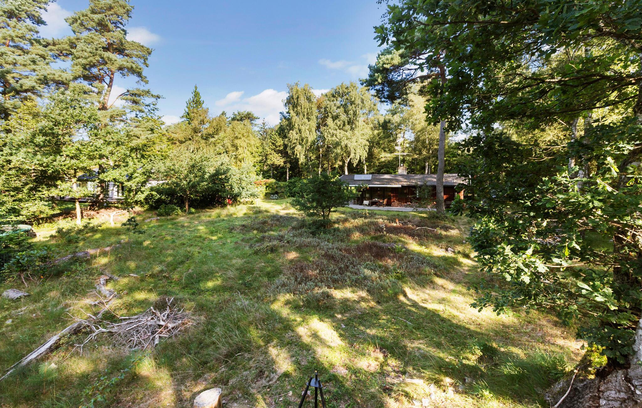 Hyggeligt sommerhus i grønne omgivelser nær Liseleje Strand med pejs og trampolin for afslapning og aktiviteter.