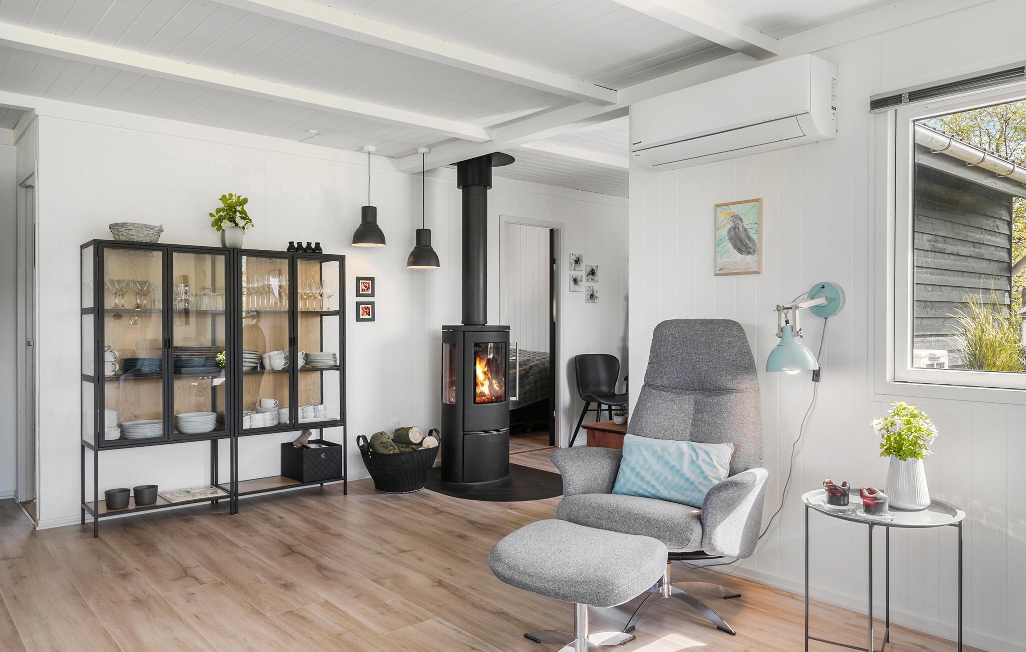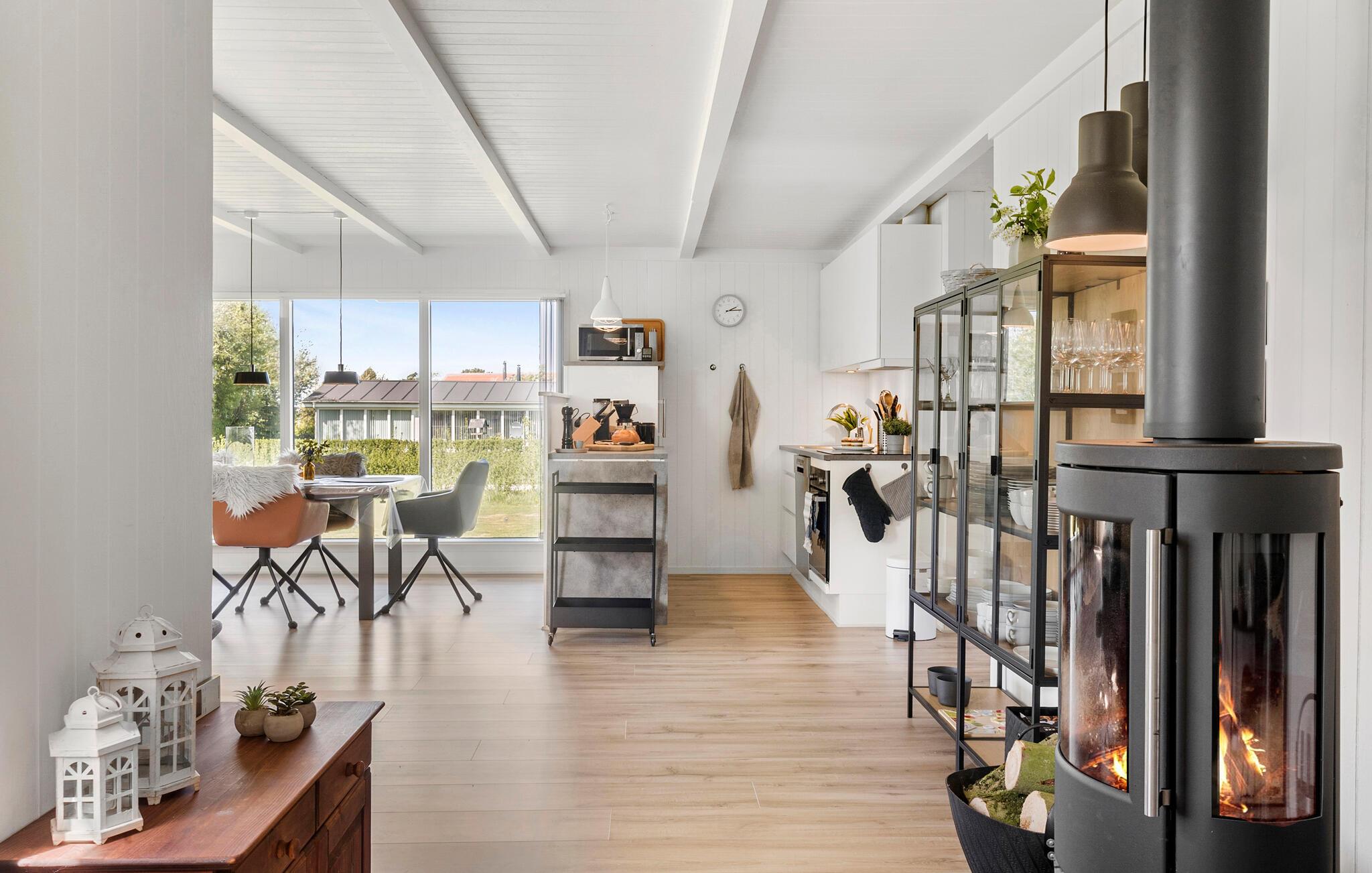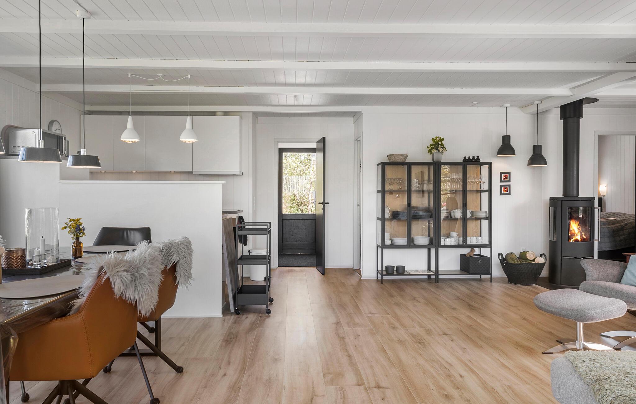 Der er lagt op til nogle afslappende dage i dette komfortable sommerhus, som emmer af ro, kvalitet og feriestemning . Træd ind i den lyse opholdsstue med stilfulde indretningsløsninger, komfortable sofaer og brændeovn. Find jer godt til rette med en bog eller en film, mens I af og til kigger ud på det grønne gennem de store vinduer. Brug den åbne spiseplads til fælles måltider og lav maden i køkkenet med moderne apparater.