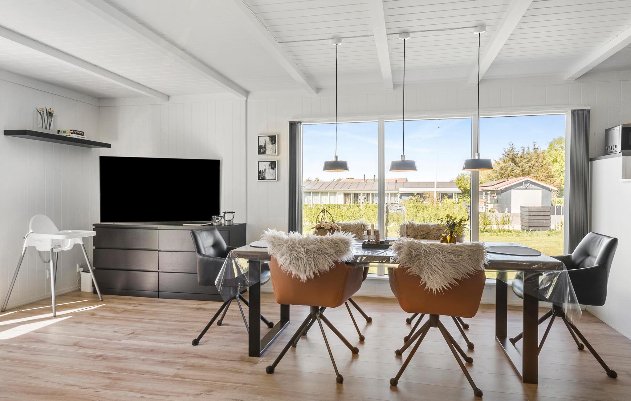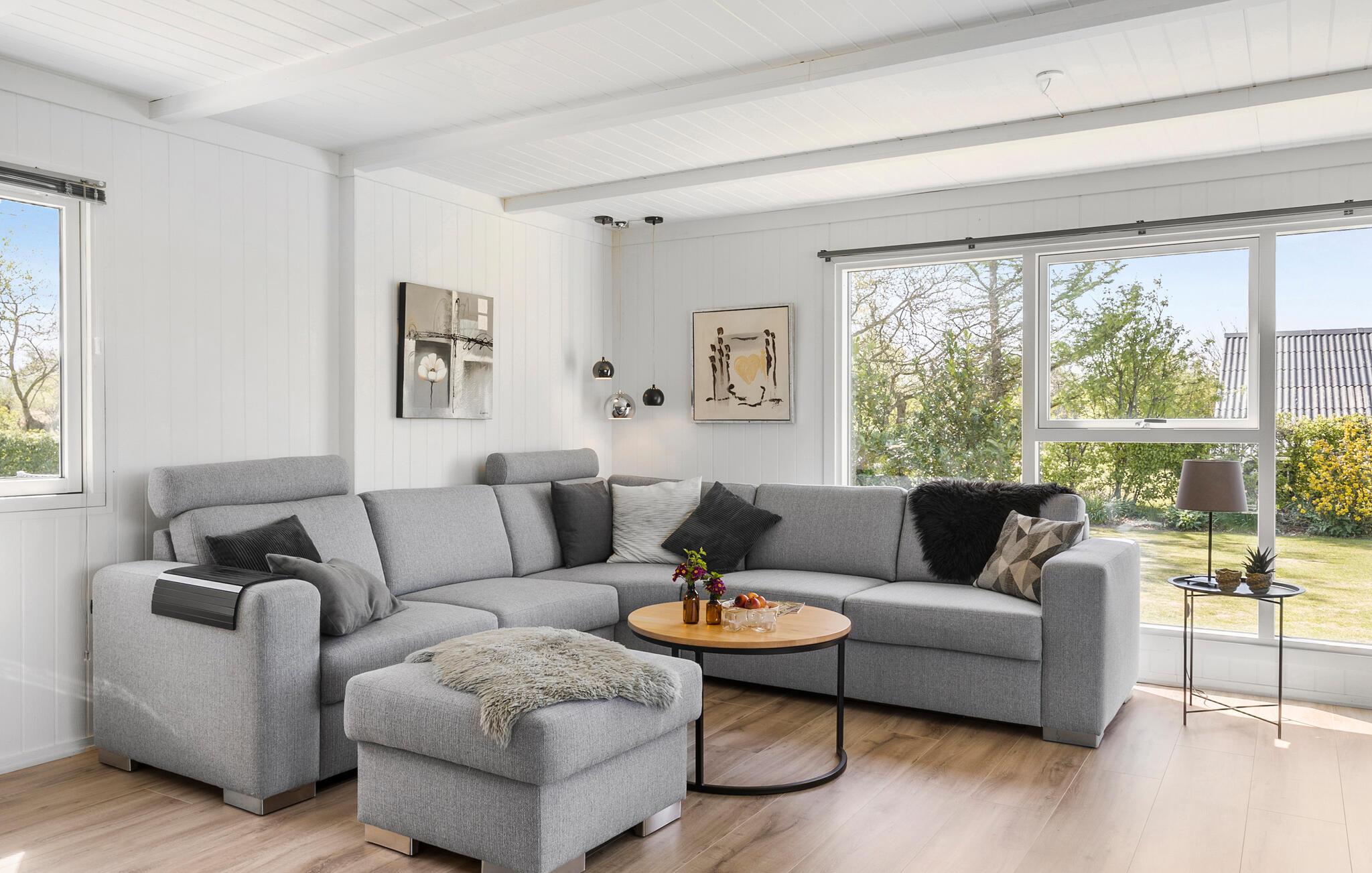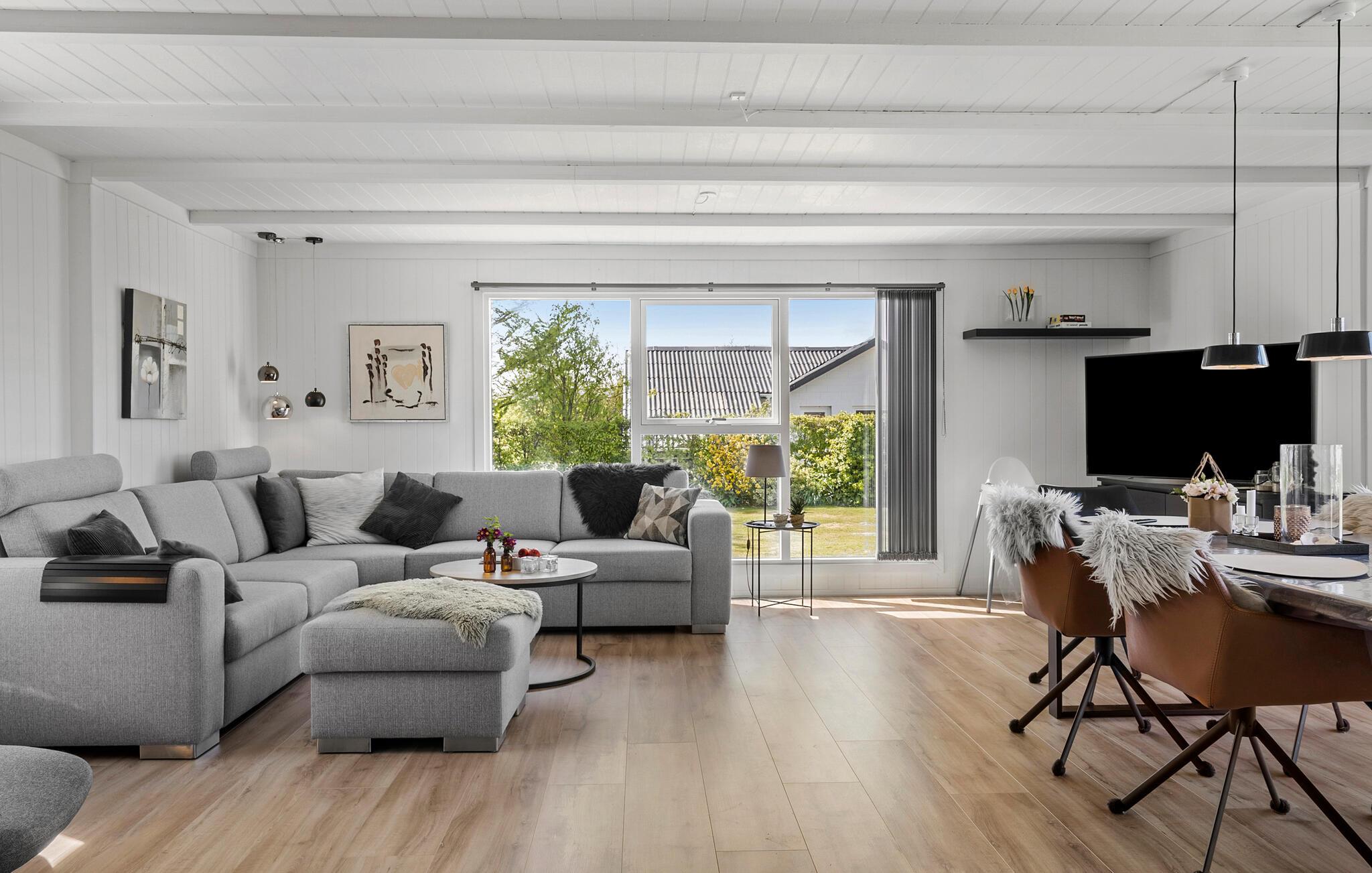 Der er lagt op til nogle afslappende dage i dette komfortable sommerhus, som emmer af ro, kvalitet og feriestemning . Træd ind i den lyse opholdsstue med stilfulde indretningsløsninger, komfortable sofaer og brændeovn. Find jer godt til rette med en bog eller en film, mens I af og til kigger ud på det grønne gennem de store vinduer. Brug den åbne spiseplads til fælles måltider og lav maden i køkkenet med moderne apparater.