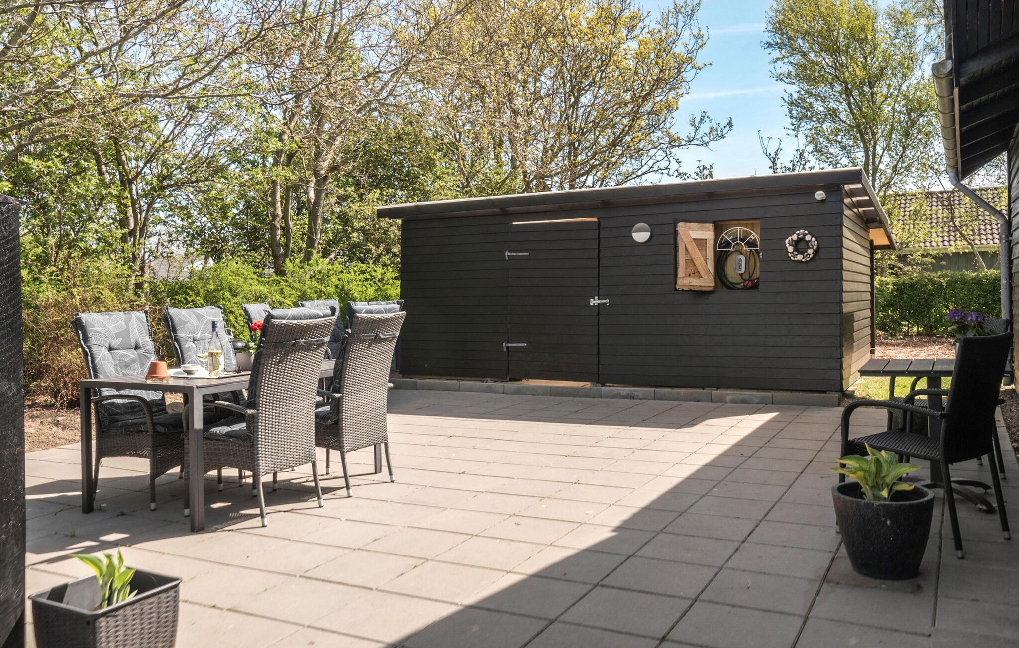Der er også gode muligheder for hyggestunder udenfor. Solbad i træterrassens liggestole eller nyd dagens måltider på terrassen. Læn jer tilbage i vildmarksbadet og nyd den friske prikkende luft en skøn aften under åben himmel. Den store have lægger op til leg, afslapning og livsnyderi.