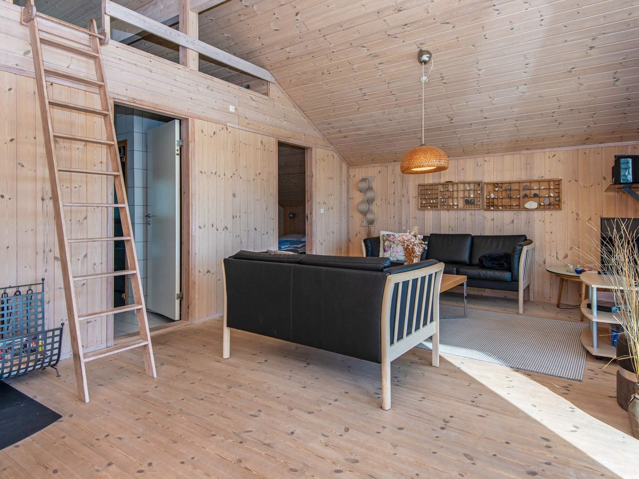 Den velindrettede bolig byder på et åbent køkken i forbindelse med opholdsstuen, som omfatter en hyggelig brændeovn og adgang til hems (oplægning). Fra stuen kan du træde direkte ud på en stor, solrig terrasse, ideel til at nyde måltider udenfor, slappe af i solen eller blot nyde de naturlige omgivelser.