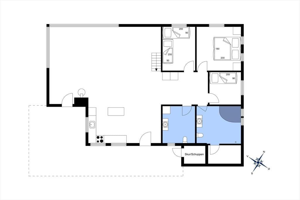 Det 103 m2 store sommerhus har en lys og venlig indretning, og møblementet er nøje udvalgt, så komforten er i top. Hvis der står indendørs hygge på ferieprogrammet, kan I slænge jer i stuens sofaafdeling, eventuelt med ild i brændeovnen og en god film på fladskærmen. Der er også spisebord i stuen, og et veludstyret køkken er på smart vis integreret med rummet. Mens de voksne laver mad og hyggesnakker, kan børnene tage trappen op til hemsen for at spille Playstation eller se DVD-film. Der er i øvrigt mulighed for at sove på hemsen, så I kan fordele jer her og på de tre soveværelser. Inden sengetid kan I eventuelt forkæle jer selv med en wellness-aften, for der er spabad og sauna på husets store badeværelse. Et gæstetoilet hører også med til planløsningen, så alt i alt er det et skønt sommerhus til seks personer.