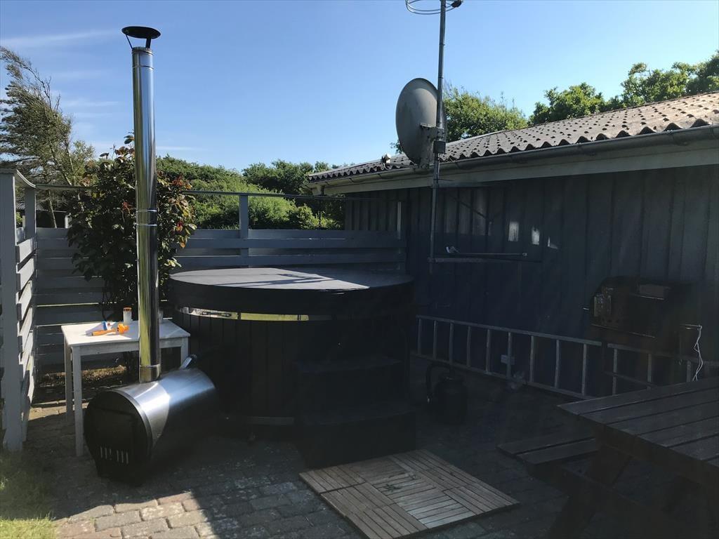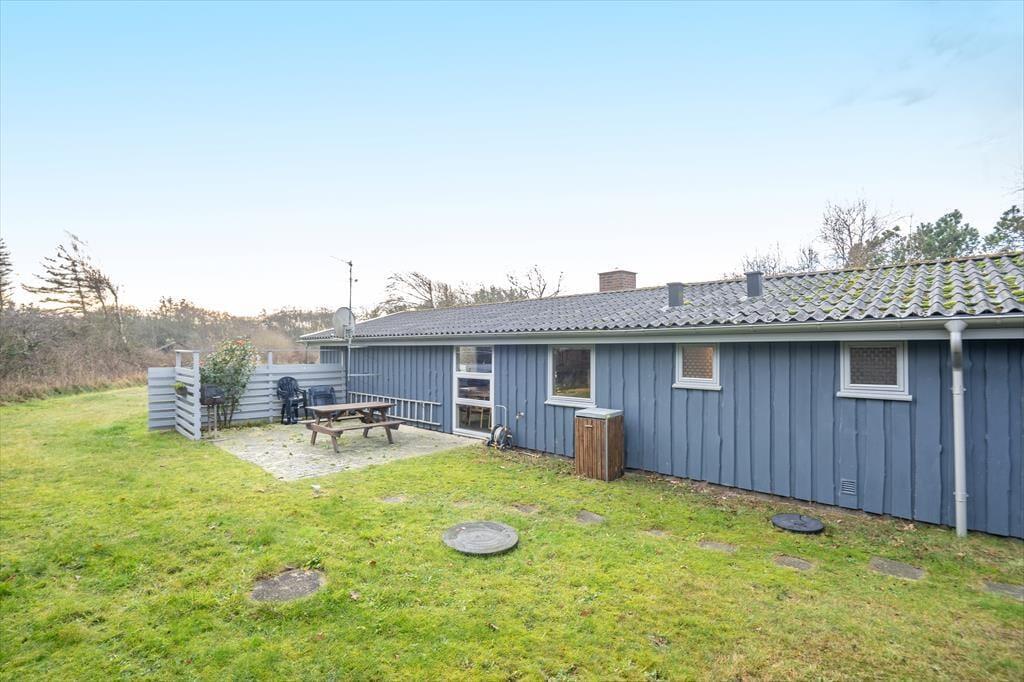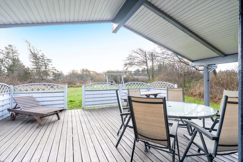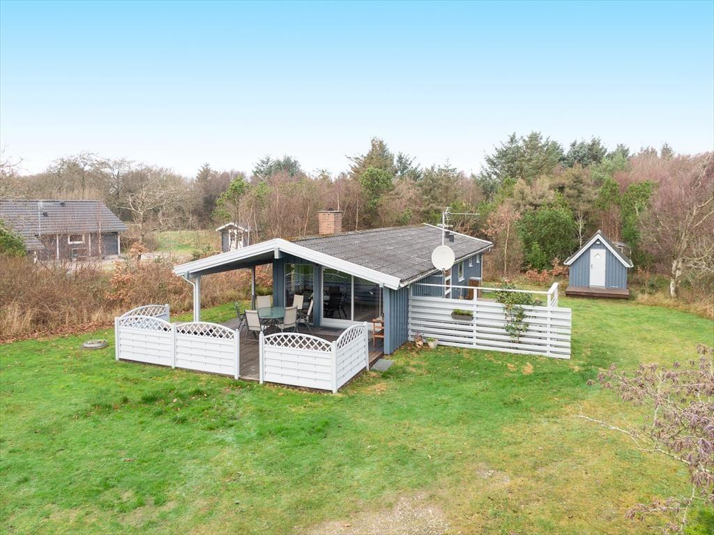 Udenfor venter den store, læfyldte naturgrund på over 2.000 m² – et fredfyldt fristed omgivet af træer og fuglefløjt. Her kan I virkelig mærke ferien sænke sig. På den sydvendte træterrasse finder I et skønt sted til morgenkaffen i solen, frokost i det fri og lange grillaftener under stjernerne. Om morgenen dukker solen frem på den østvendte terrasse, hvor dagens første stråler kan nydes i ro og mag. Haven indbyder til leg, boldspil og udeliv – og de firbenede gæster vil elske at have så god plads at boltre sig på.