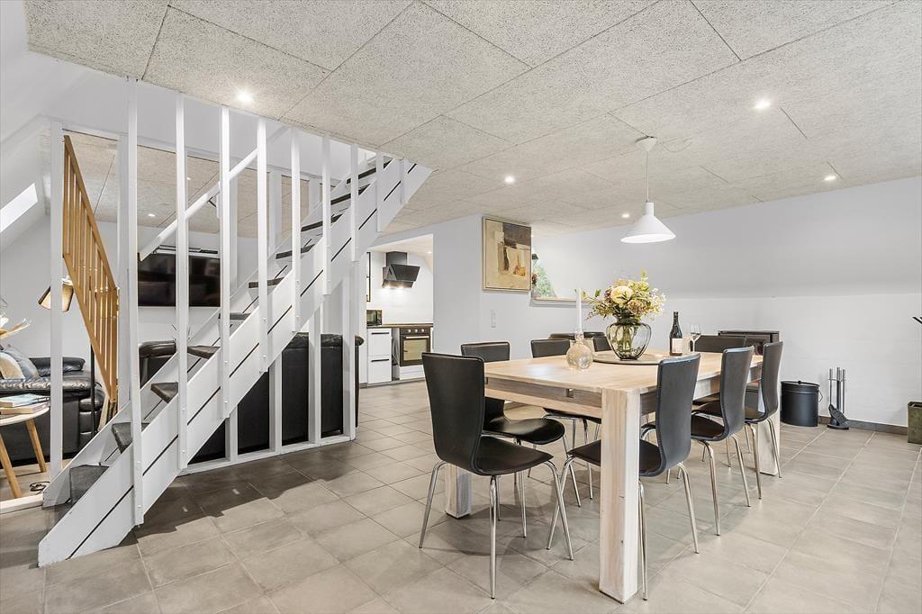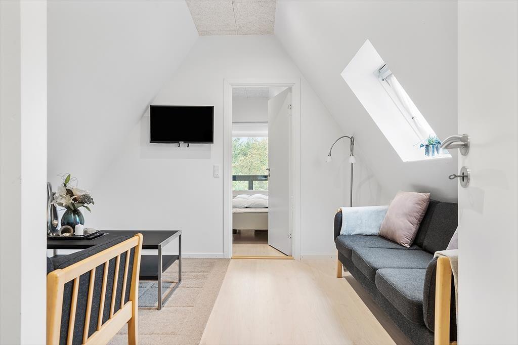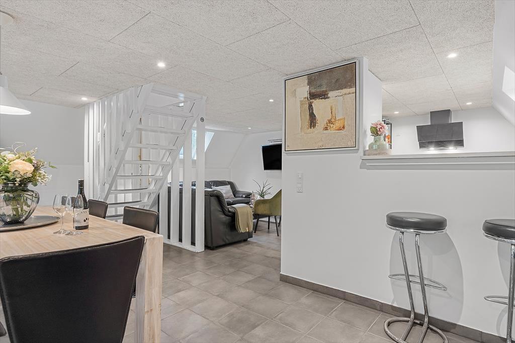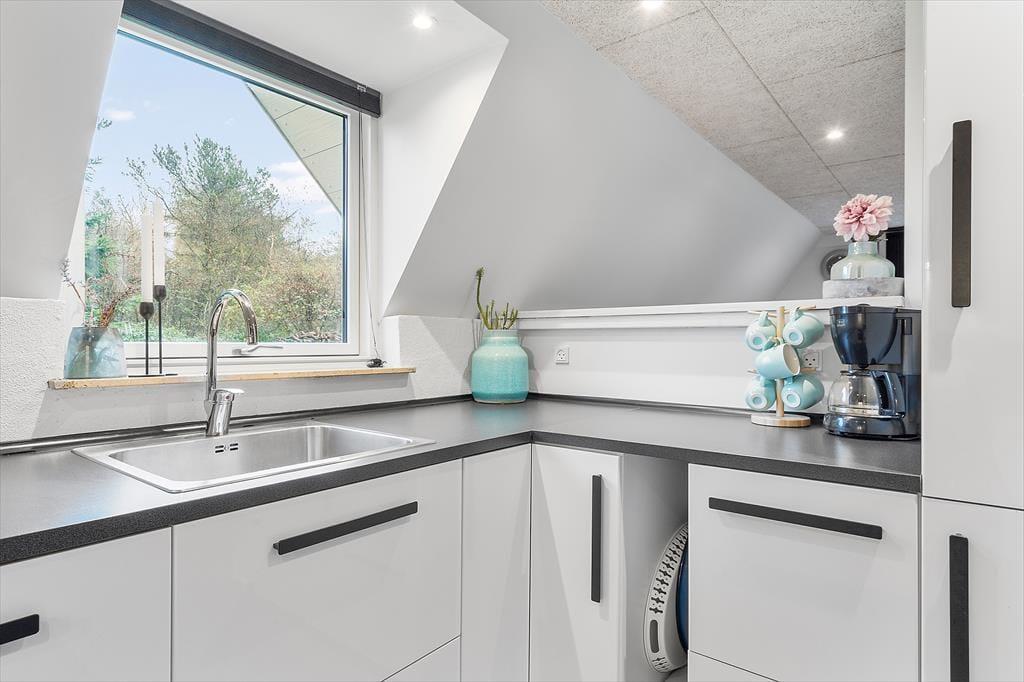 Som på et typisk A-hus går taget næsten helt til jorden, og inden døre er der to plan, så i alt får I 100 m2 til rådighed. De skrå vægge er et charmerende træk, og stuens brændeovn er også en af de rare detaljer, der skruer op for hyggestemningen. Huset blev renoveret i 2021, så rummene fremstår lyse og indbydende – ikke mindst det dejlige opholdsrum, hvor stue og køkken er forenet. Når I kræser om maden i det moderne køkken, har I god kontakt til sofaafdelingen, hvis I vil hyggesnakke med resten af selskabet, og spisebordet har en dejlig placering nær det store, sydvendte vindue. Et brusebadeværelse og et soveværelse hører med til planløsningen i stueetagen, og hvis I tager trappen op, finder I en dejlig stue og yderligere to soveværelser.