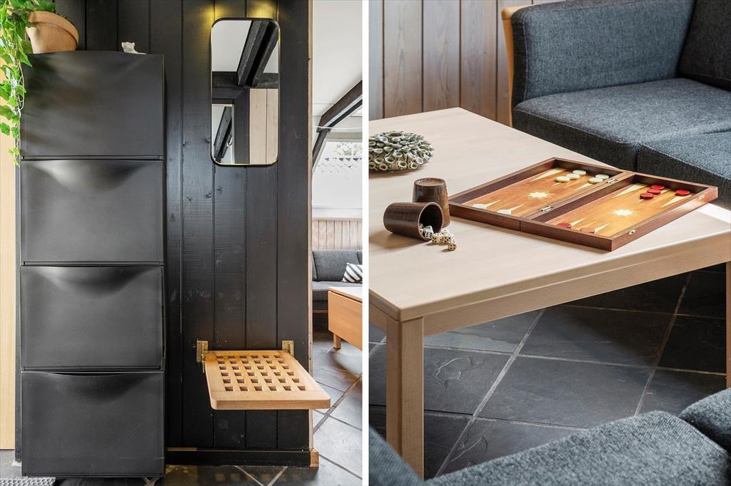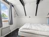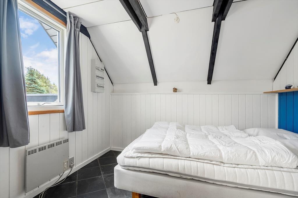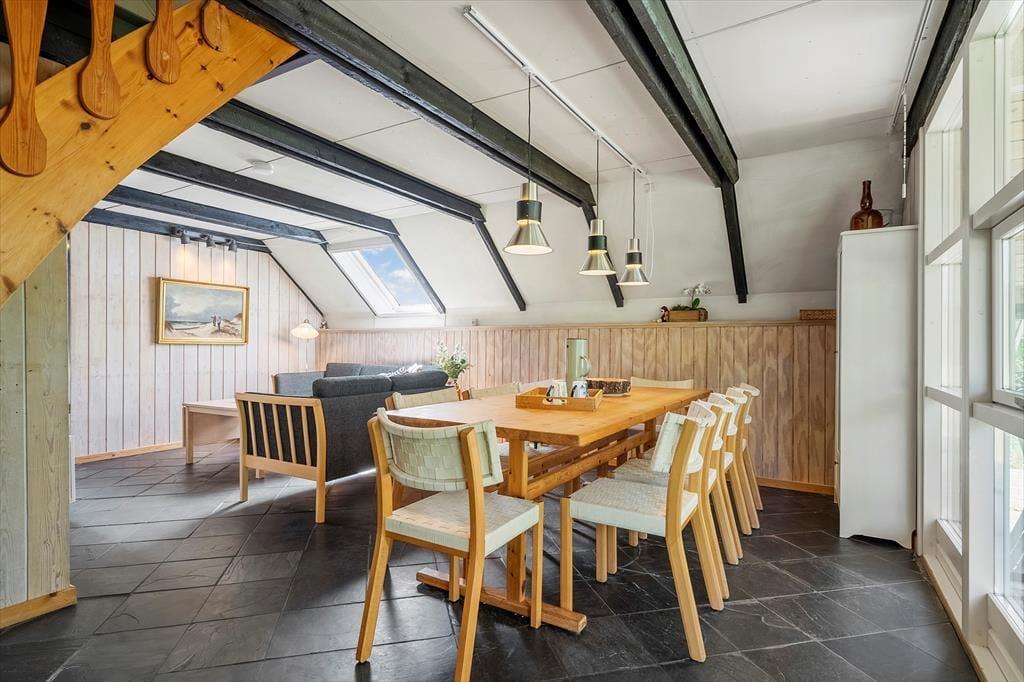 Fra stuen fører en trappe op til en hyggelig hems med lavt til loftet – perfekt til feriehygge og overnatning for både børn og voksne. Heroppe finder du et åbent rum ud mod trappen og ét, der kan lukkes af, så man får ekstra ro og privatliv. Alle madrasserne ligger på gulvet – både af hensyn til de skrå vægge og for at udnytte pladsen bedst muligt. Det gør hemsen særligt velegnet som børne- eller teenagerum, hvor man kan trække sig tilbage og finde sin egen ferieoase.