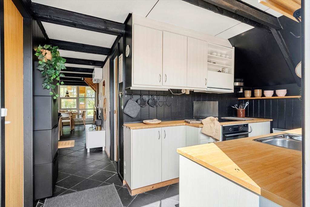 Når du træder indenfor i sommerhuset på Sivsangervej 24, mærker du straks den varme og uformelle stemning. Her er plads til både leg, latter og lange samtaler over middagsbordet. Spisestuen binder køkken og udestue sammen, og det bliver hurtigt familiens samlingspunkt i de lyse timer. Udestuen er en særlig perle, hvor du nærmest sidder midt i naturen, men stadig i læ – og herfra har du et skønt udsyn til haven, uanset årstid og vejr.