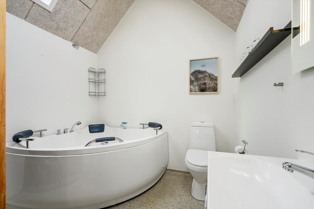 Sommerhuset råder over to badeværelser. Det ene finder du i huset og det andet er placeret i annekset, som du tilgår fra terrassen. I annekset finder du både vaskemaskine, tørretumbler og et ekstra køle-/fryseskab. Herfra træder du direkte ind i det rummelige badeværelse med både spabad og infrarød sauna – et skønt retreat til afslapning efter en lang dag i naturen eller ved stranden.