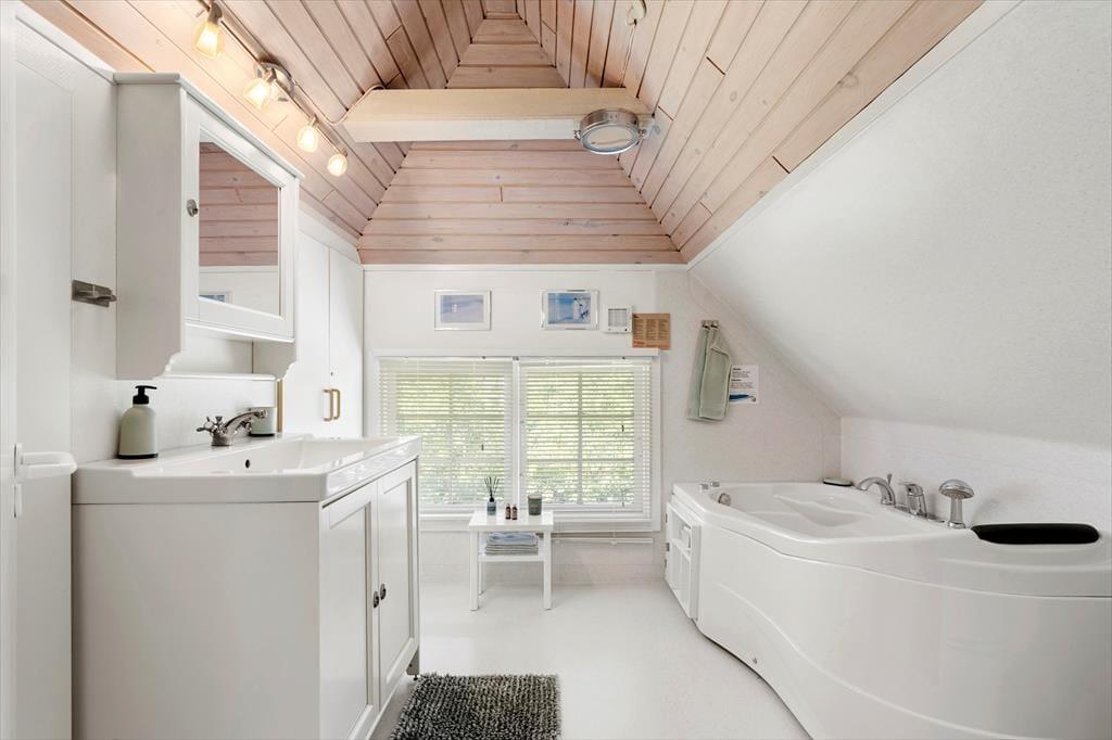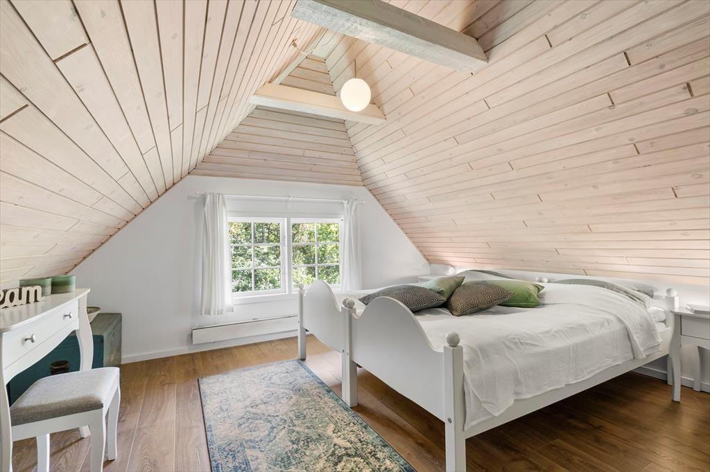 Det 101 m2 store sommerhus har en skøn planløsning til seks personer fordelt på to plan. Den hyggelige og personlige indretning byder på mange skønne detaljer, lige fra stuens pejseindsats og til badeværelsets spabad, der tilføjer lidt ekstra wellness til ferien. Badeværelset ligger på førstesalen, hvor I også finder et af husets tre soveværelser. De to øvrige soverum ligger i stueplan sammen med et brusebadeværelse og en stue med direkte forbindelse til et veludstyret køkken. Huset byder i øvrigt på en god wi-fi-forbindelse, en energivenlig varmepumpe og et stort fladskærms-tv med Chromecast, så kort sagt har I alt, hvad I skal bruge for at nyde livet og slappe af inden døre.