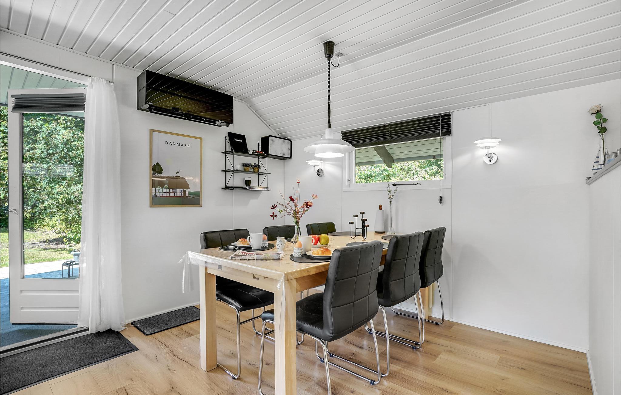 Hjertet i det smukke sommerhus er den store stue med et sofahjørne, hvor I kan bruge mange timer på at læse eller nyde varmen fra brændeovnen på kølige dage. Her finder I også det åbne køkken og et spisebord, der inviterer jer til at nyde en hyggelig middag eller spille brætspil.