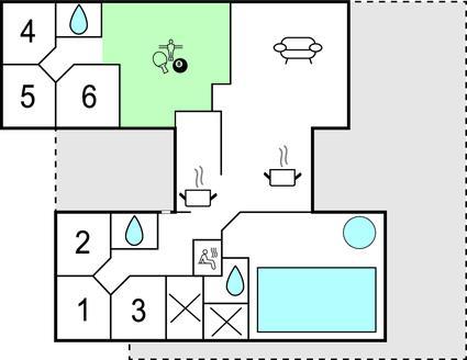 Det er indrettet med hele seks gode soveværelser, en hems til fire personer, stort køkken/alrum/stue, lækkert poolområde med både stor spa og sauna, tre badeværelser og et aktivitetsrum med diverse spil. Udenfor kan I nyde solen på den overdækkede terrasse, mens børnene hygger sig i sandkassen eller på gyngerne. Feriehuset ligger på Lodbjerghede, som er et yndet feriehusområde på grund af de rolige omgivelser og korte afstand til det meste. I området ligger der bl.a. en fiskesø, en stor golfbane, som henvender sig til både begyndere og øvede, med henholdsvis 9 og 18 huller, legepladser til de mindste m.m.