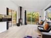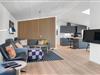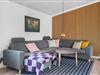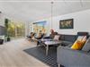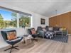 Skøn og lyst indrettet opholdsstue på Porsevej 2 med brændeovn