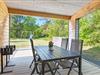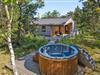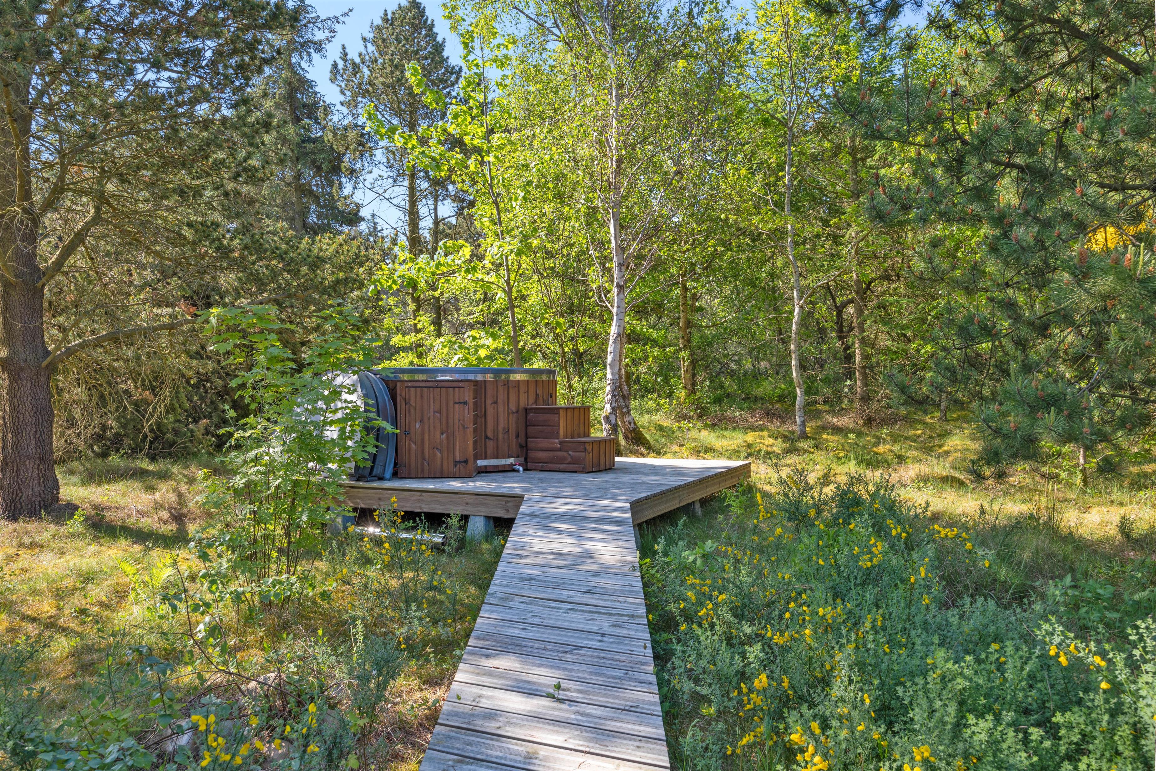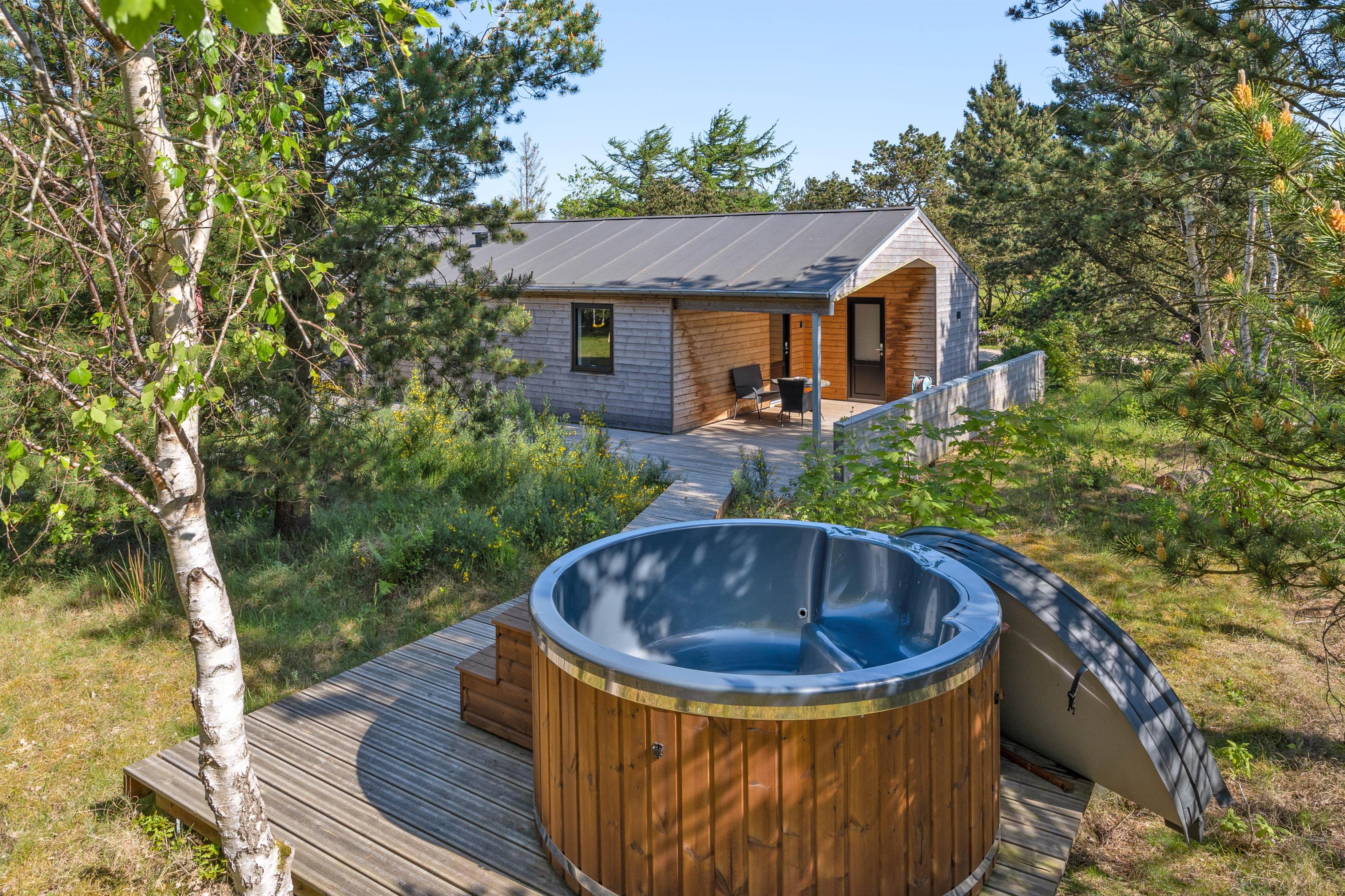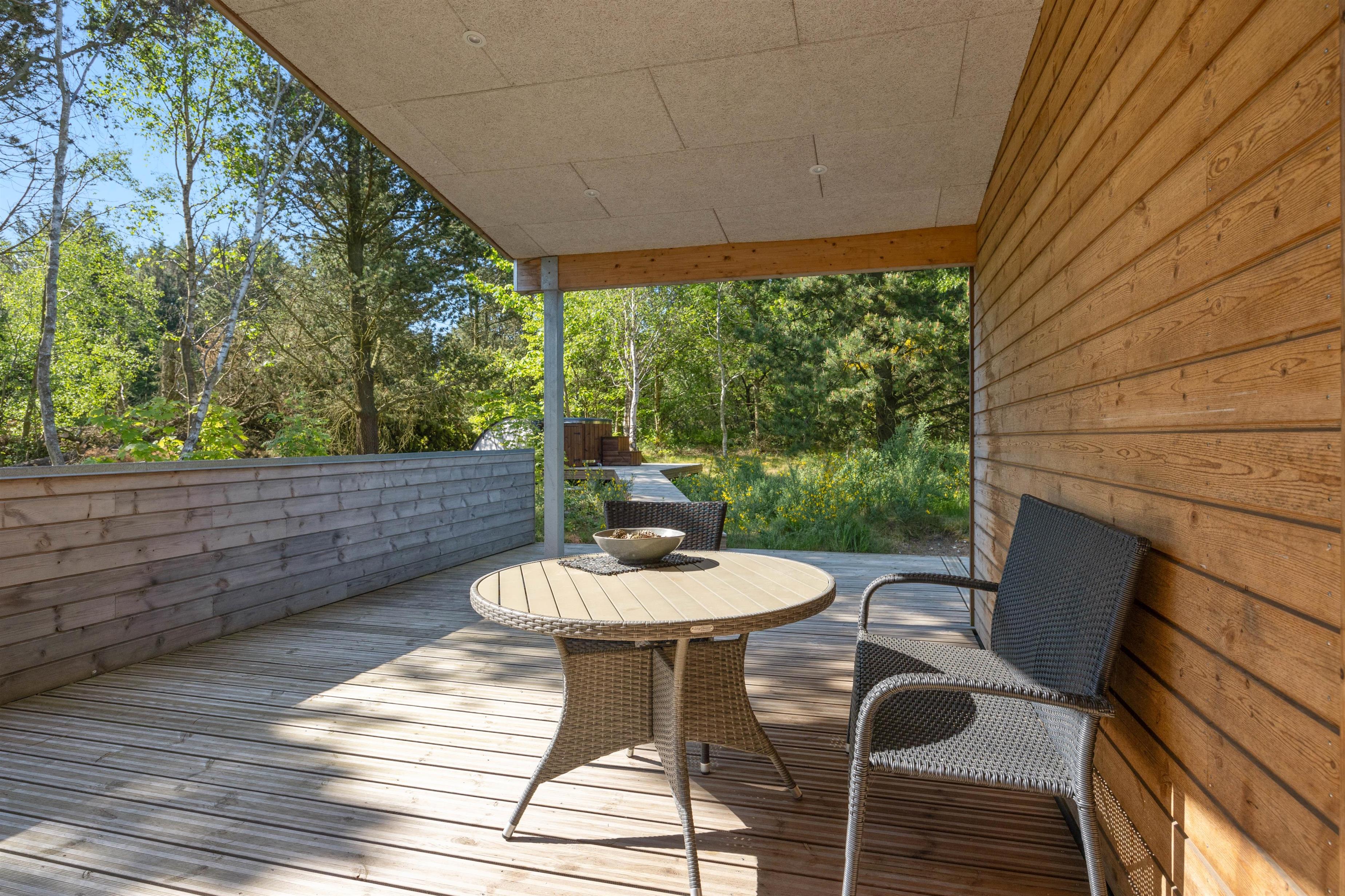 Når I holder jeres ferie her, vil I uden tvivl nyde at boltre jer på den store plænegrund, som omgiver sommerhuset. Den store træterrasse som går rundt om huset har en hyggelig lille sti til en træplatform, hvor feriehusets vildmarksbad befinder sig. Vildmarksbadet opvarmes via en gasovn, så opvarmningen af vandet går nemt og hurtigt. Terrassen er delvist overdækket, så man kan nyde haven, også selvom solen ikke skinner. Der er både grill, havemøbler og solvogne til fri afbenyttelse.