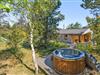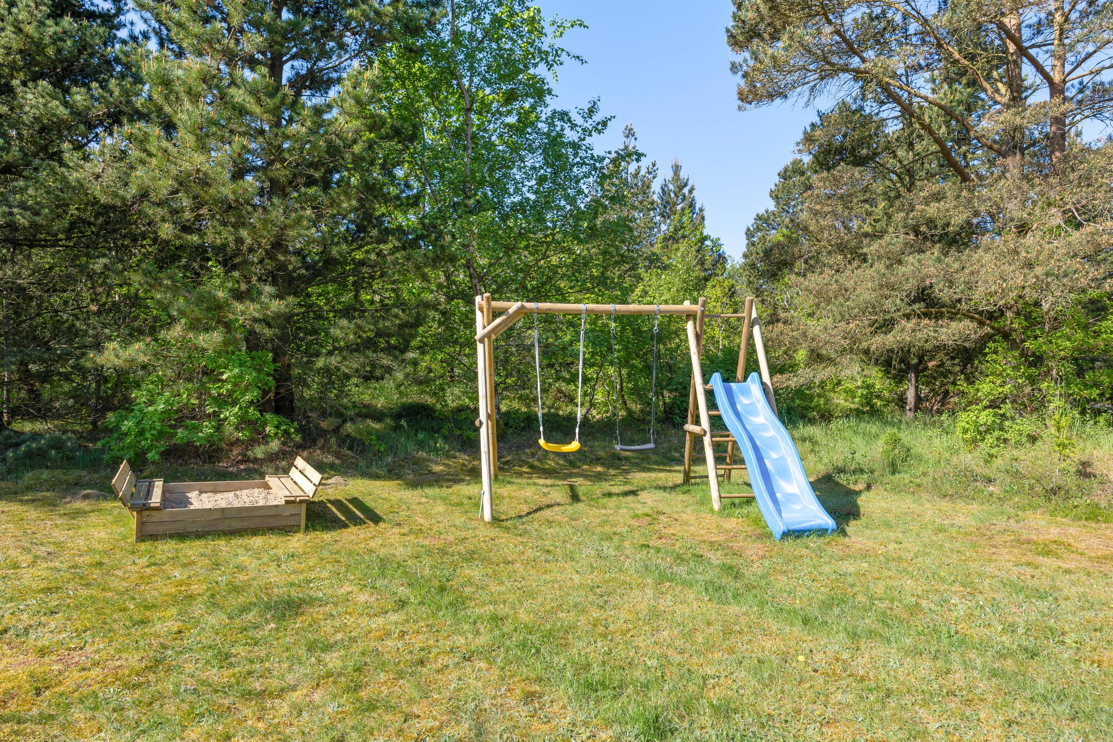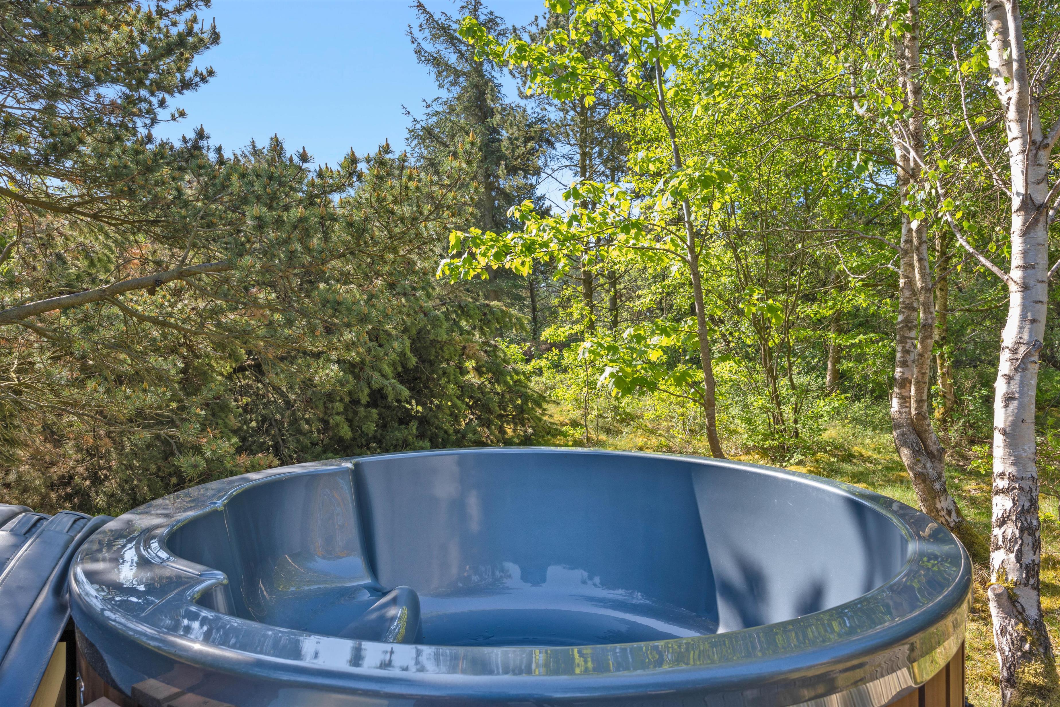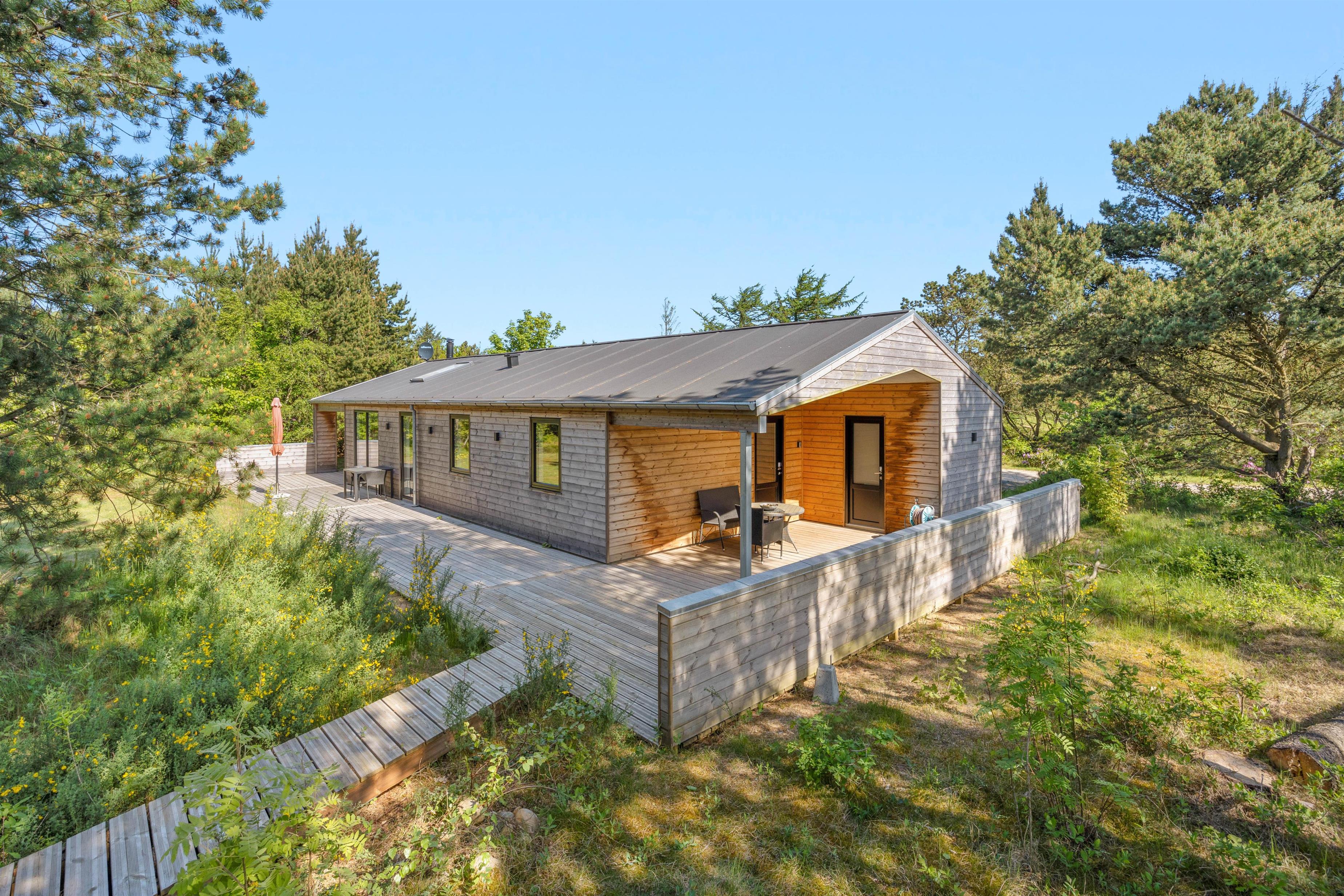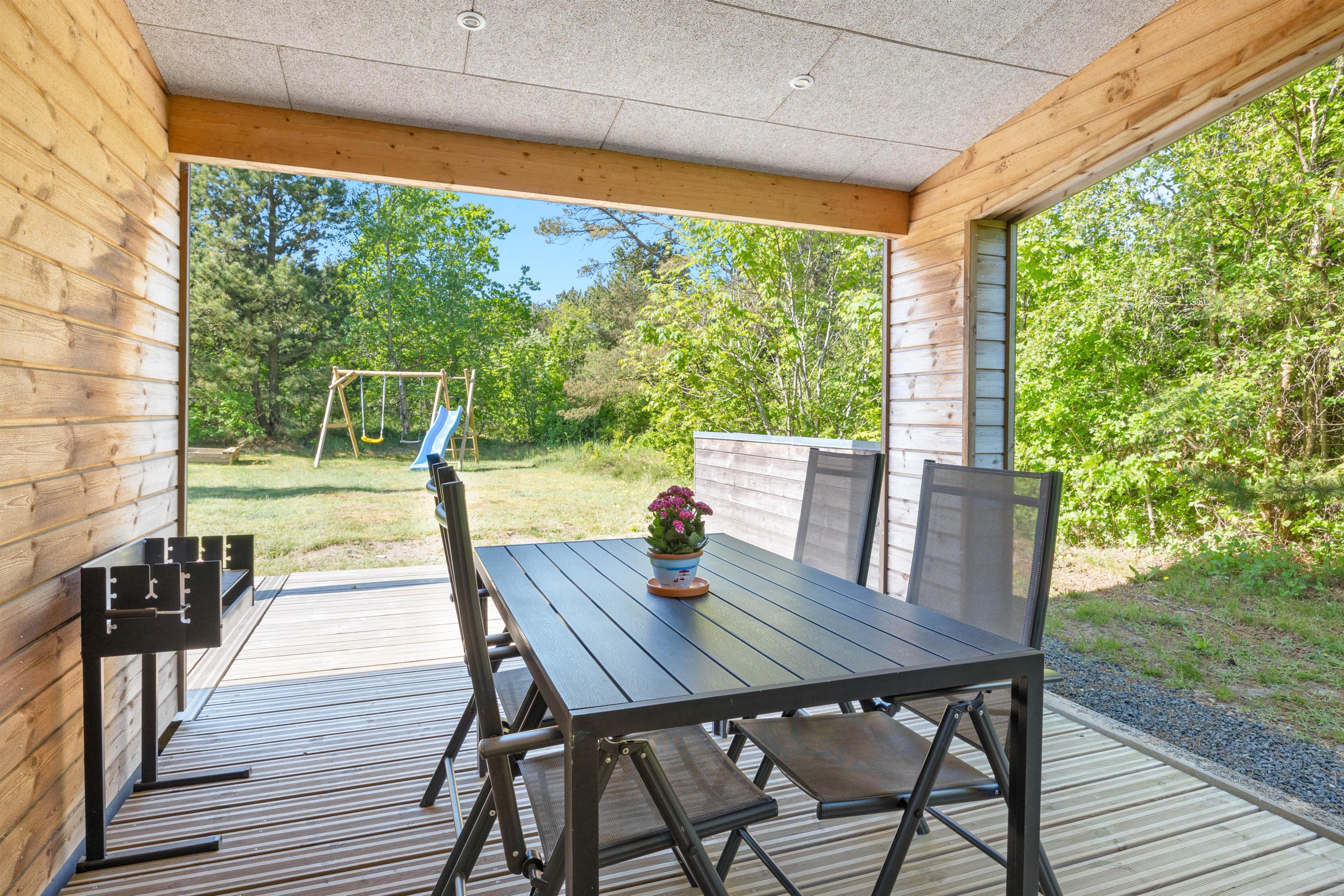 Når I holder jeres ferie her, vil I uden tvivl nyde at boltre jer på den store plænegrund, som omgiver sommerhuset. Den store træterrasse som går rundt om huset har en hyggelig lille sti til en træplatform, hvor feriehusets vildmarksbad befinder sig. Vildmarksbadet opvarmes via en gasovn, så opvarmningen af vandet går nemt og hurtigt. Terrassen er delvist overdækket, så man kan nyde haven, også selvom solen ikke skinner. Der er både grill, havemøbler og solvogne til fri afbenyttelse.