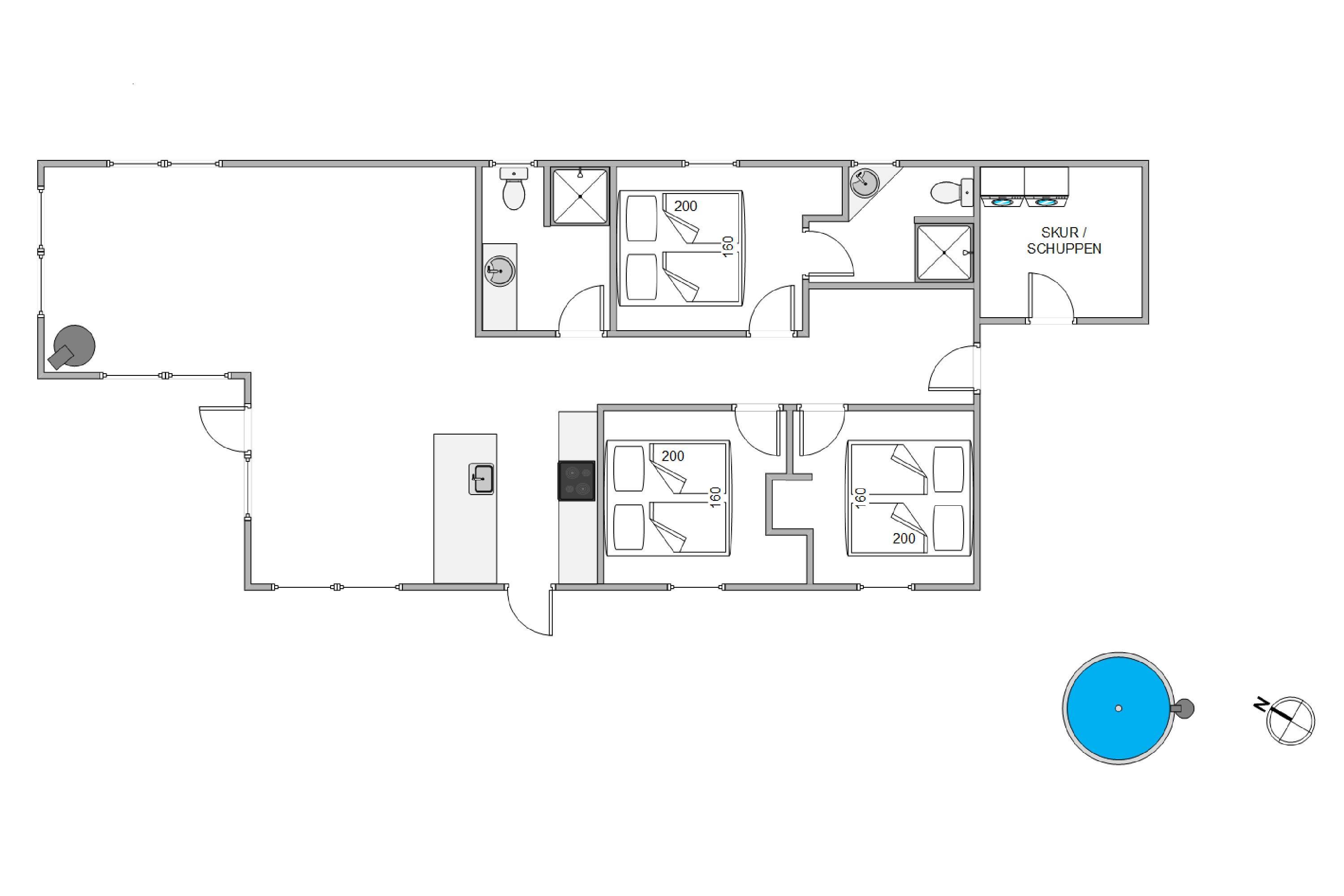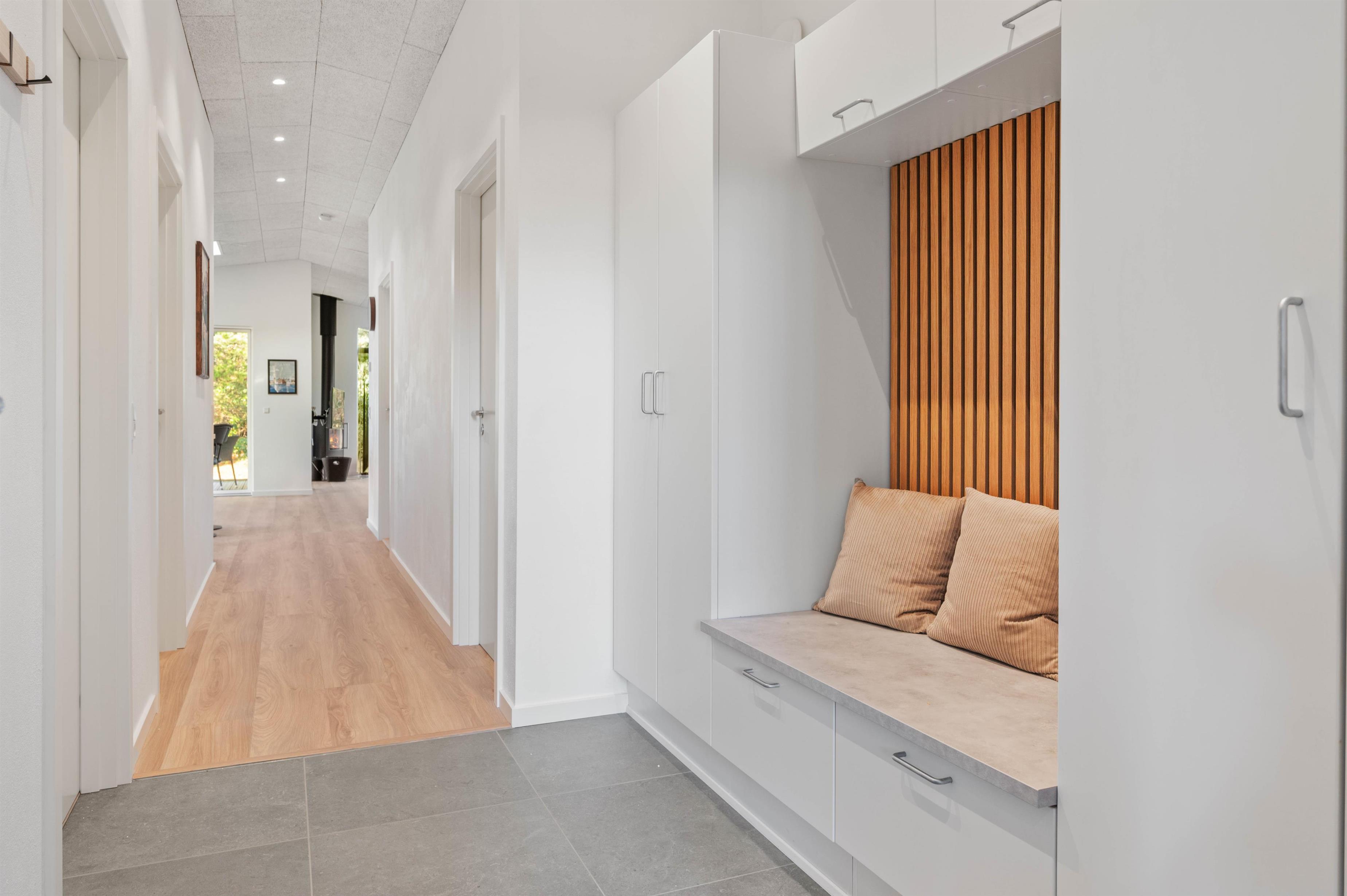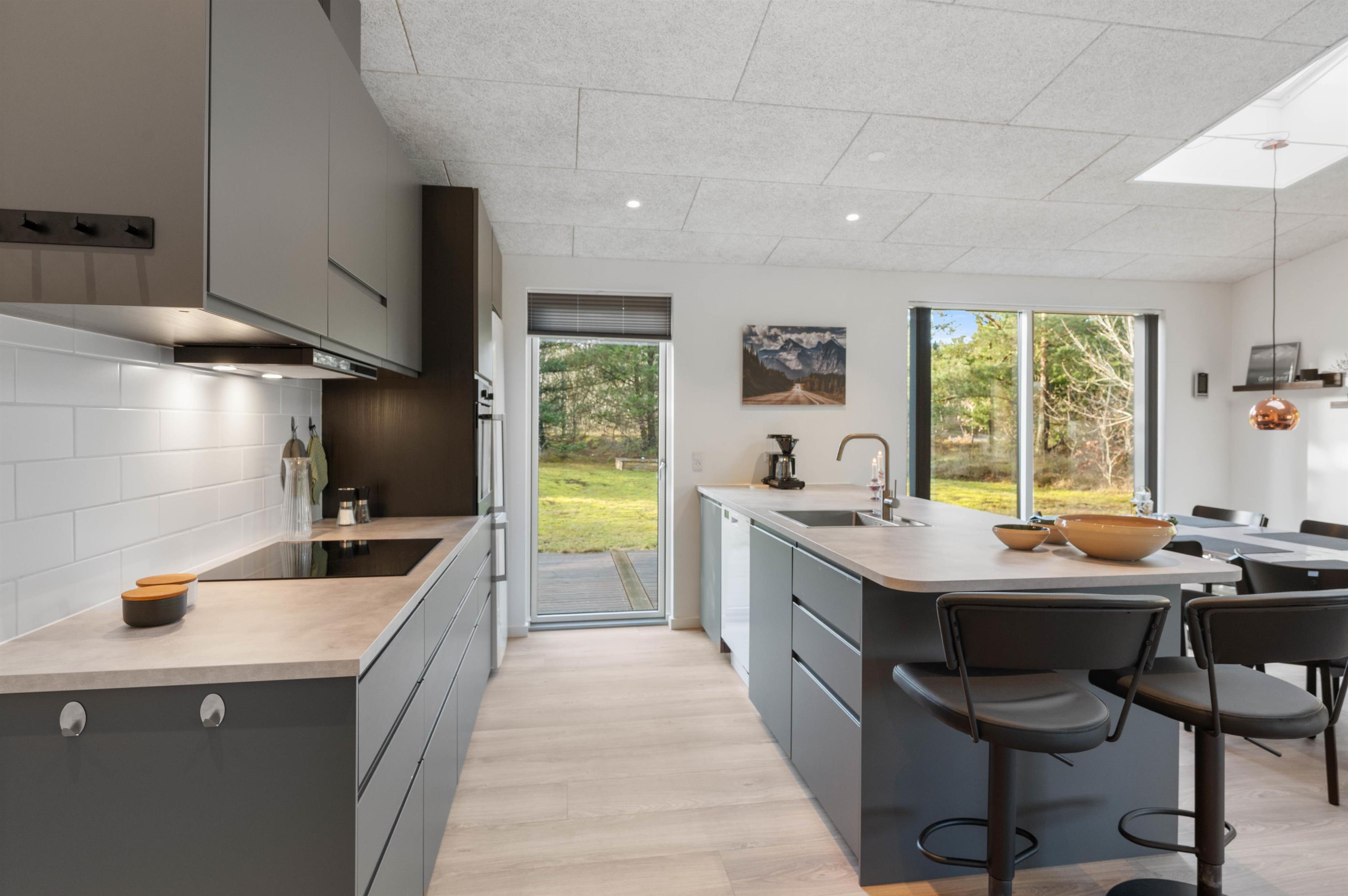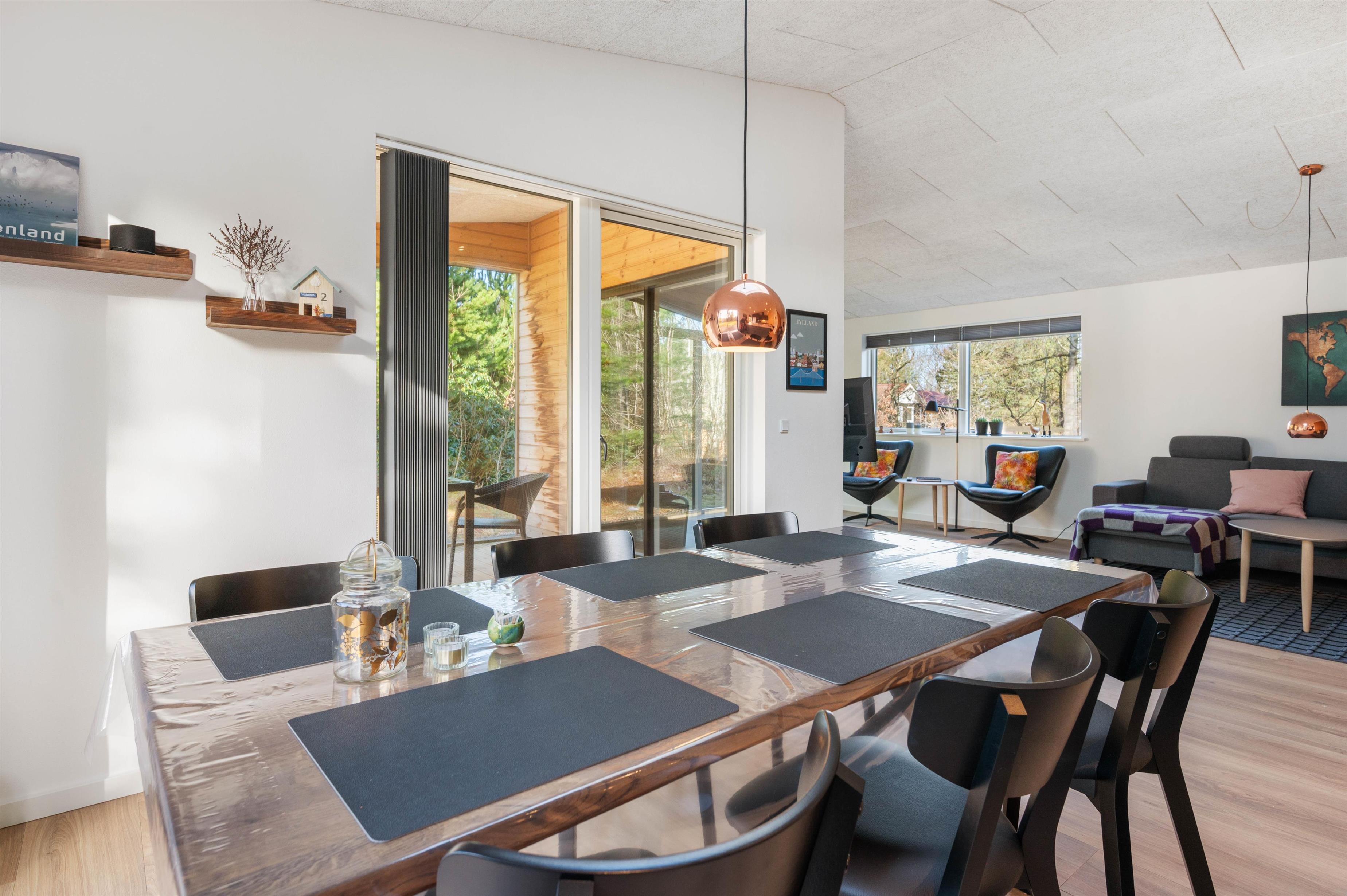 Så snart I træder ind ad døren til Porsevej 2, bliver i mødt af et virkelig lækkert og moderne sommerhus i skandinavisk stil. Både køkken, stue og opholdsstue er indrettet som ét stort rum, så I kan følge med i feries fælles aktiviteter, lige fra madlavning til planlægning. Fra stuen har I direkte adgang ud til husets dejlige, delvist overdækkede træterrasse. Og fra de store panoramavinduer er en køn udsigt til den store have. Sommerhuset fordeler sig på 3 soverum, alle med dobbeltsenge. Der er 2 badeværelser med gulvvarme og en luft-til-vand varmepumpe, som sørger for et behageligt indeklima.