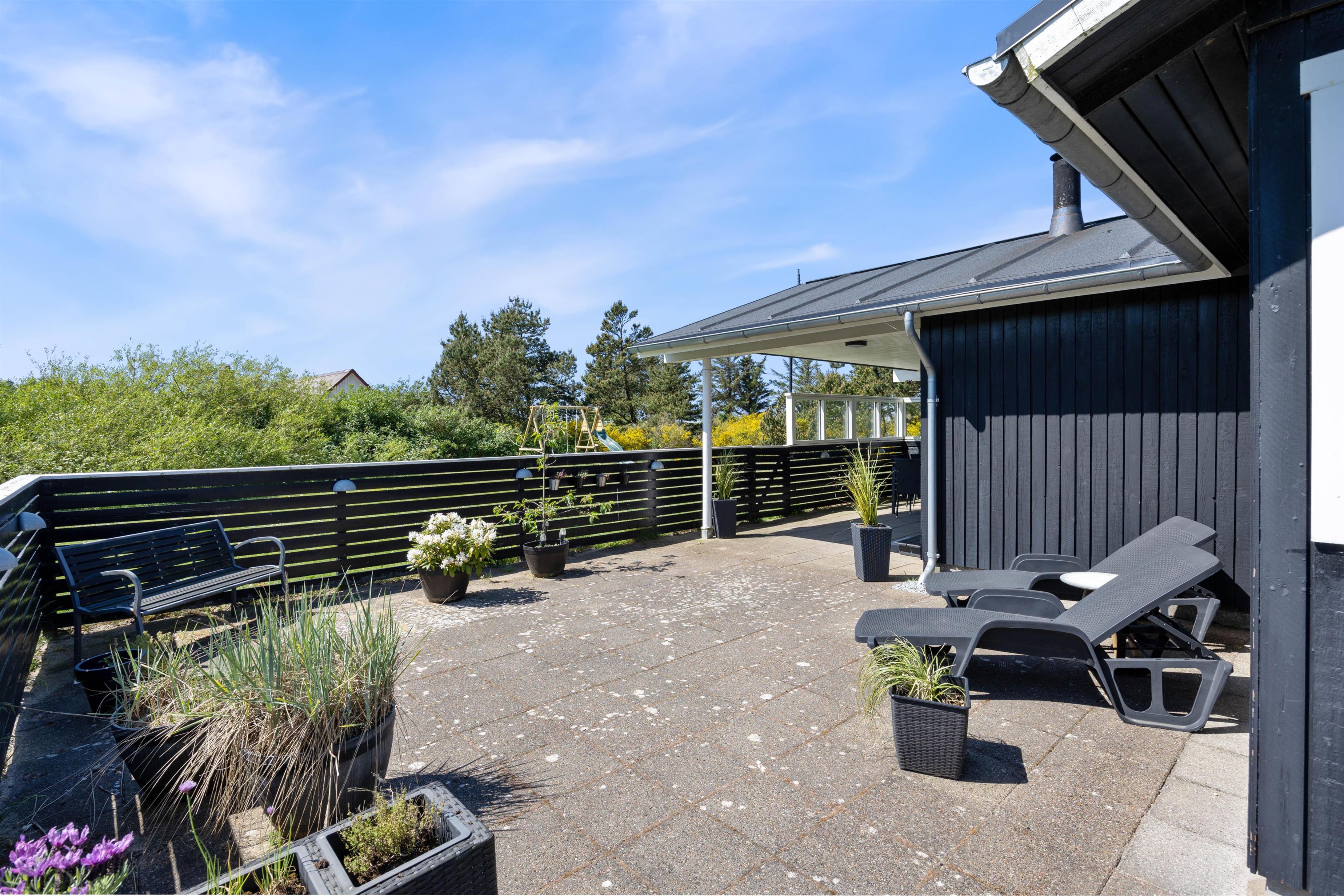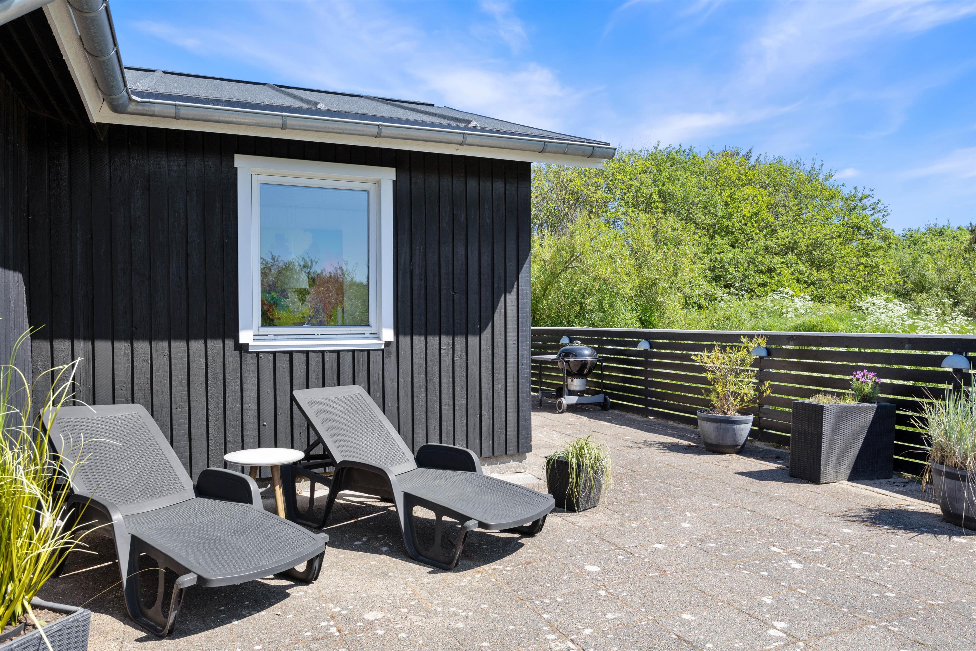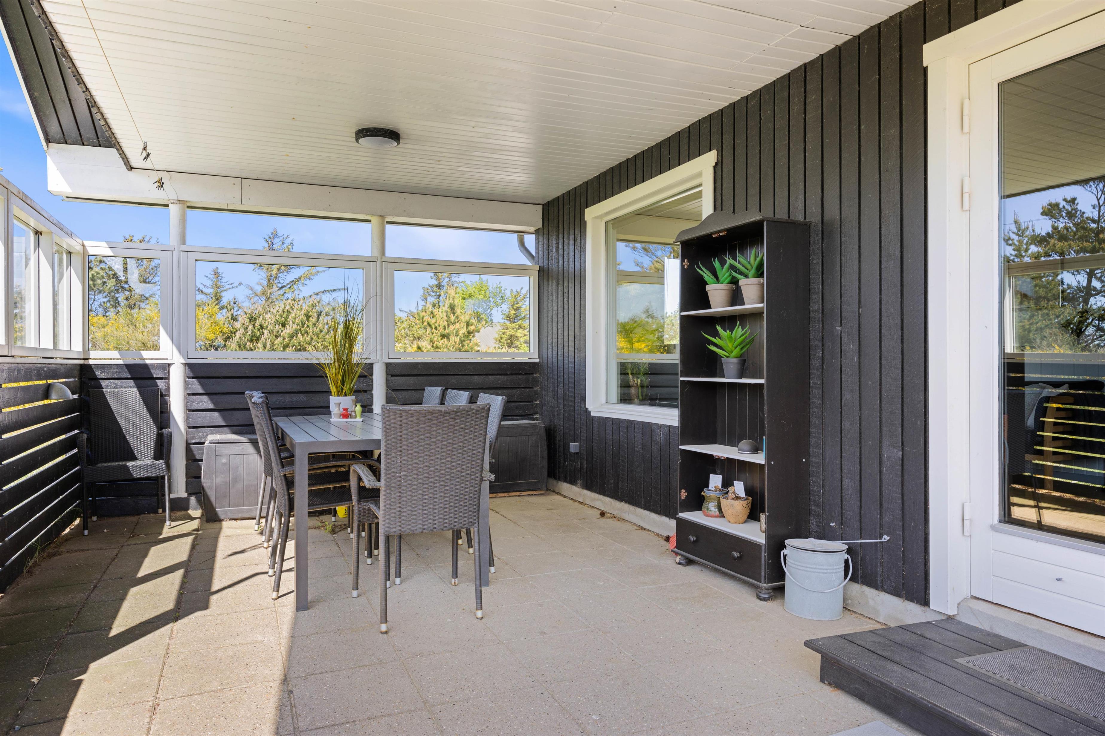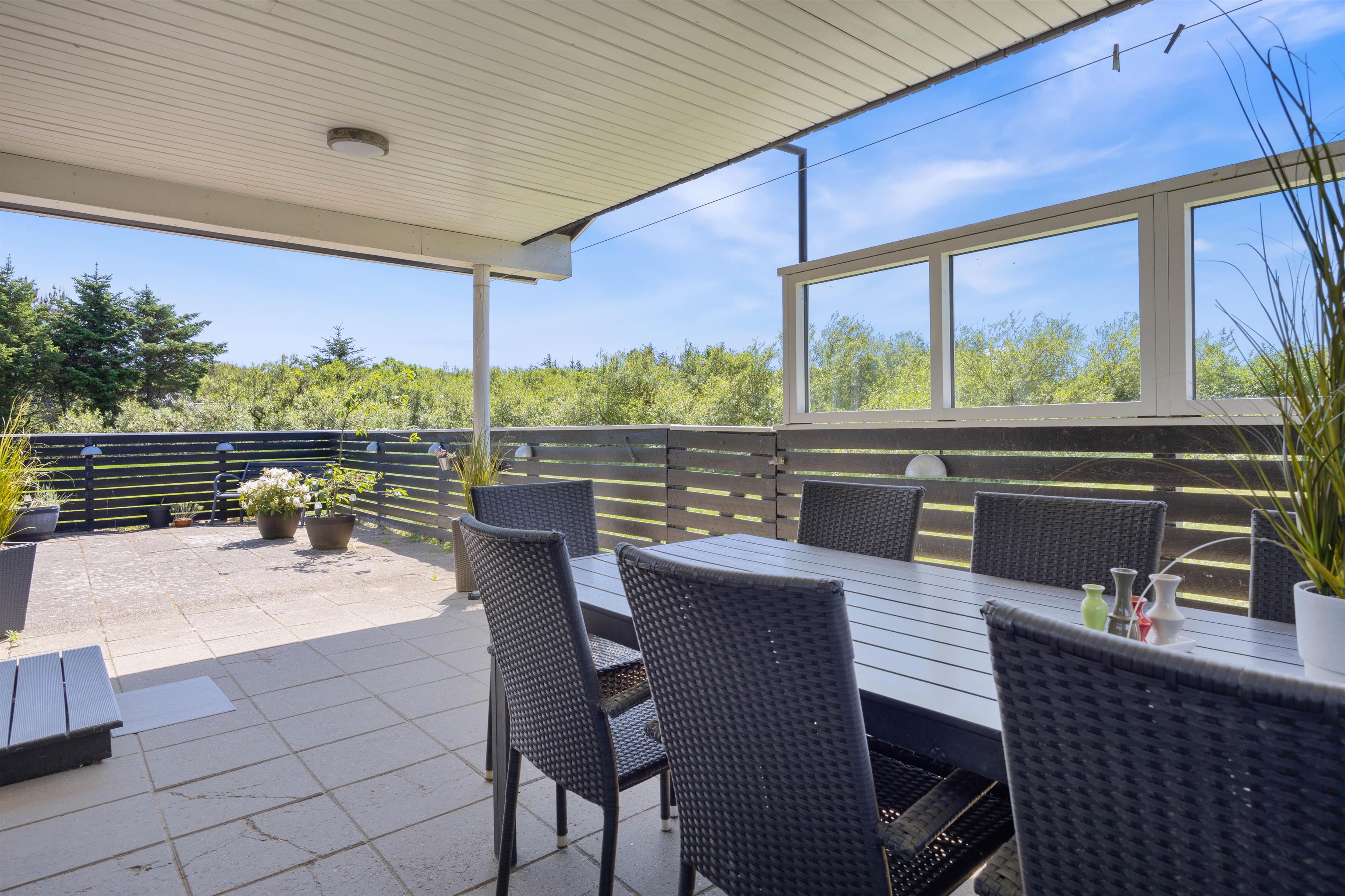 Fra opholdsrummet er der direkte udgang til feriehusets store terrasse. Terrassen er lukket og delvist overdækket, hvilket gør den særdeles velegnet til børnefamilier og hundeejere. Her kan de små færdes frit, mens de voksne slapper af. Der er masser af hyggelige kroge, I kan slå jer ned i, alt efter om I er på jagt efter sol eller skygge. Og så er der selvfølgelig både havemøbler, liggestole og grill til rådighed, ligesom der er belysning hele vejen rundt på terrassen.
