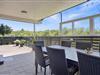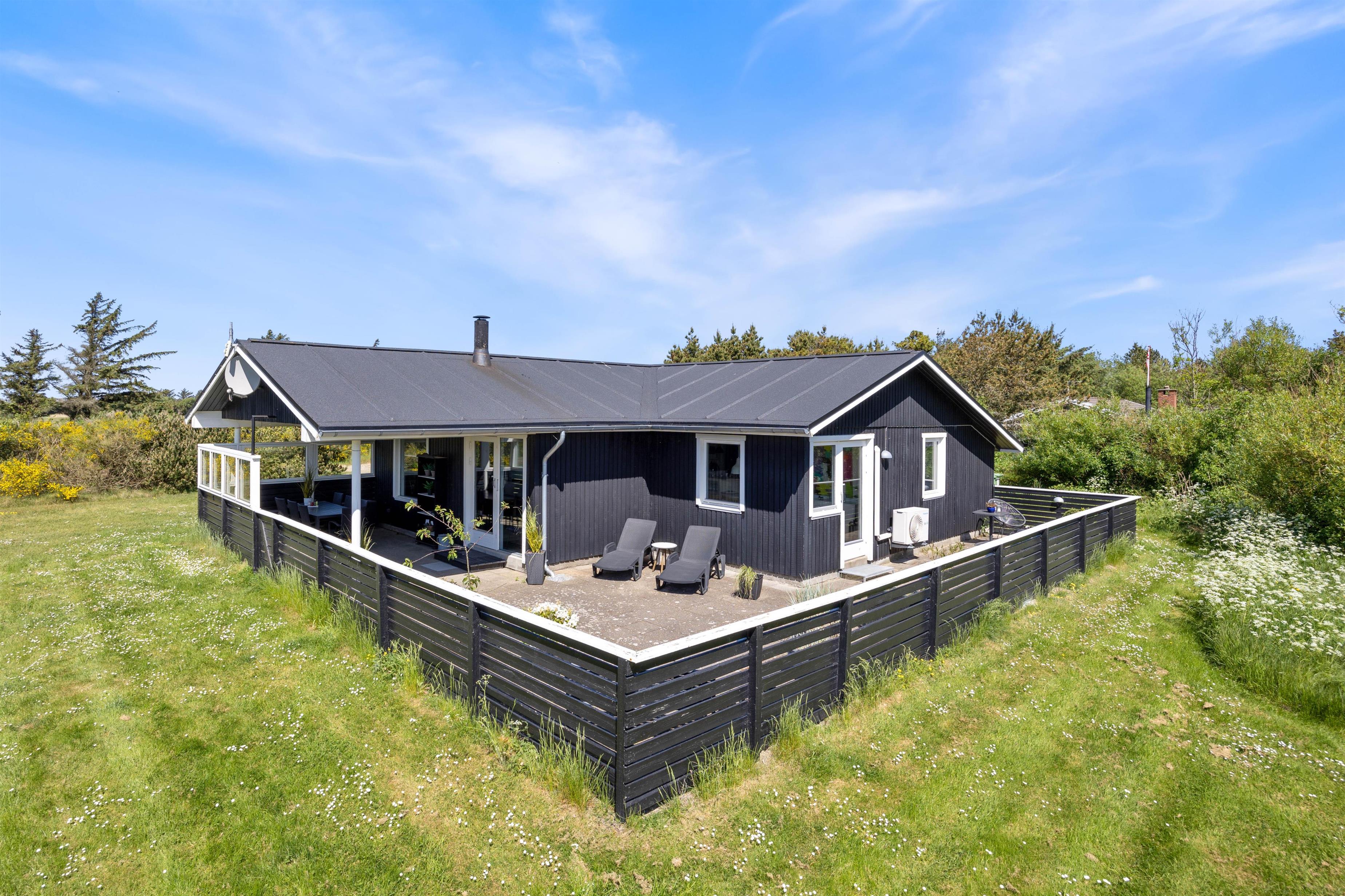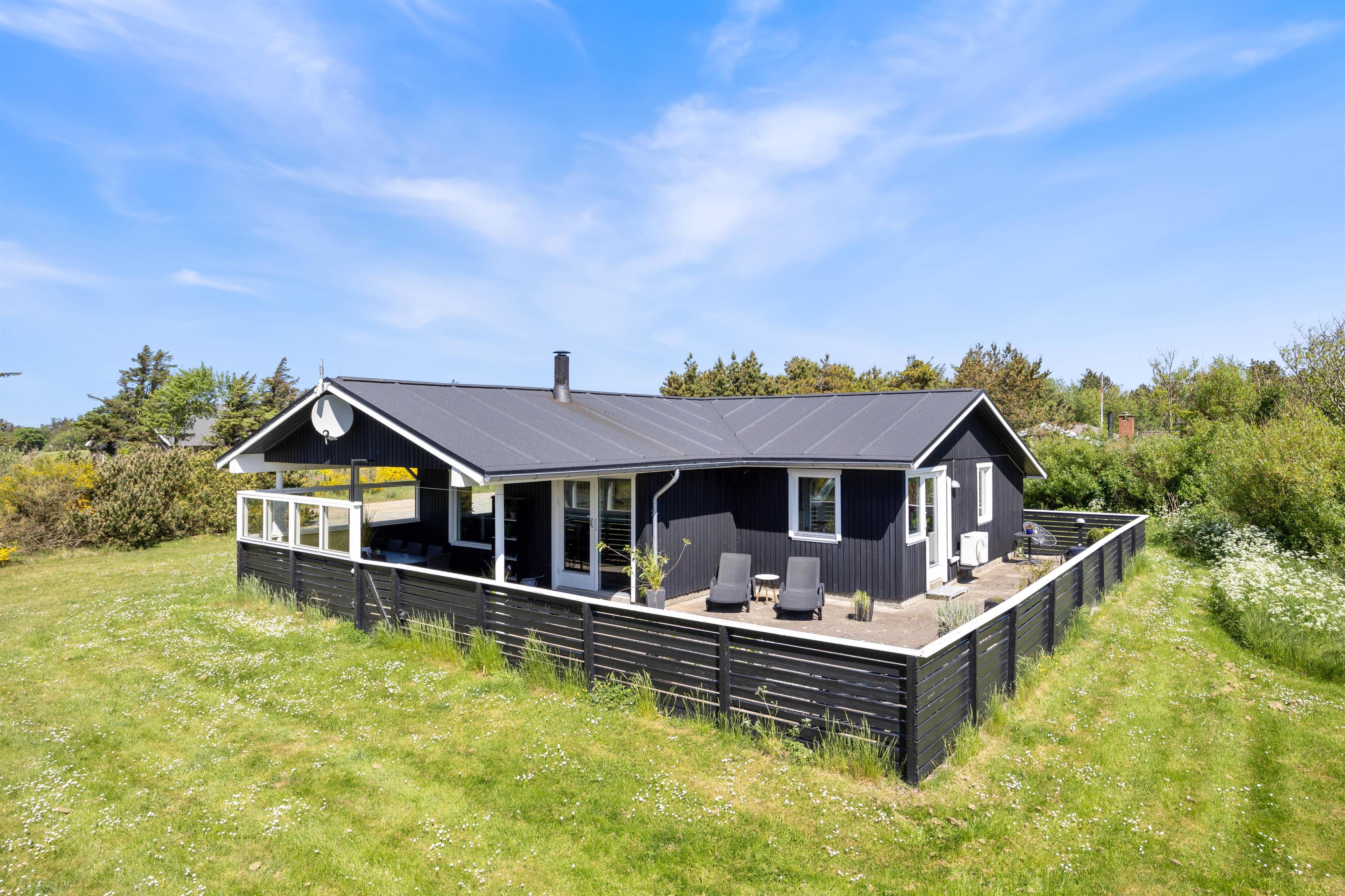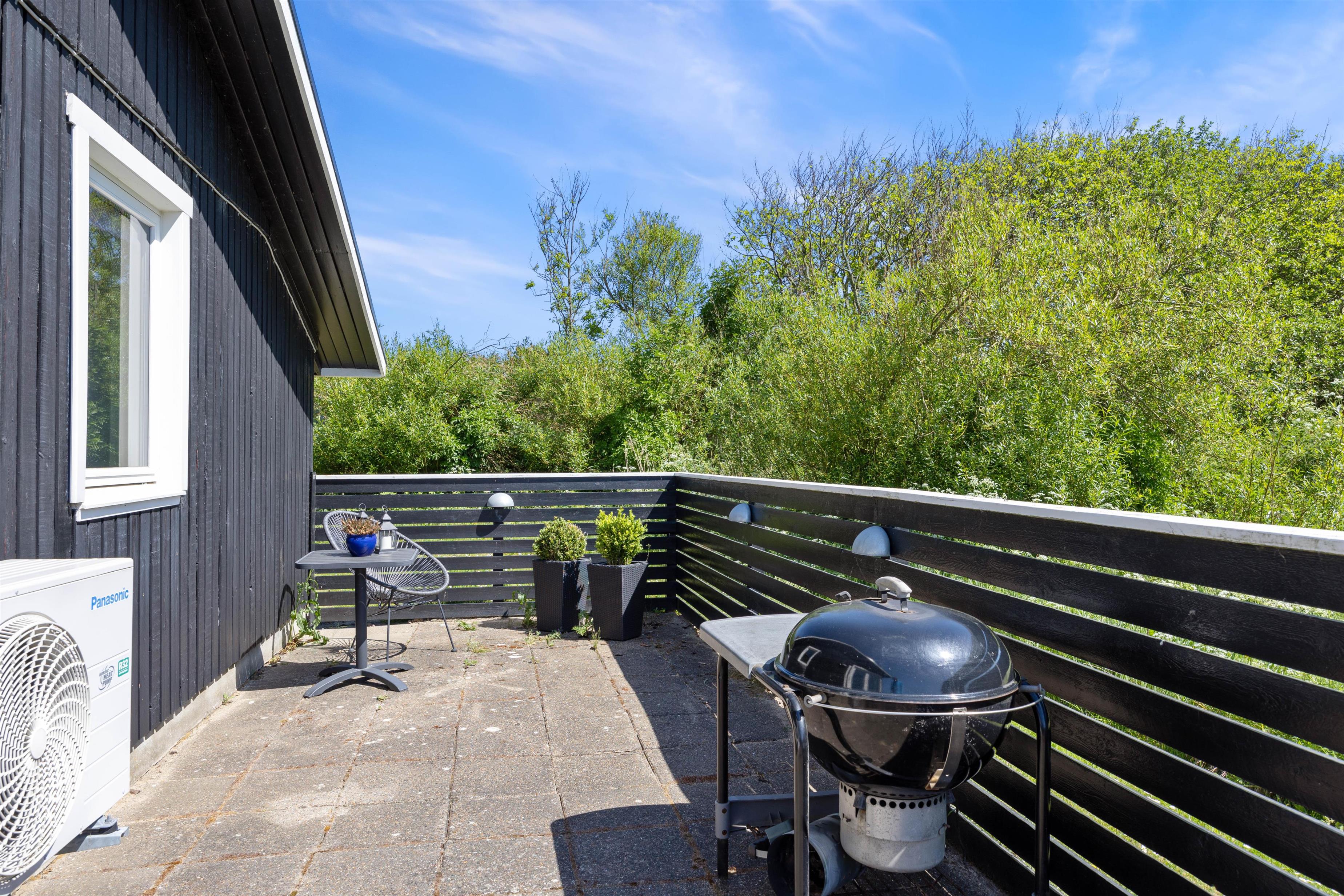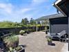 Fra opholdsrummet er der direkte udgang til feriehusets store terrasse. Terrassen er lukket og delvist overdækket, hvilket gør den særdeles velegnet til børnefamilier og hundeejere. Her kan de små færdes frit, mens de voksne slapper af. Der er masser af hyggelige kroge, I kan slå jer ned i, alt efter om I er på jagt efter sol eller skygge. Og så er der selvfølgelig både havemøbler, liggestole og grill til rådighed, ligesom der er belysning hele vejen rundt på terrassen.