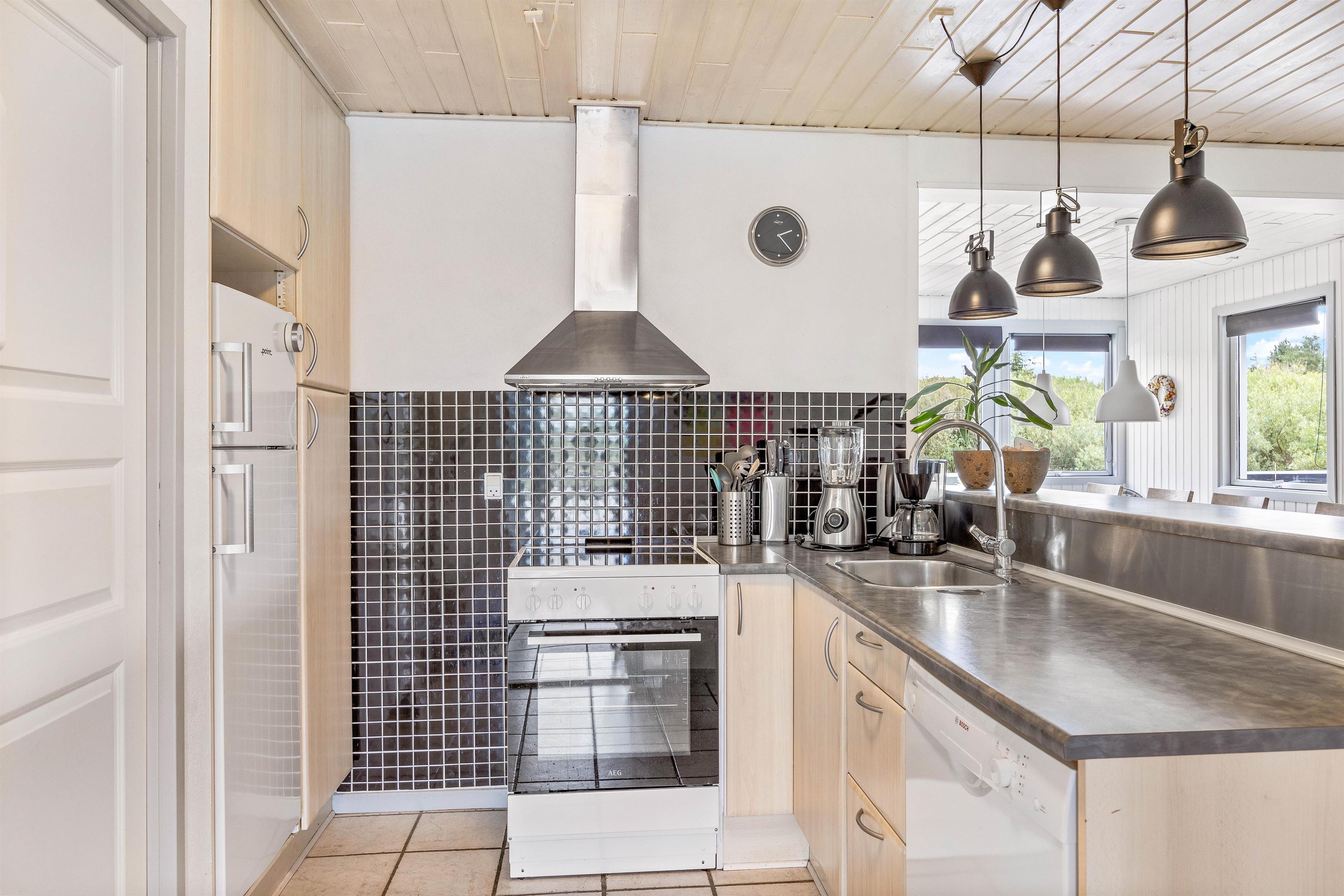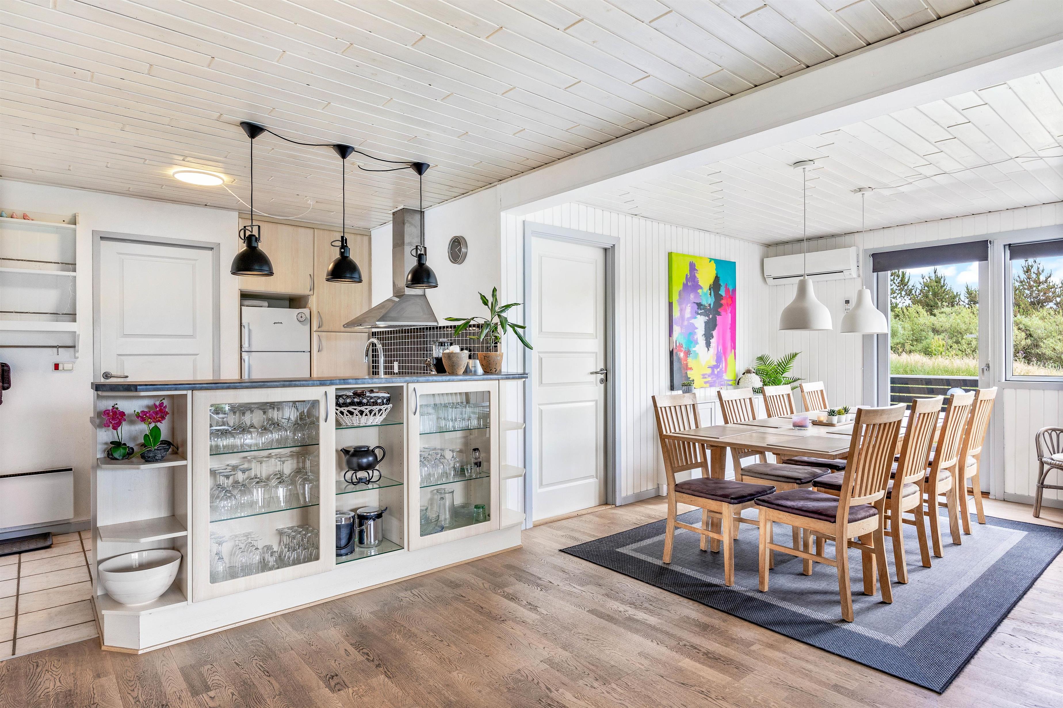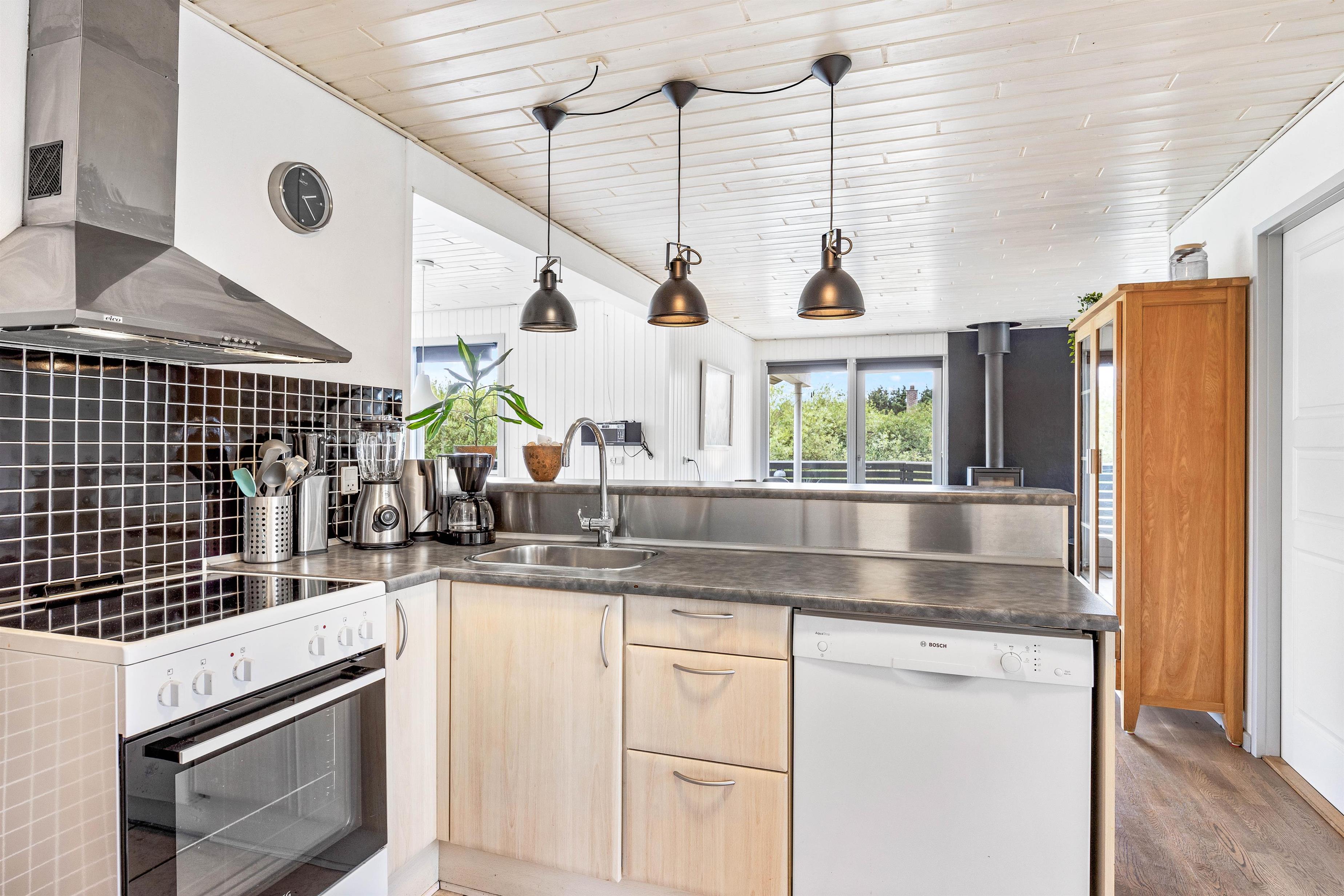 På Gransangervej 6 er omgivelserne virkelig skønne, lyse og åbne, og I vil helt sikkert føle jer hjemme straks. Det store opholdsrum, der forener køkken, spisekrog og stue, er husets hjerte og familiens samlingspunkt på ferien. Det flotte veludstyrede køkken har alt, hvad feriekokkene har brug for – inklusiv køleskab med 50 liters frysekapacitet, mikroovn og opvaskemaskine.