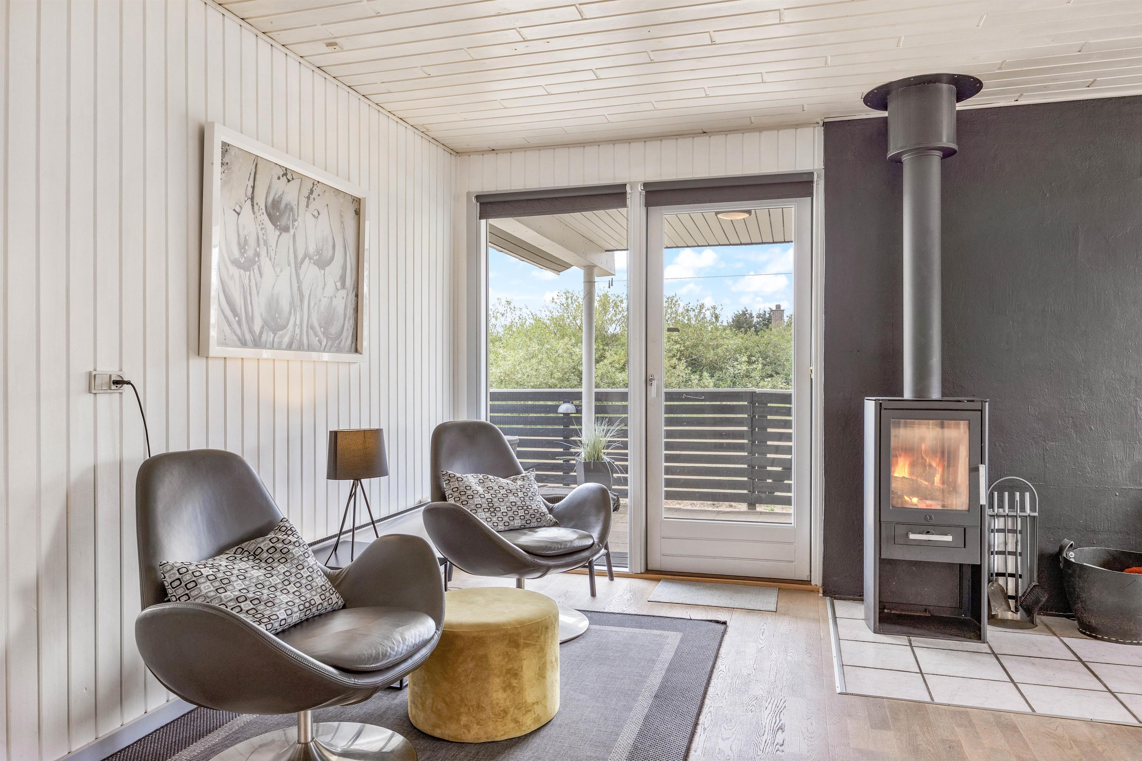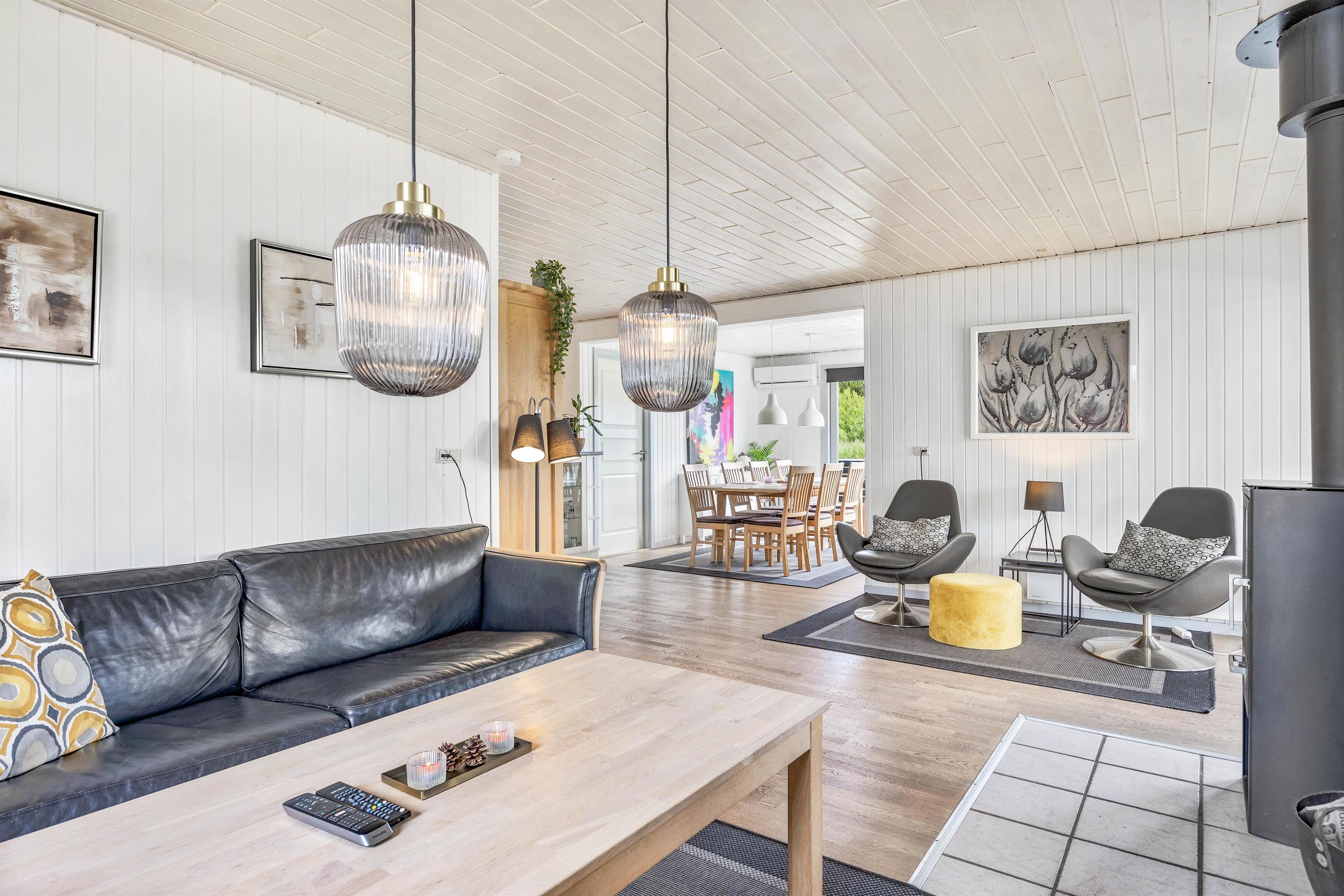 I opholdsrummets sofahjørne er der plads til afslapning. Her kan I smække fødderne op med en god bog i hånden eller streame en spændende film på Smart-tv’et over husets lynhurtige 100/100 Mbit Fiberinternet. Og med den lune brændeovn knitrende i baggrunden er feriestemningen for alvor sikret.