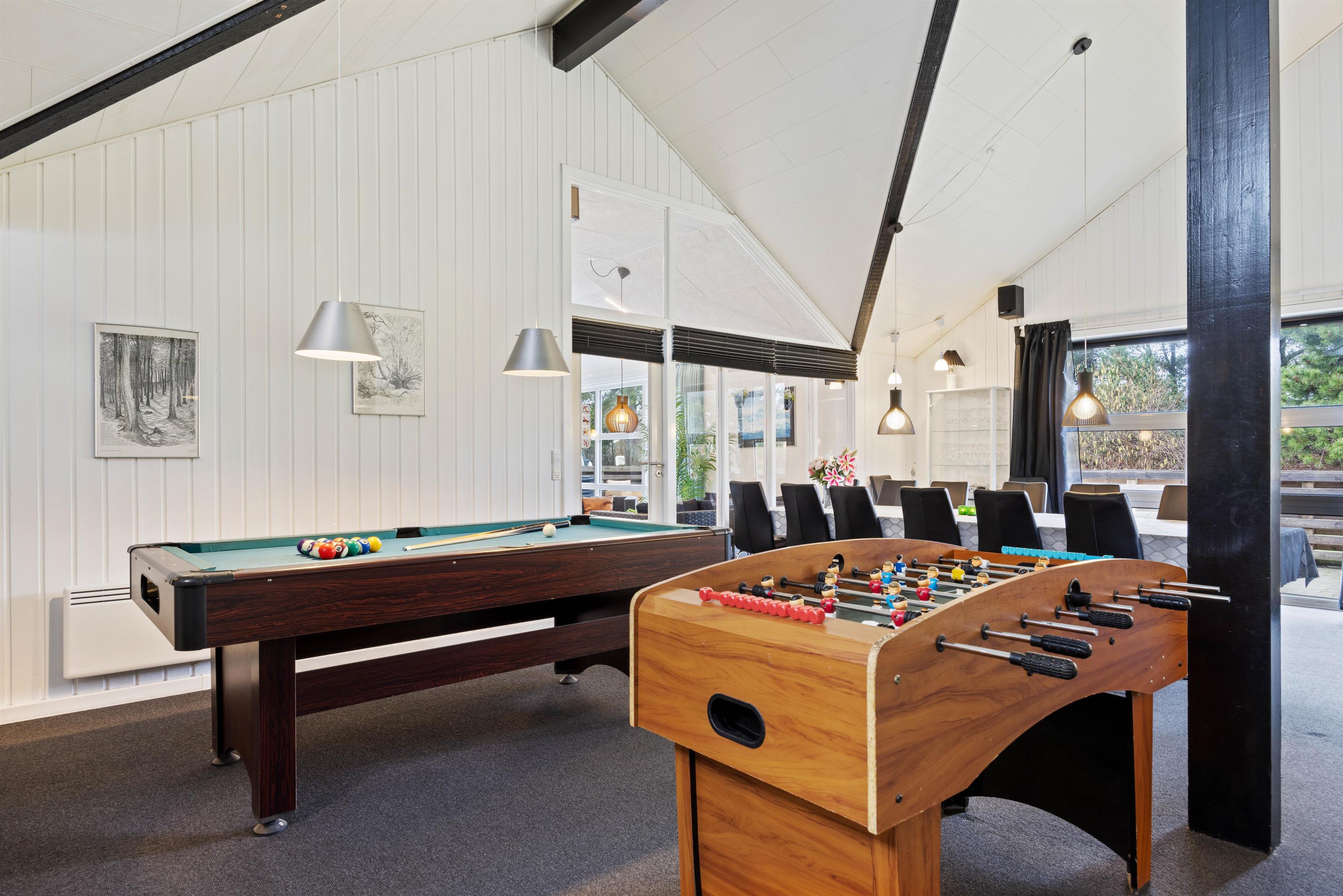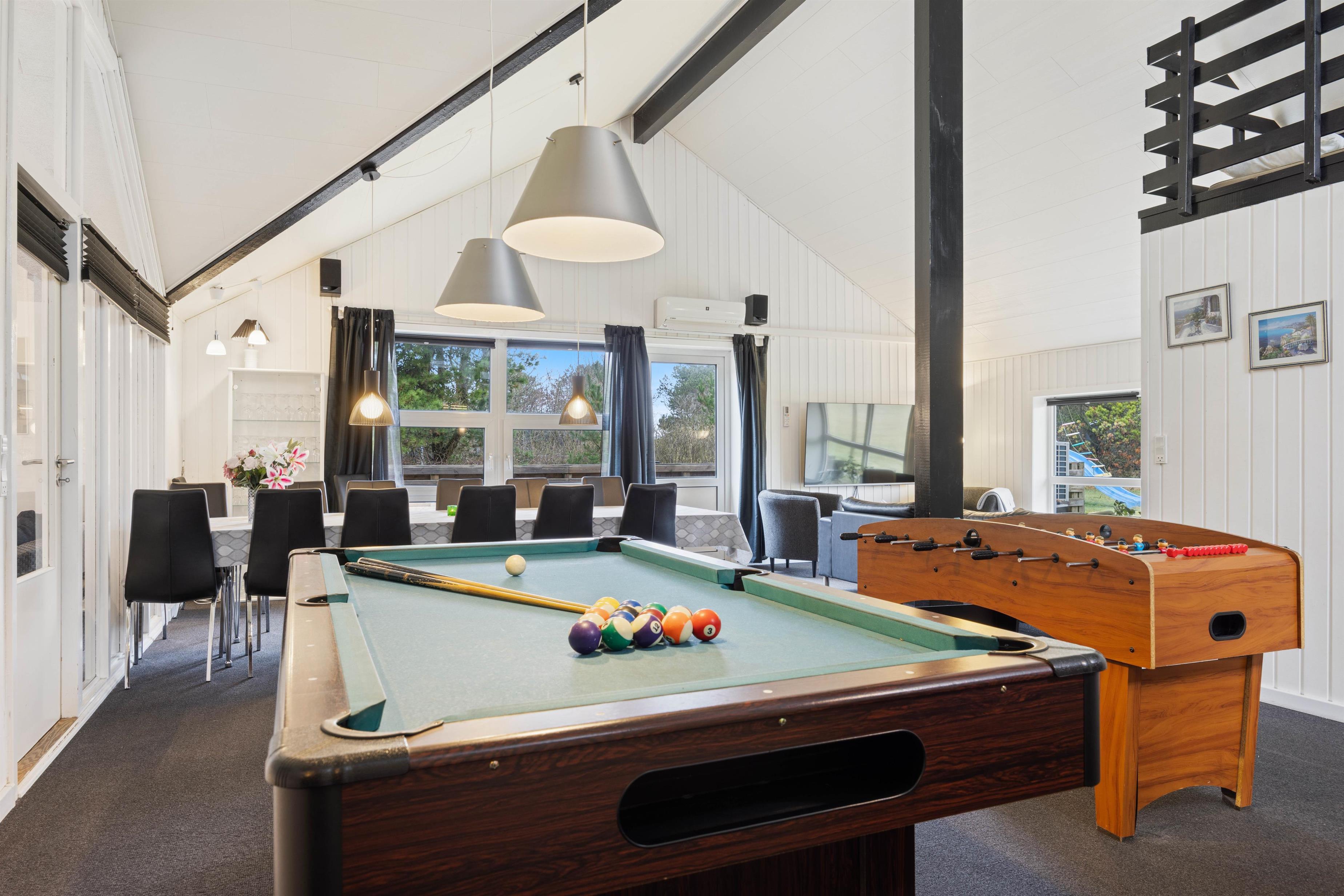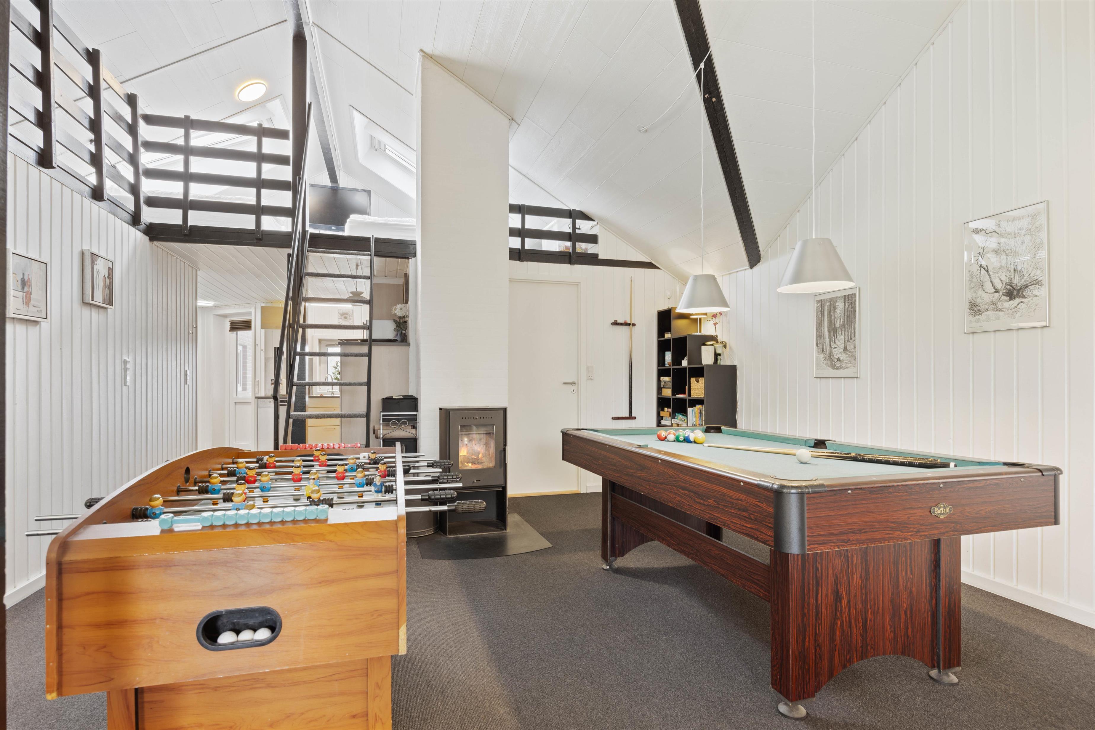 Når I træder ind i feriehuset, bliver I mødt af det store opholdsrum, som forbinder køkken, stue, spiseplads og aktivitetsrum. Her kan I lave mad sammen, planlægge jeres næste ferieaktiviteter eller se en film sammen. På regnvejrsdage byder feriehuset på masser af aktiviteter med et poolbord og et bordfodboldbord, så der er ingen chance for kedsomhed. Du kan krone billardmesteren, mens brændeovnen i baggrunden sørger for hyggelig varme og den typiske sommerhusstemning. Der er også installeret en energibesparende luft-til-luft varmepumpe, som spreder en behagelig varme i hele feriehuset.