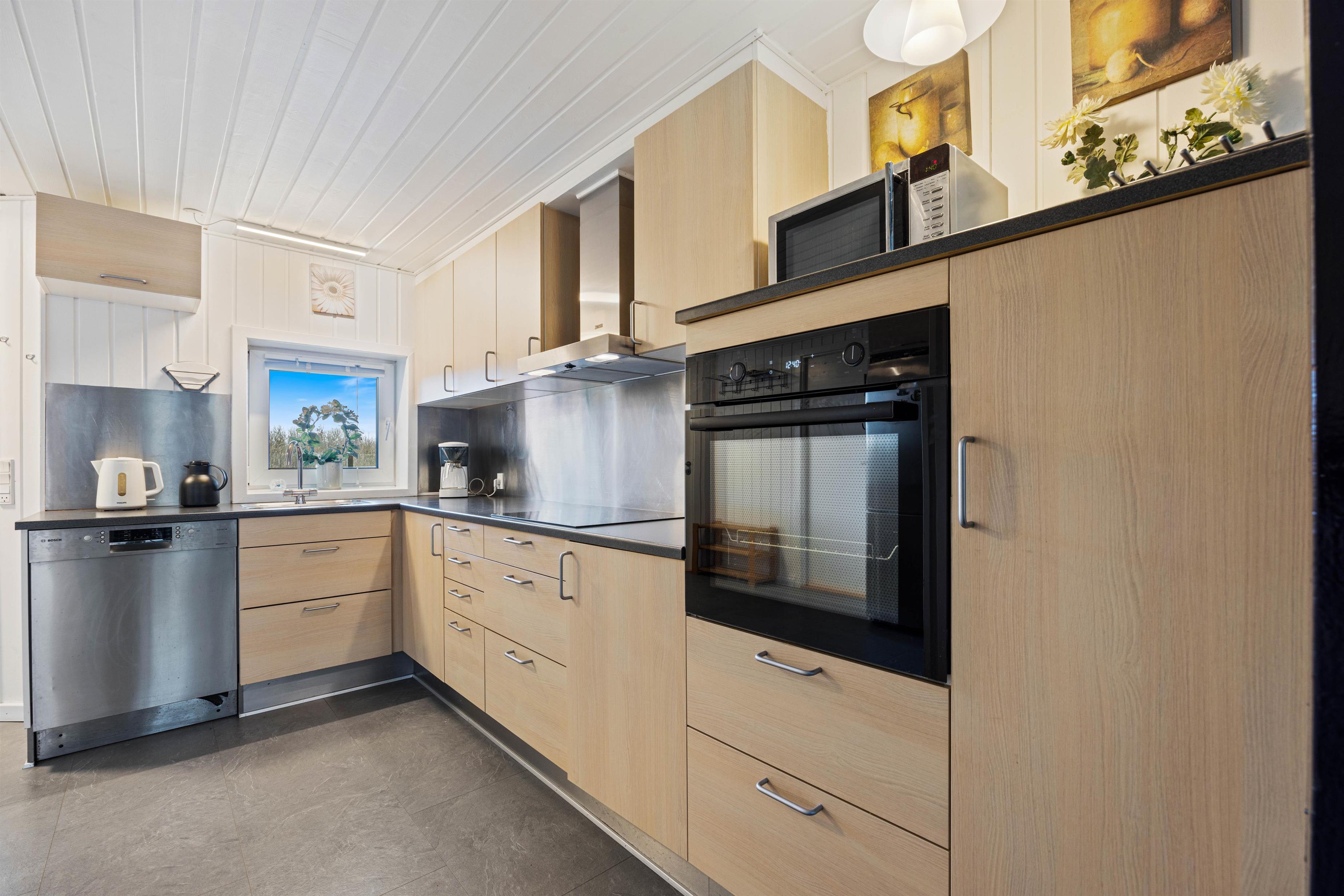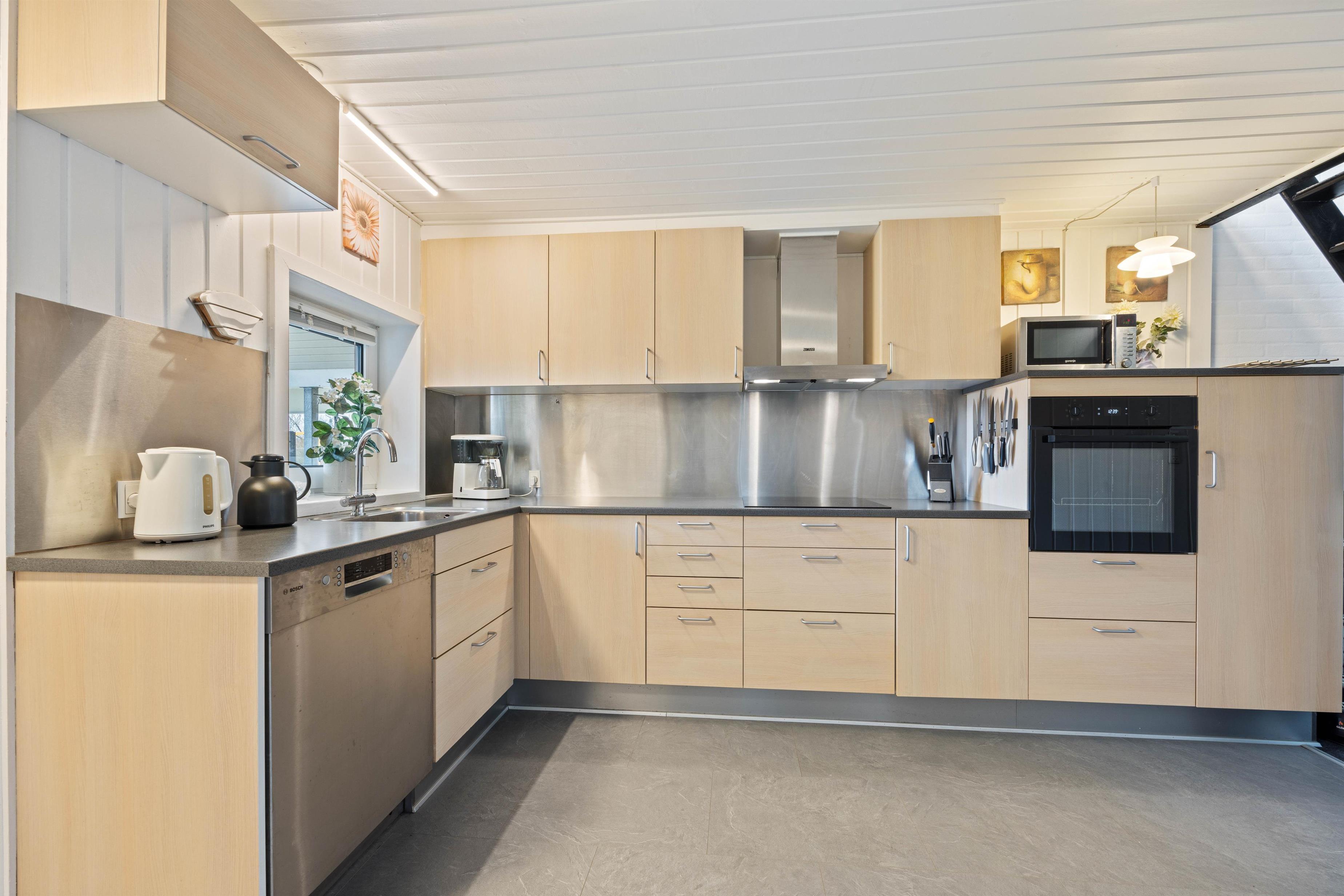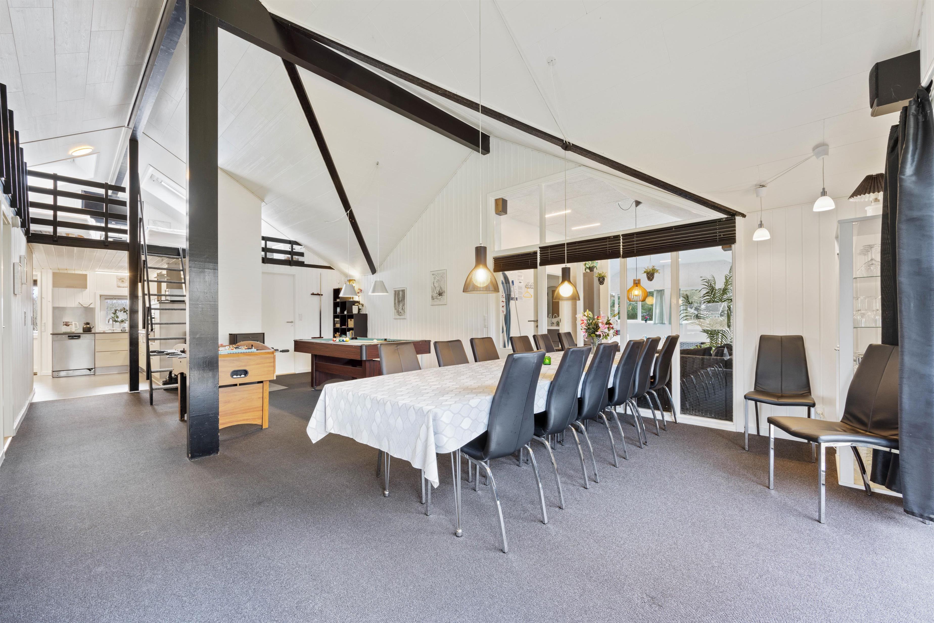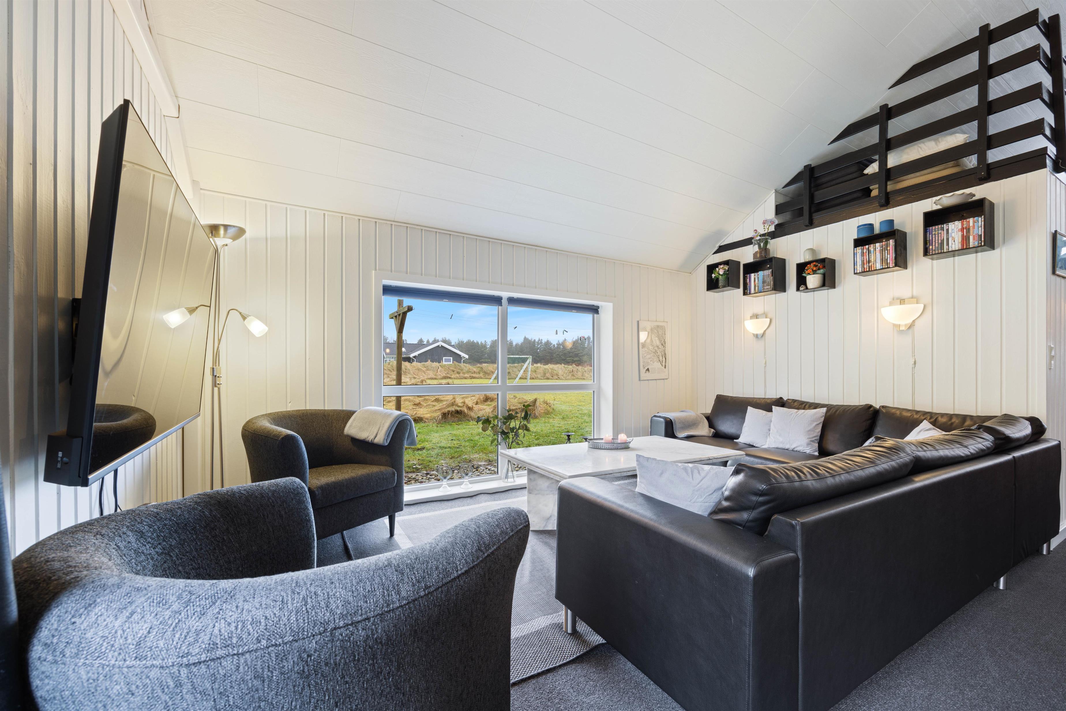 Når I træder ind i feriehuset, bliver I mødt af det store opholdsrum, som forbinder køkken, stue, spiseplads og aktivitetsrum. Her kan I lave mad sammen, planlægge jeres næste ferieaktiviteter eller se en film sammen. På regnvejrsdage byder feriehuset på masser af aktiviteter med et poolbord og et bordfodboldbord, så der er ingen chance for kedsomhed. Du kan krone billardmesteren, mens brændeovnen i baggrunden sørger for hyggelig varme og den typiske sommerhusstemning. Der er også installeret en energibesparende luft-til-luft varmepumpe, som spreder en behagelig varme i hele feriehuset.