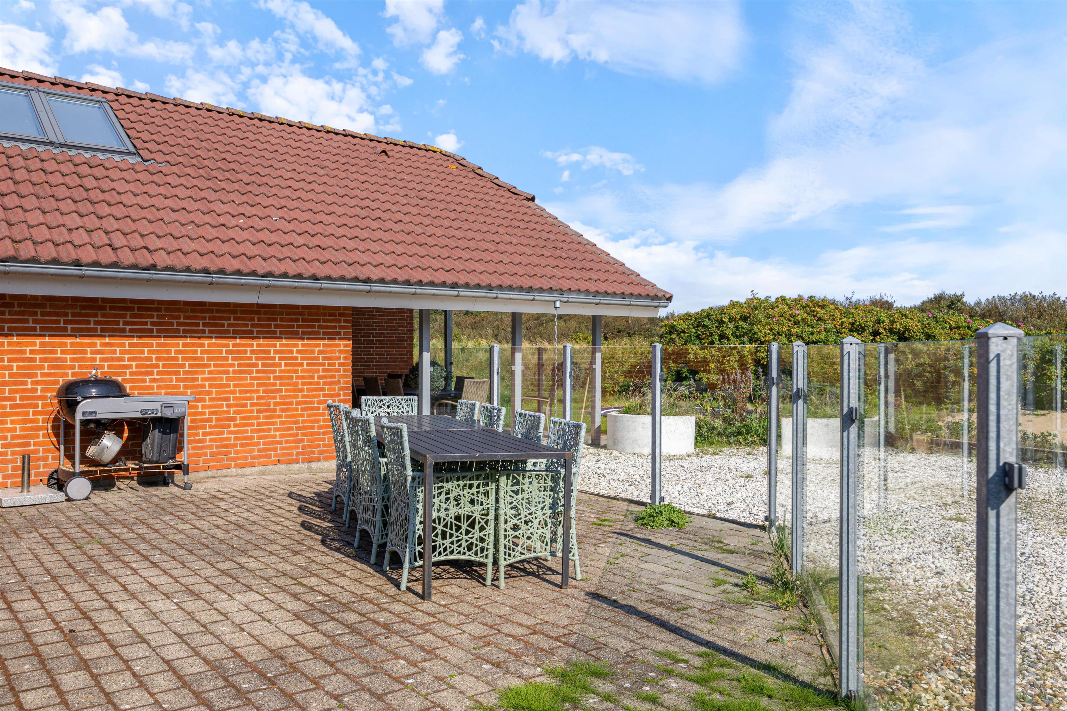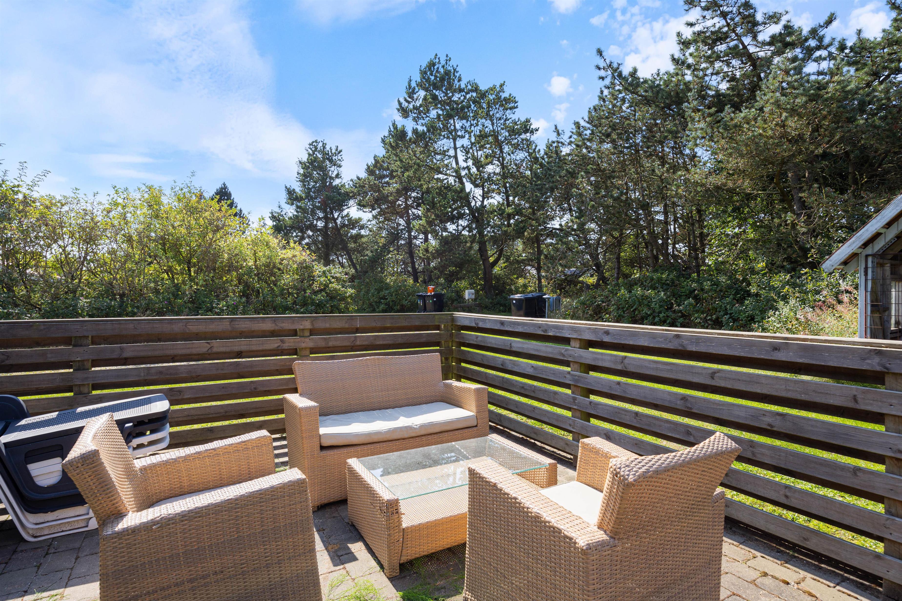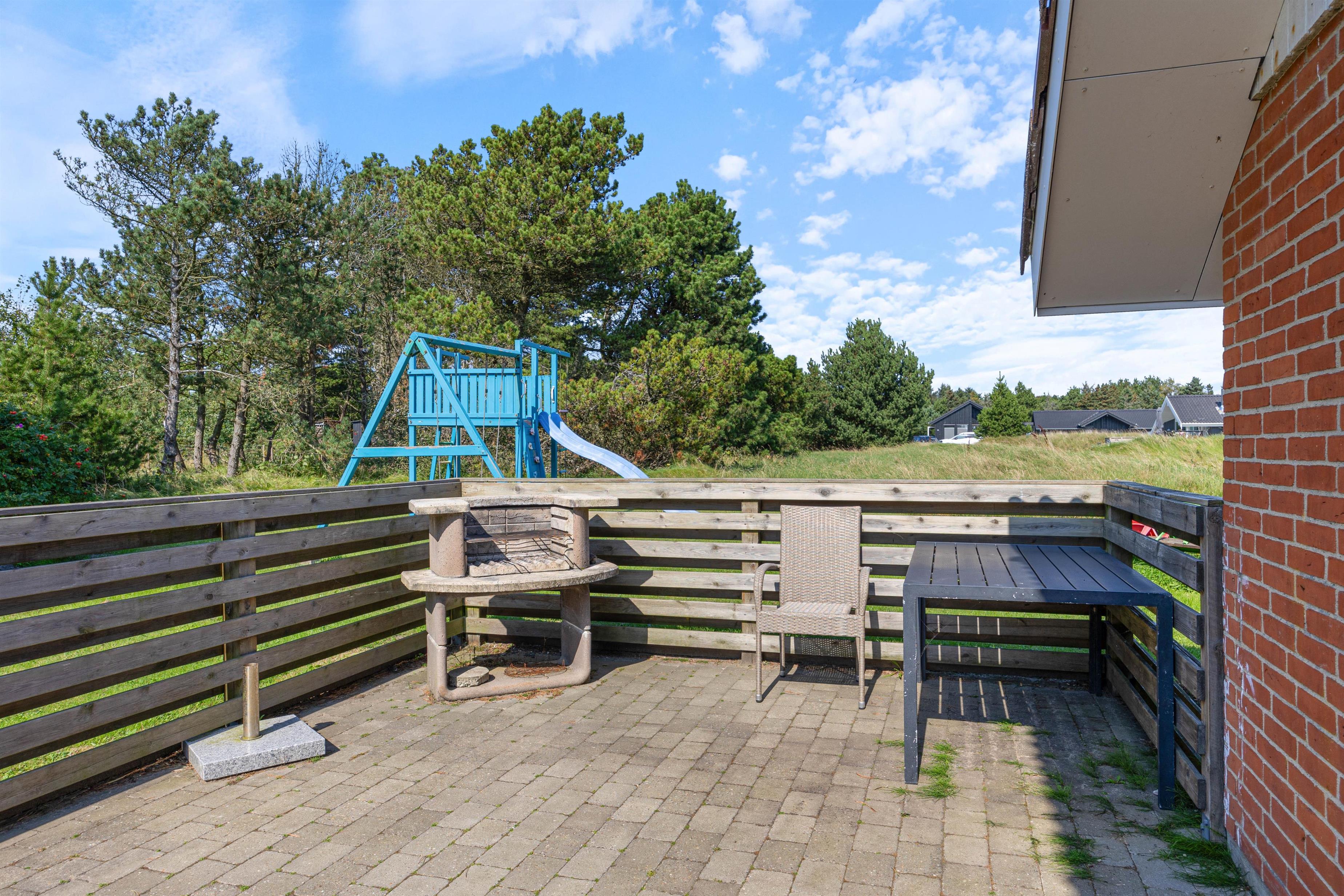 Fra køkkenet er der adgang til den overdækkede terrasse, som er delvist afskærmet. Her kan alle finde deres yndlingsplads, selv hvis det regner. Mens I sætter jer til rette i havemøblerne, kan børnene boltre sig på gyngen eller bygge fantastiske sandslotte i sandkassen. Om aftenen kan I runde en dejlig feriedag af med en lækker grillaften.
